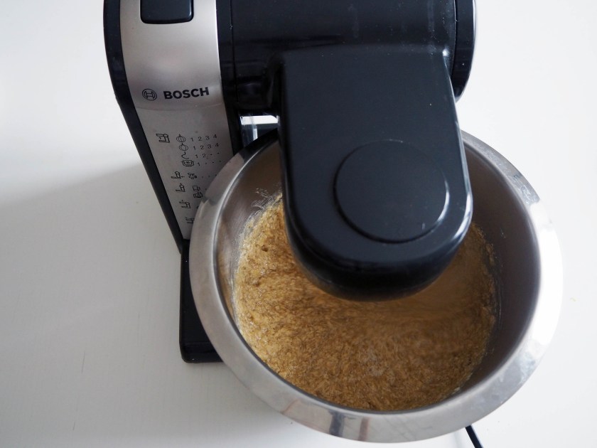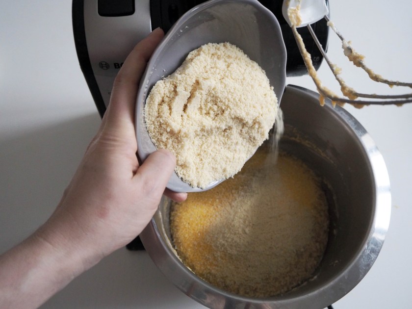 5. Add polenta, almond flour and baking powder and continue to beat until you get a smooth batter.