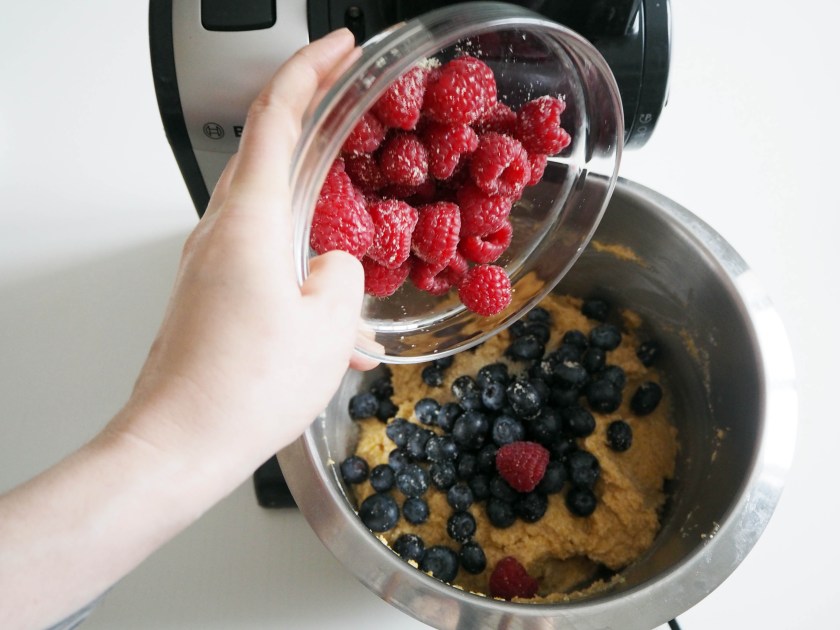 6. Fold in blueberries and raspberries gently – try not to break down the berries.