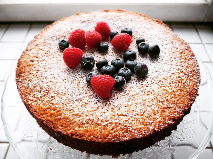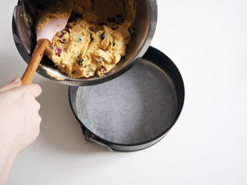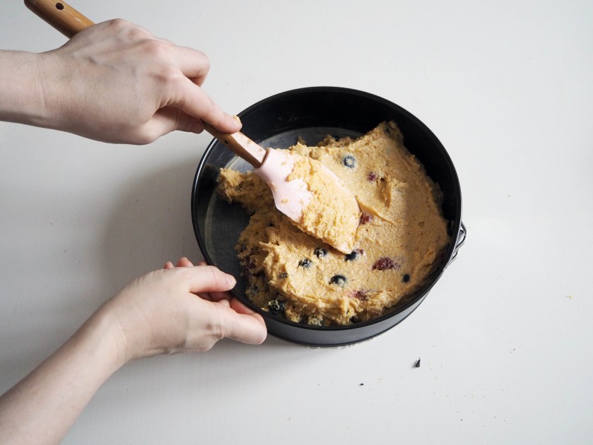 So this recipe is kind of a celebration of two berries that can be found in Finland. The freshness and moisture of the berries make this cake very light and sweet but not too sweet. And polenta adds a very nice, gritty texture as always. Even though in theory it can be made with frozen berries as well, I do not recommend that. The batter is slightly thick and when you try to fold in frozen berries in the batter, I think you would colour the batter a lot. Therefore fresh berries are much better. However, if colouring the cake batter is ok for you, then go ahead, use frozen berries! And enjoy your cake!