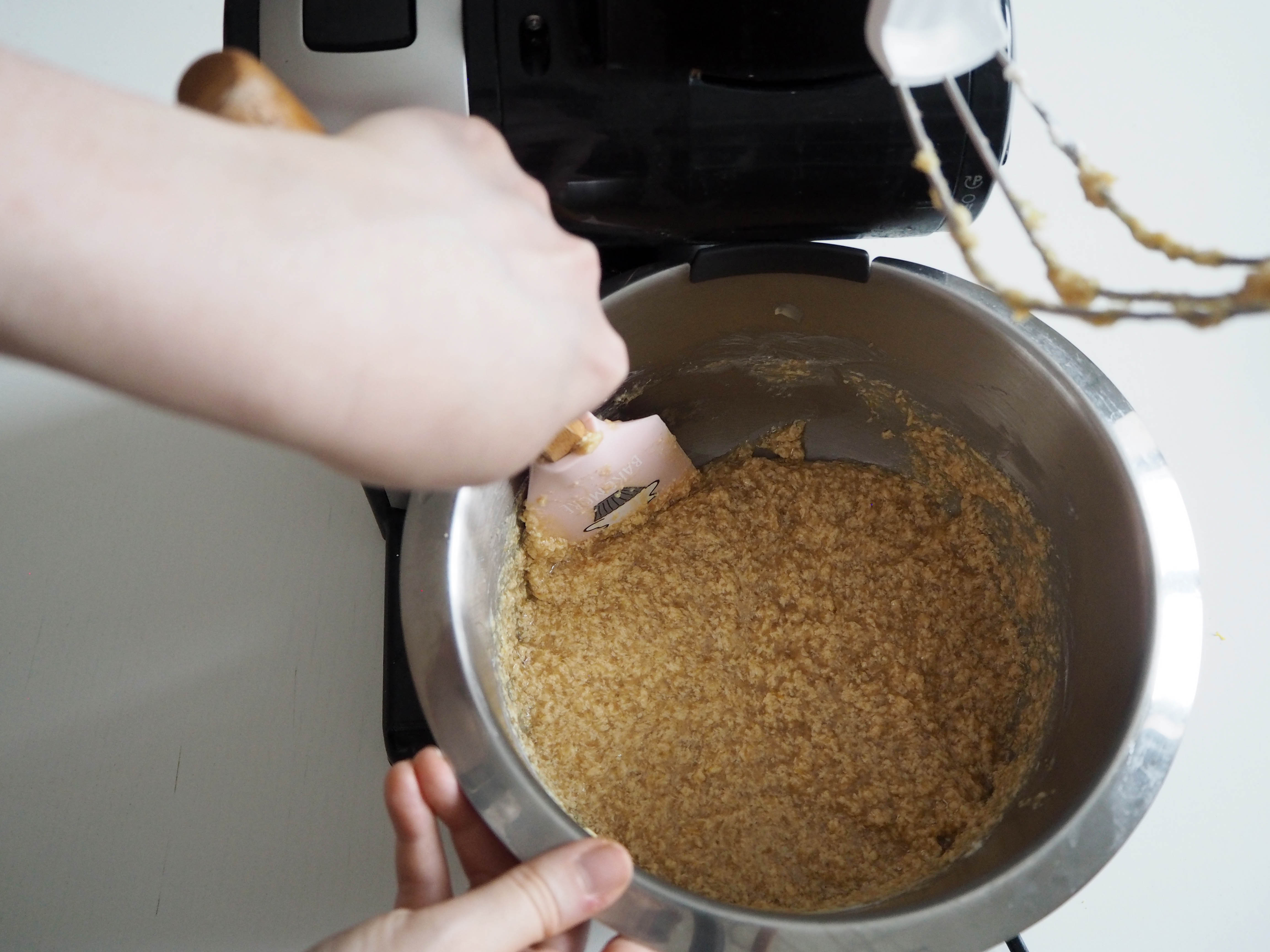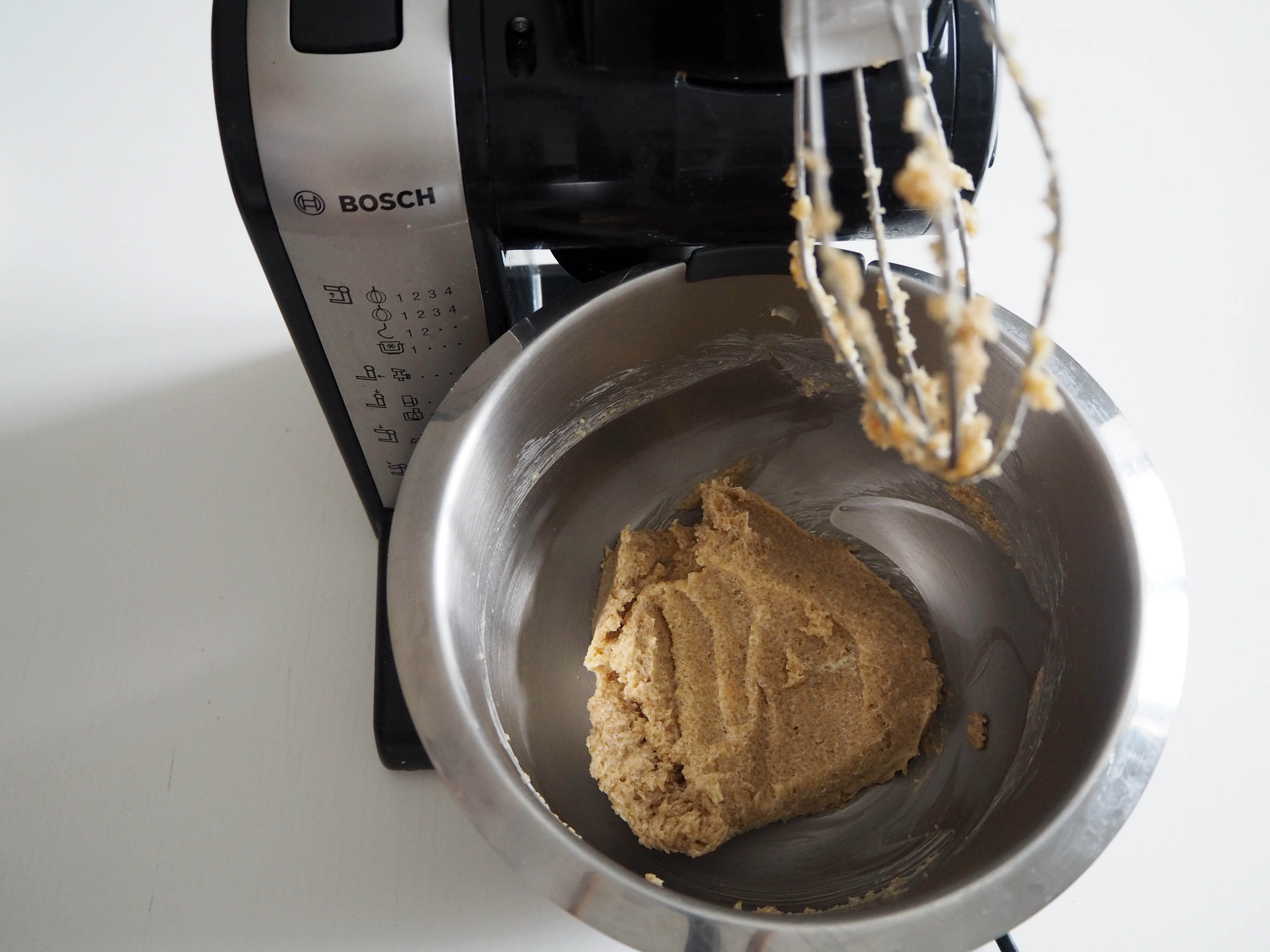 4. Add eggs, one at a time. In between each egg you might want to scrape the sides of the bowl with a spatula. Beat in the eggs until you get a smooth mixture.