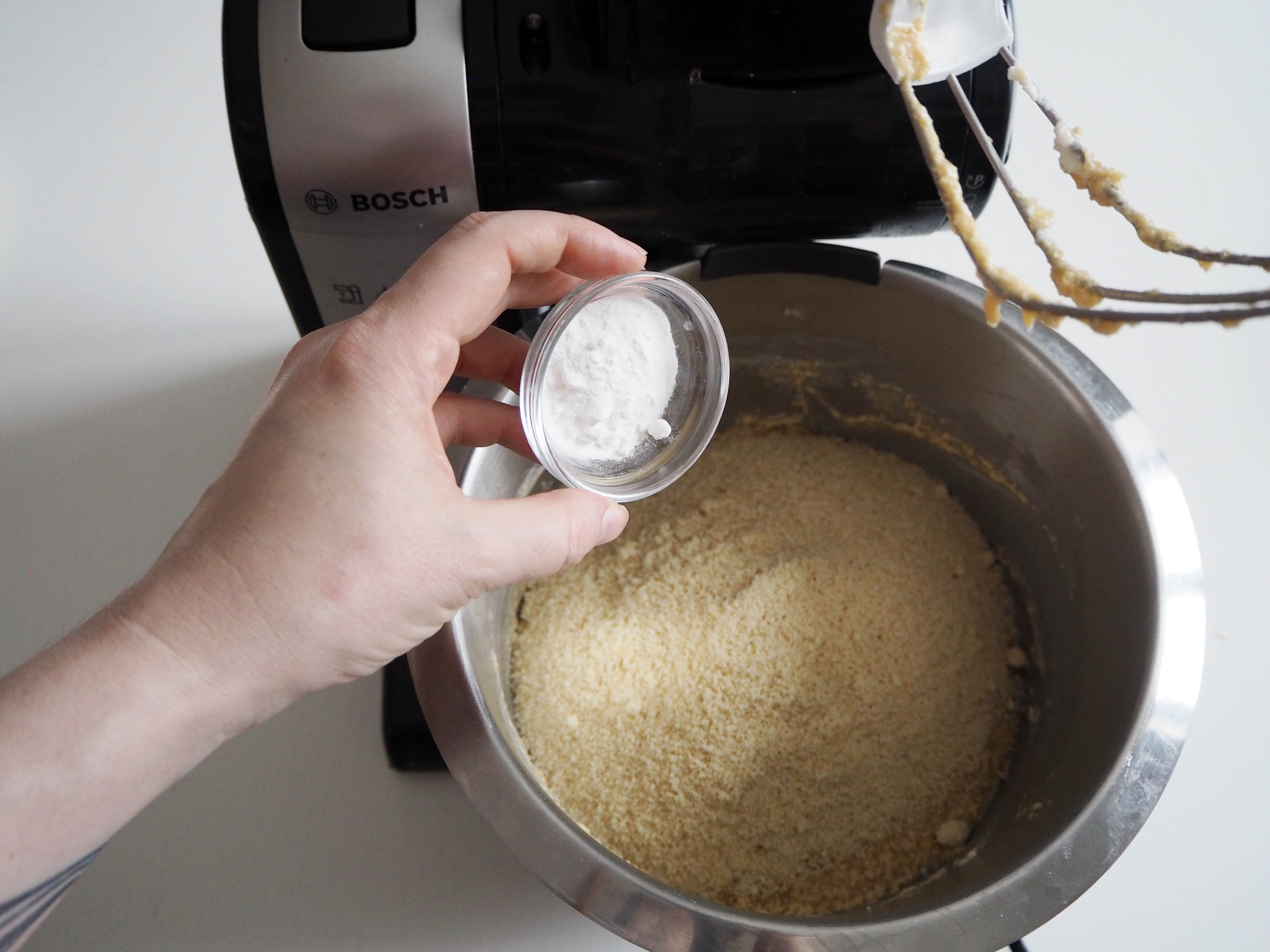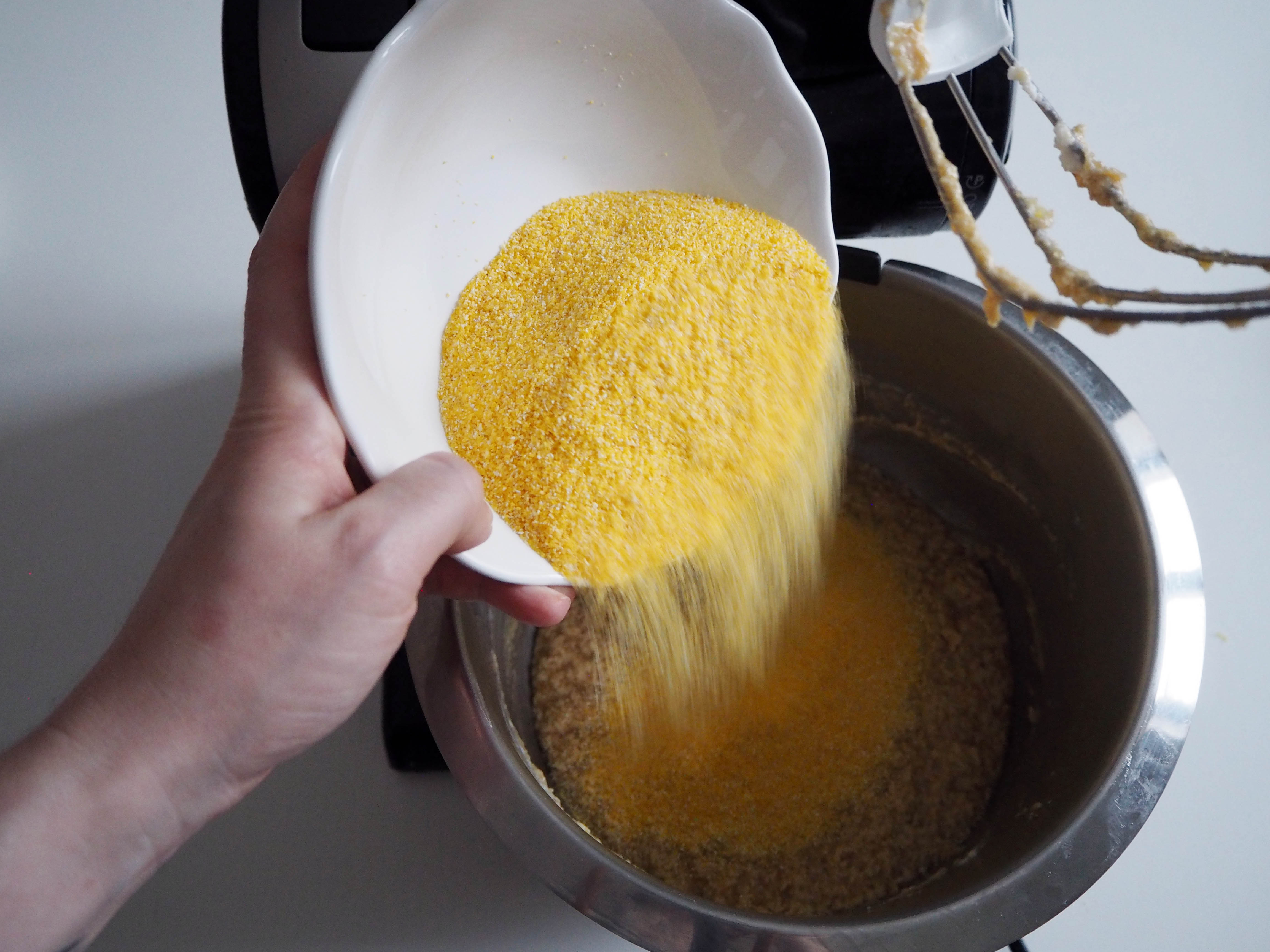5. Add polenta, almond flour and baking powder and continue to beat until you get a smooth batter.