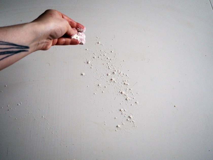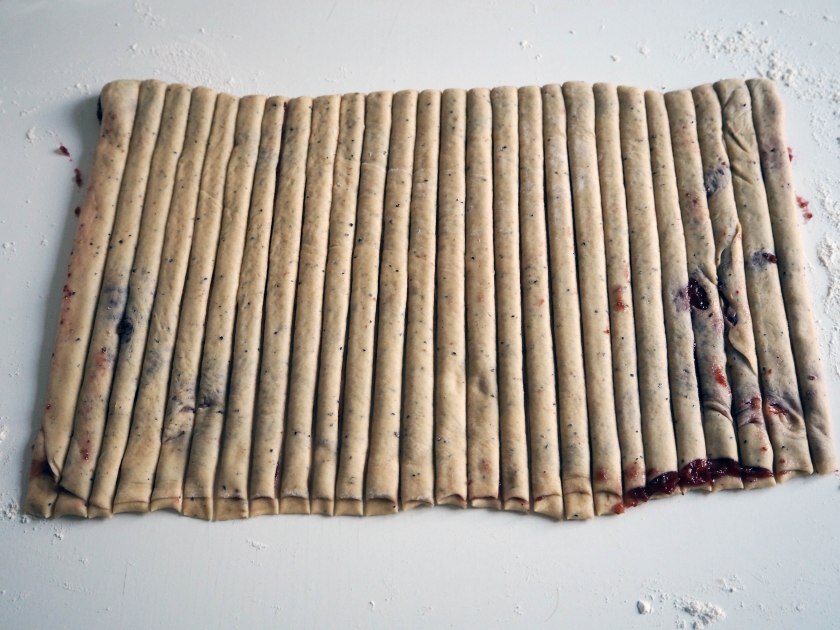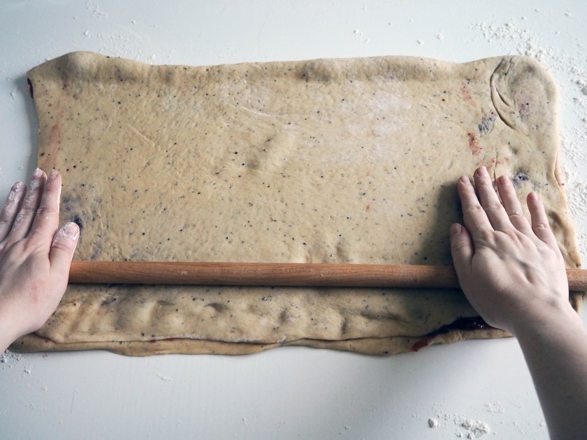 10. Spread raspberry marmalade on the dough and cover the whole surface. Fold the dough from the shorter edge and roll a little bit more after that, around 30x50cm (but don’t get too stuck in exact size. At this point, it is important to keep the dough strong and not tear it apart much so that the jam is not exposed much – otherwise it gets way too messy..).