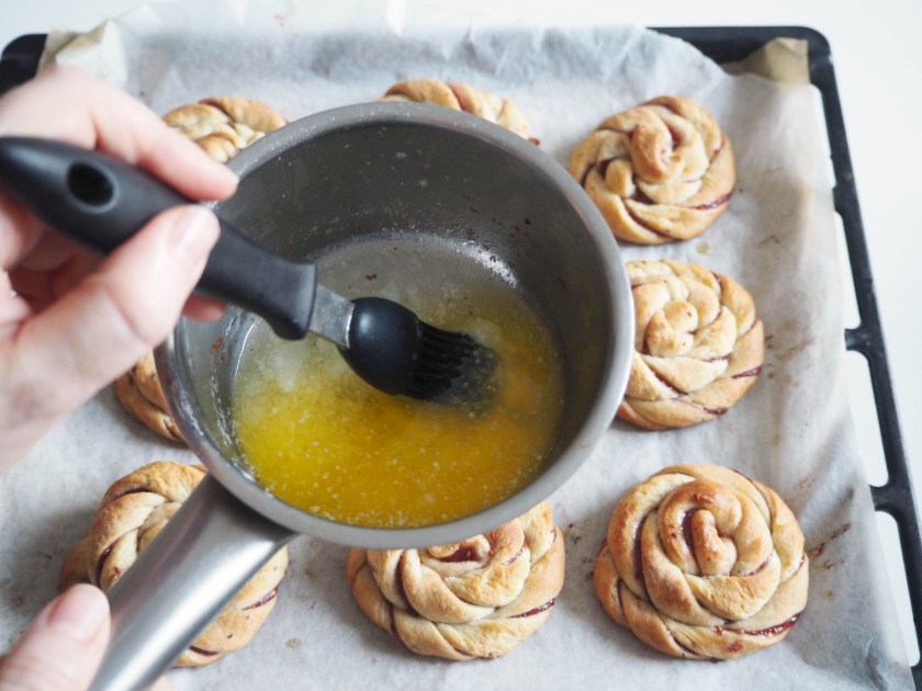 The result was just as I expected. There is a sweetness that comes from the dough and also from the marmalade itself, but since raspberry marmalade is also slightly sour, this transfers to the buns too. Then there is also a buttery taste from dough and from melted butter brush I did before and after baking, and there is a hint of cardamom in the dough.