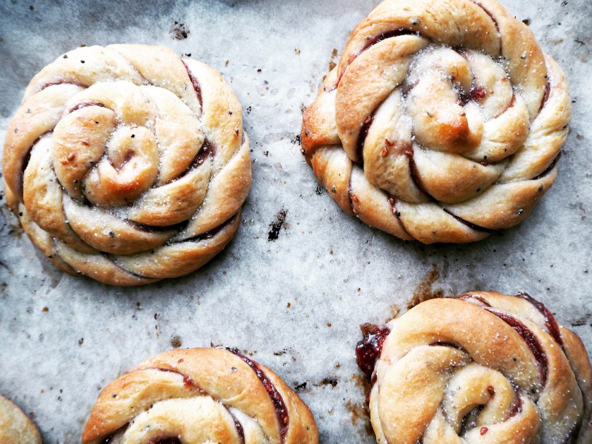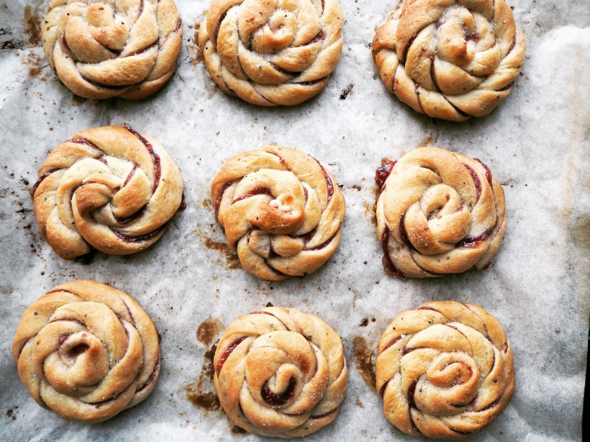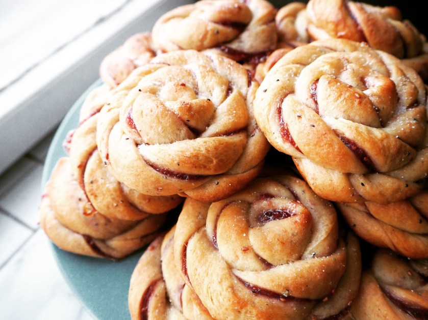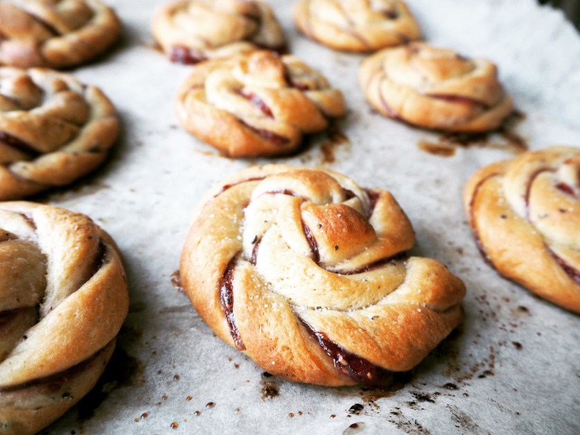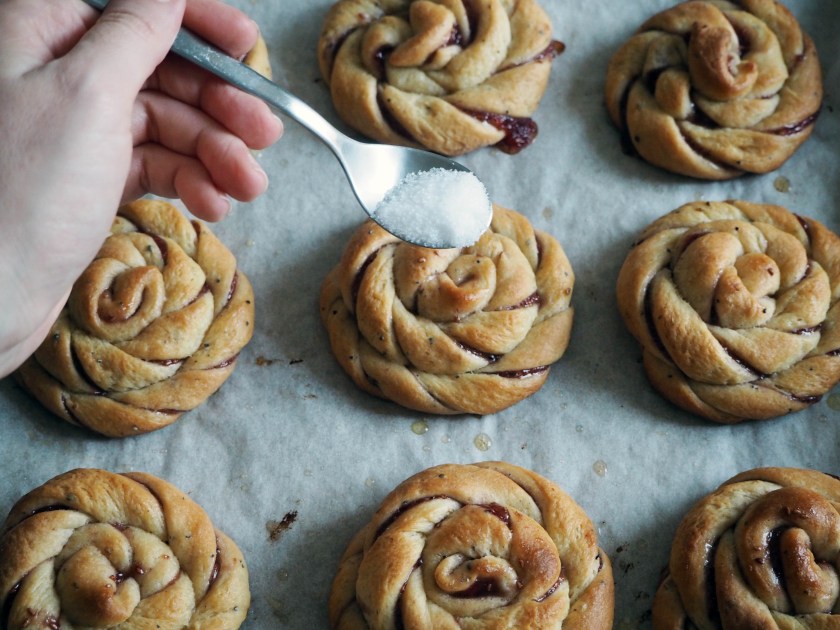 I have been planning to make these buns for almost 3 months. I made poppy paste buns before with this shape (recipe is here) and I loved it (this is generally Swedish cardamom bun’s shape). So I wanted to try something different this time, using the same shape.