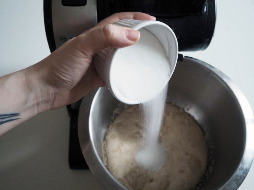 3. Add sugar, salt, cardamom and butter and using dough hook, mix as good as you can.
