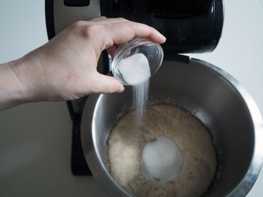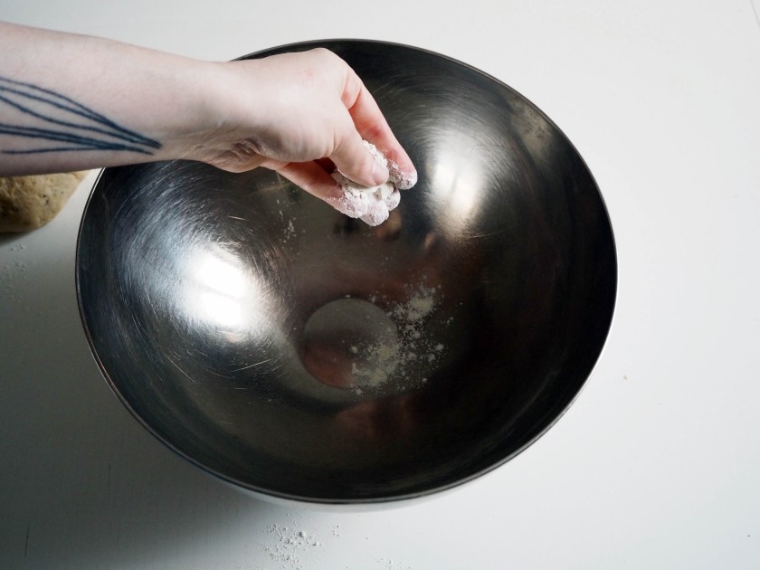 5. Add flour and continue mixing / kneading. When the dough starts to get clean from the sides of the bowl, it is ready.