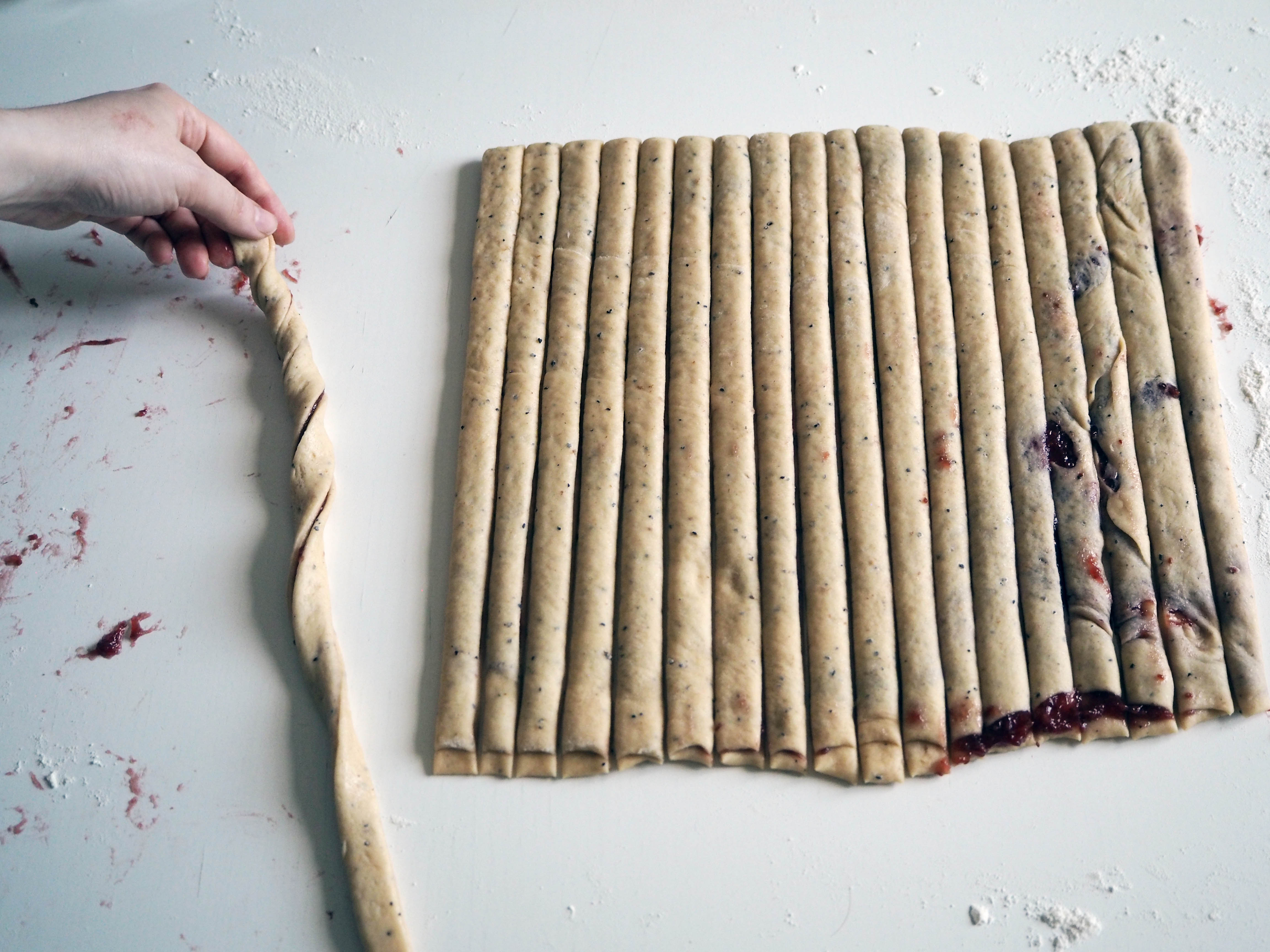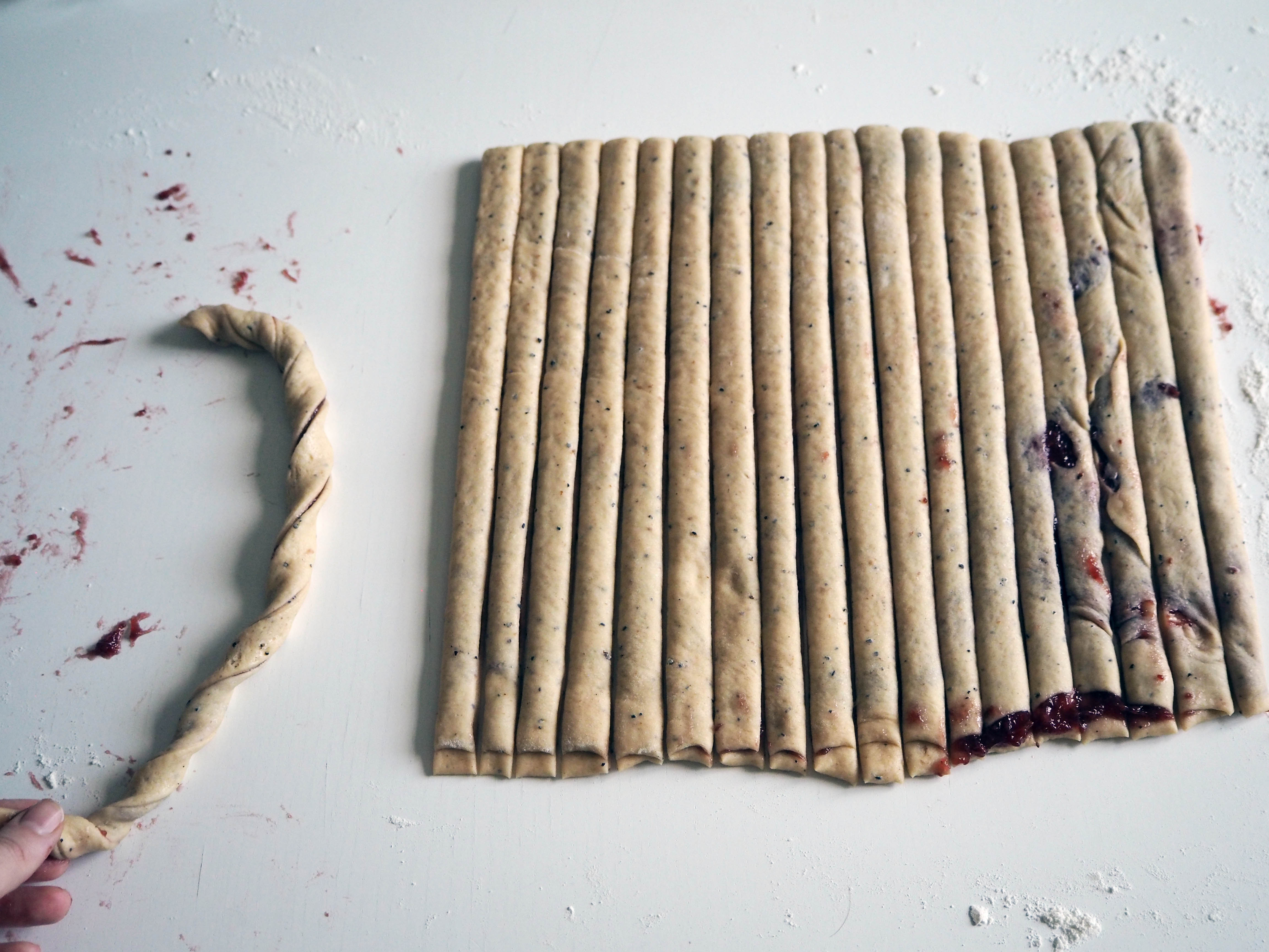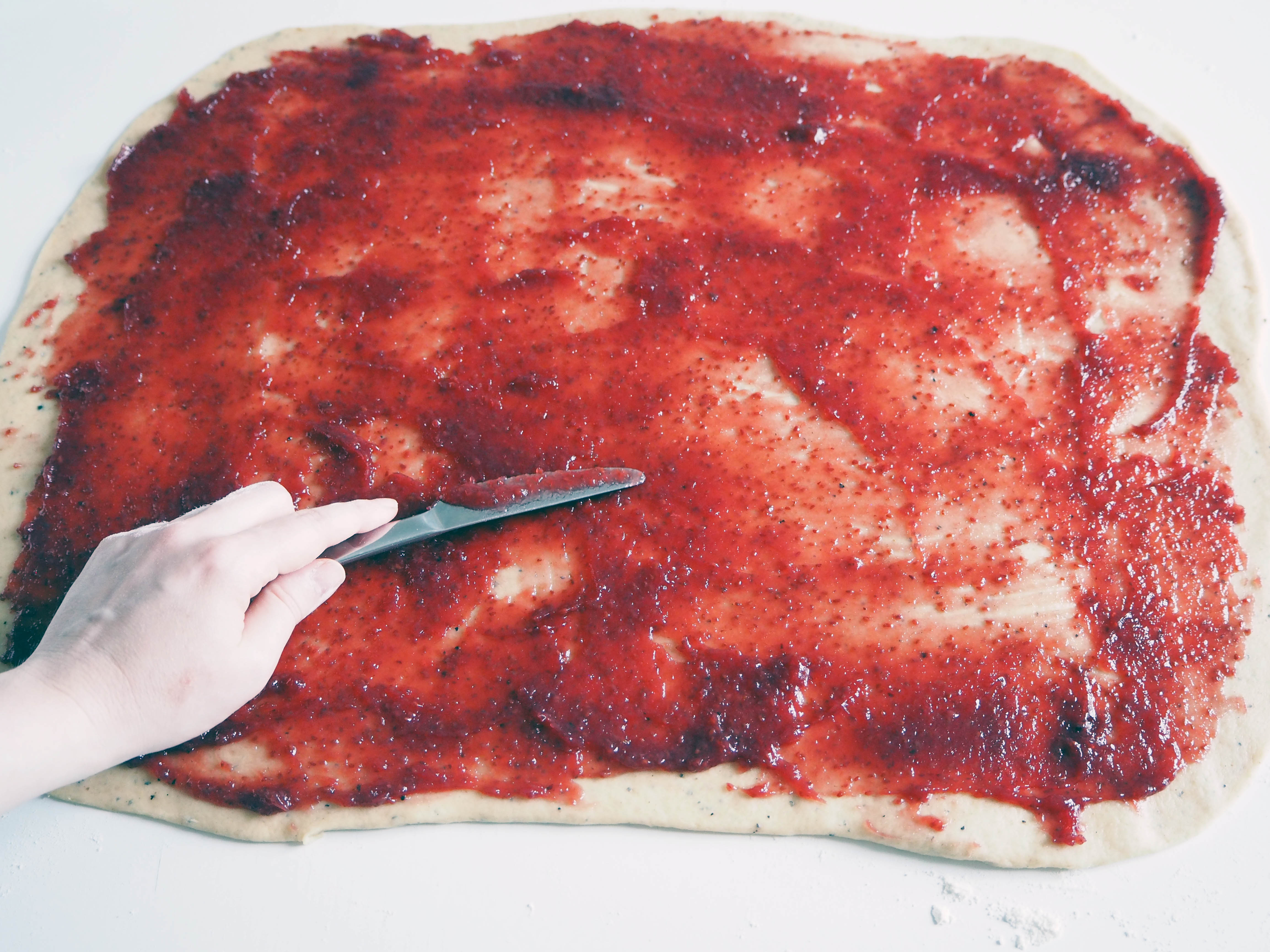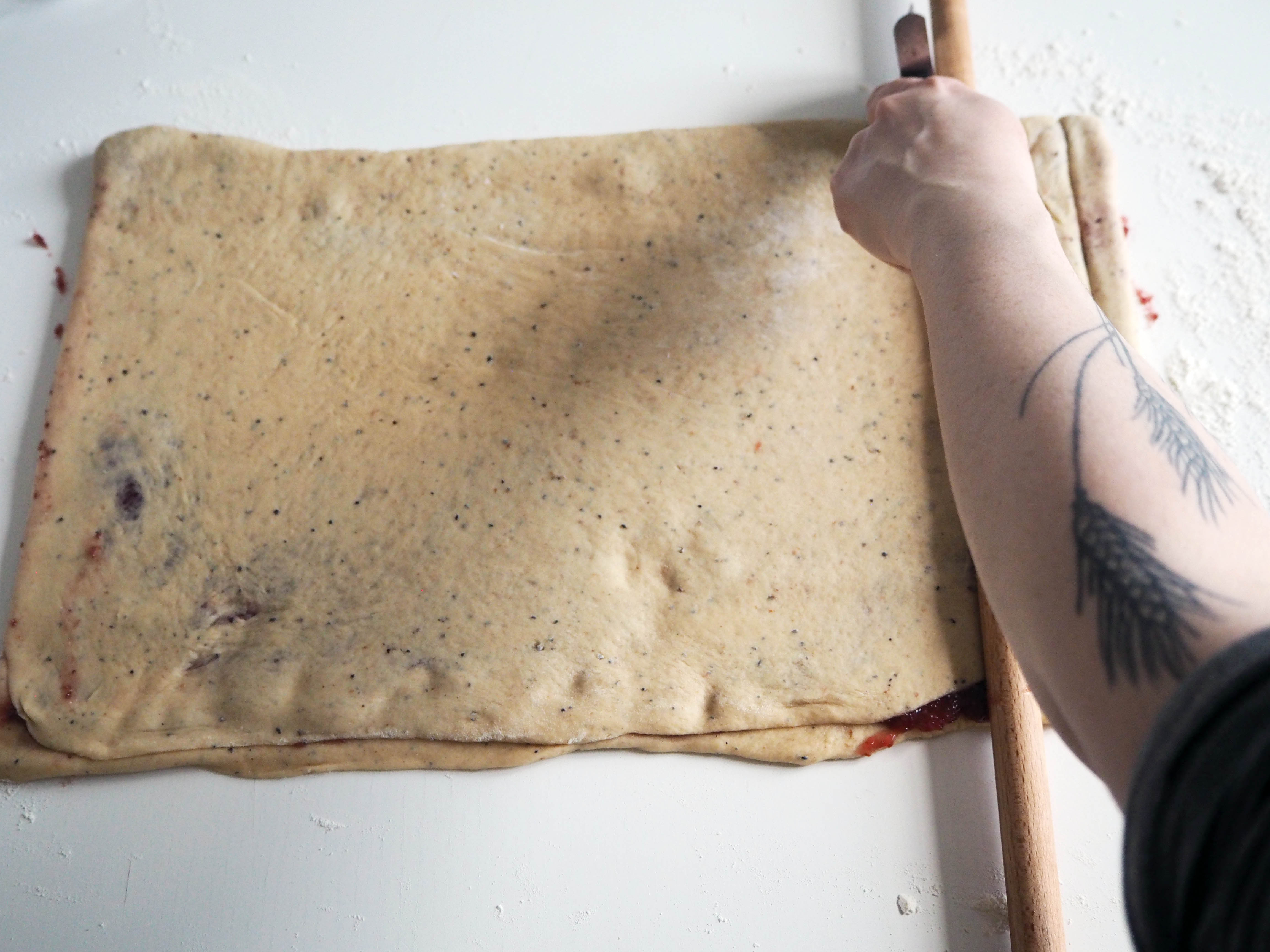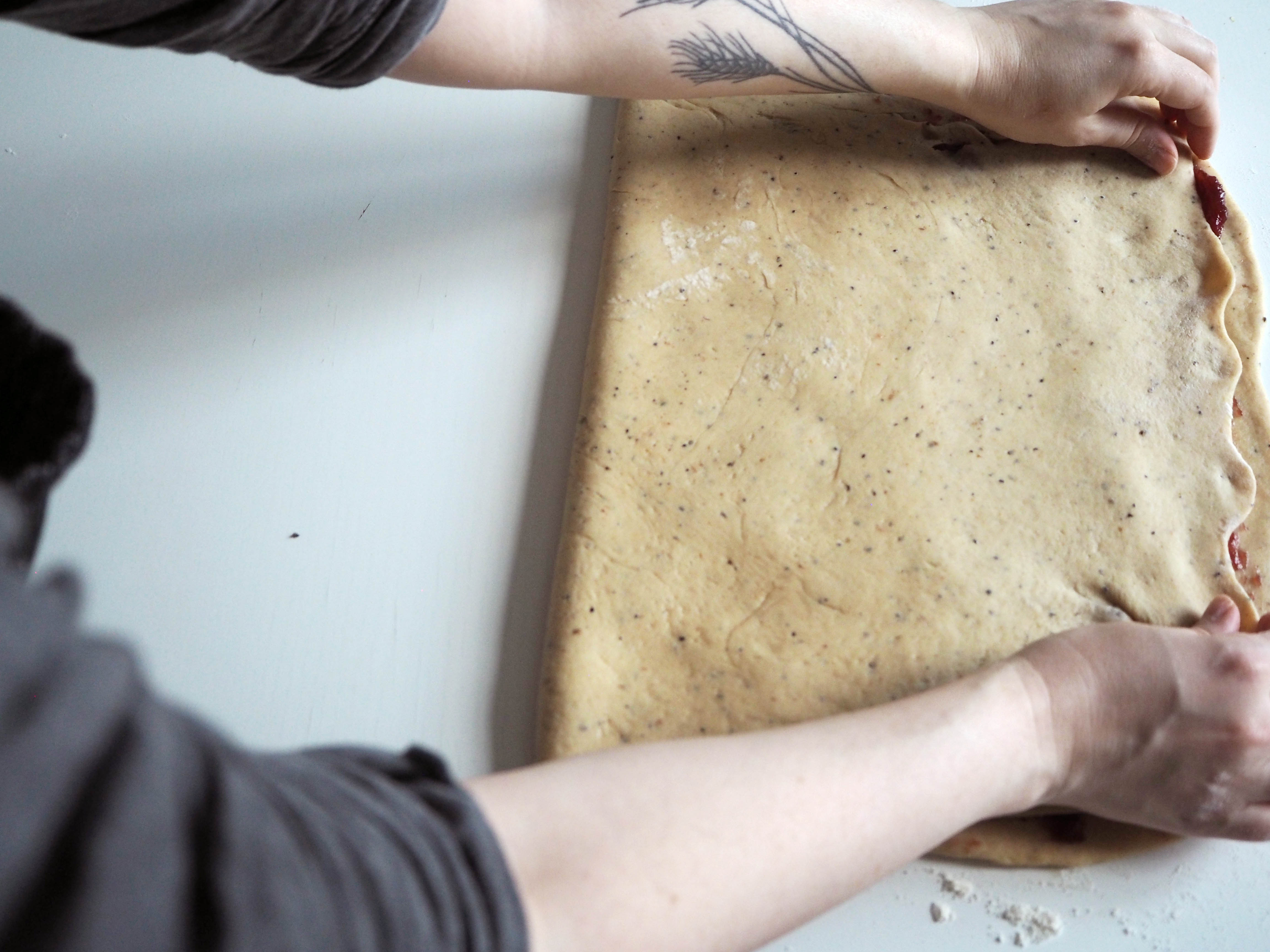 10. Spread raspberry marmalade on the dough and cover the whole surface. Fold the dough from the shorter edge and roll a little bit more after that, around 30x50cm (but don’t get too stuck in exact size. At this point, it is important to keep the dough strong and not tear it apart much so that the jam is not exposed much – otherwise it gets way too messy..).