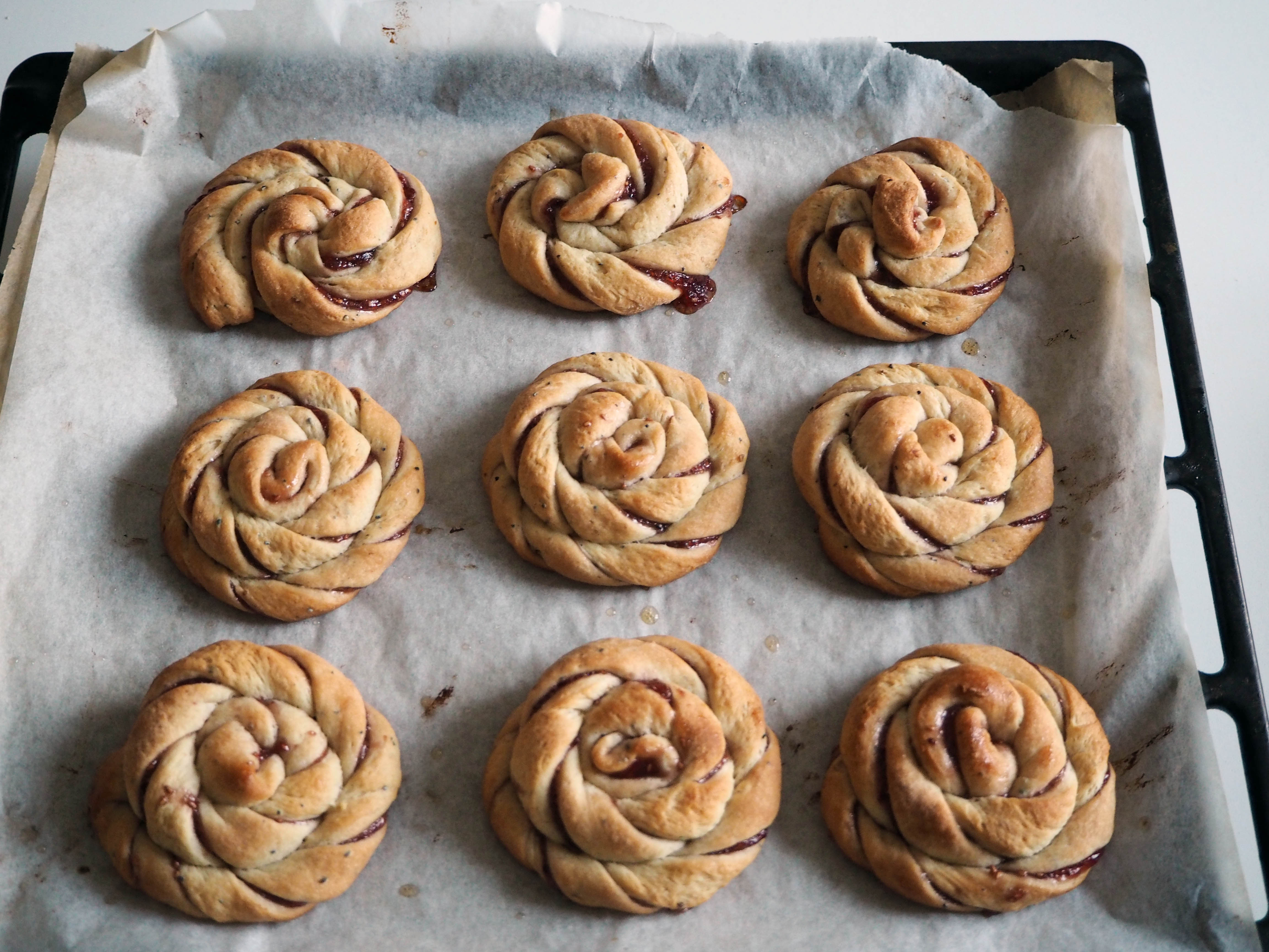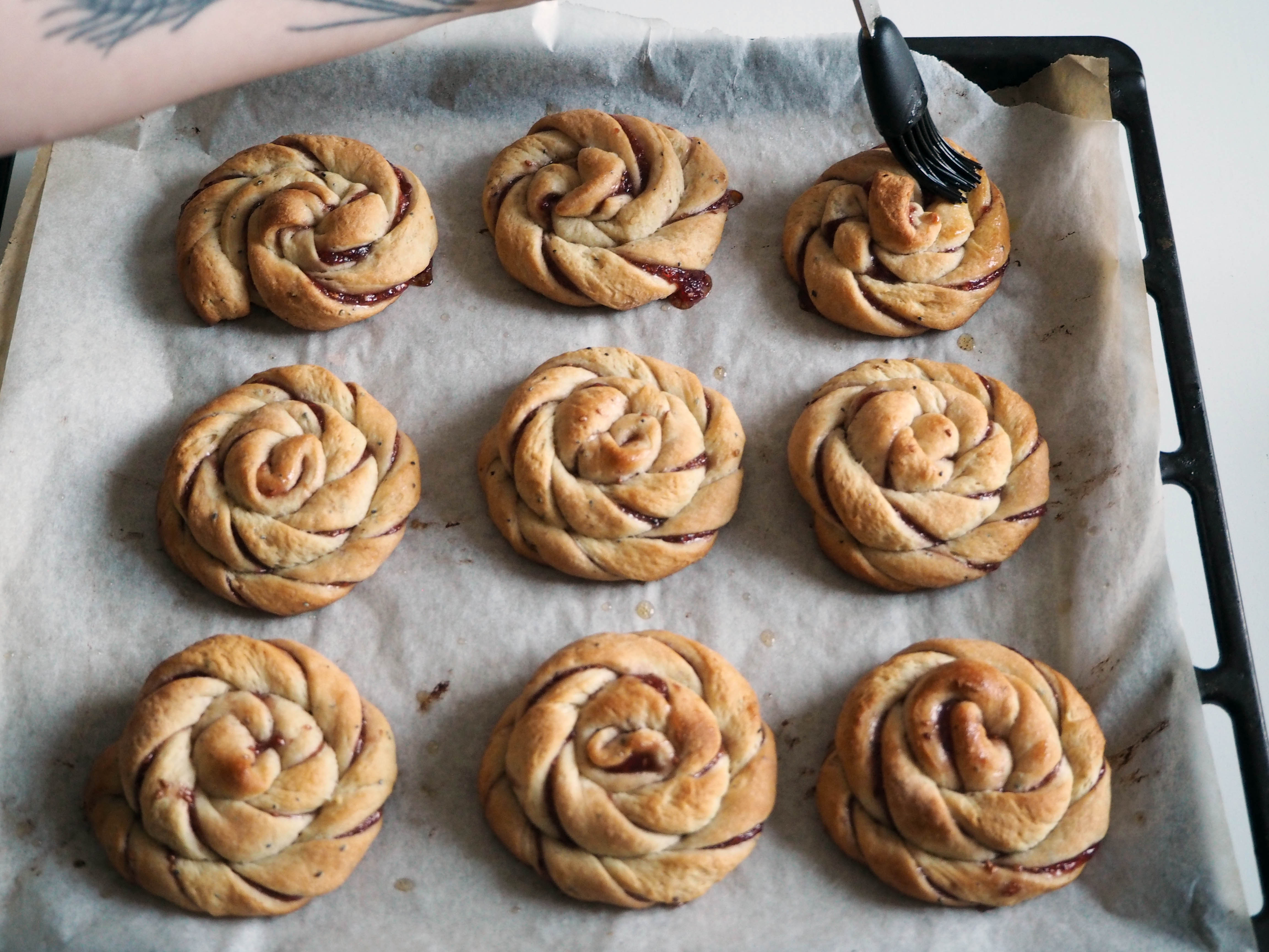 The result was just as I expected. There is a sweetness that comes from the dough and also from the marmalade itself, but since raspberry marmalade is also slightly sour, this transfers to the buns too. Then there is also a buttery taste from dough and from melted butter brush I did before and after baking, and there is a hint of cardamom in the dough.
