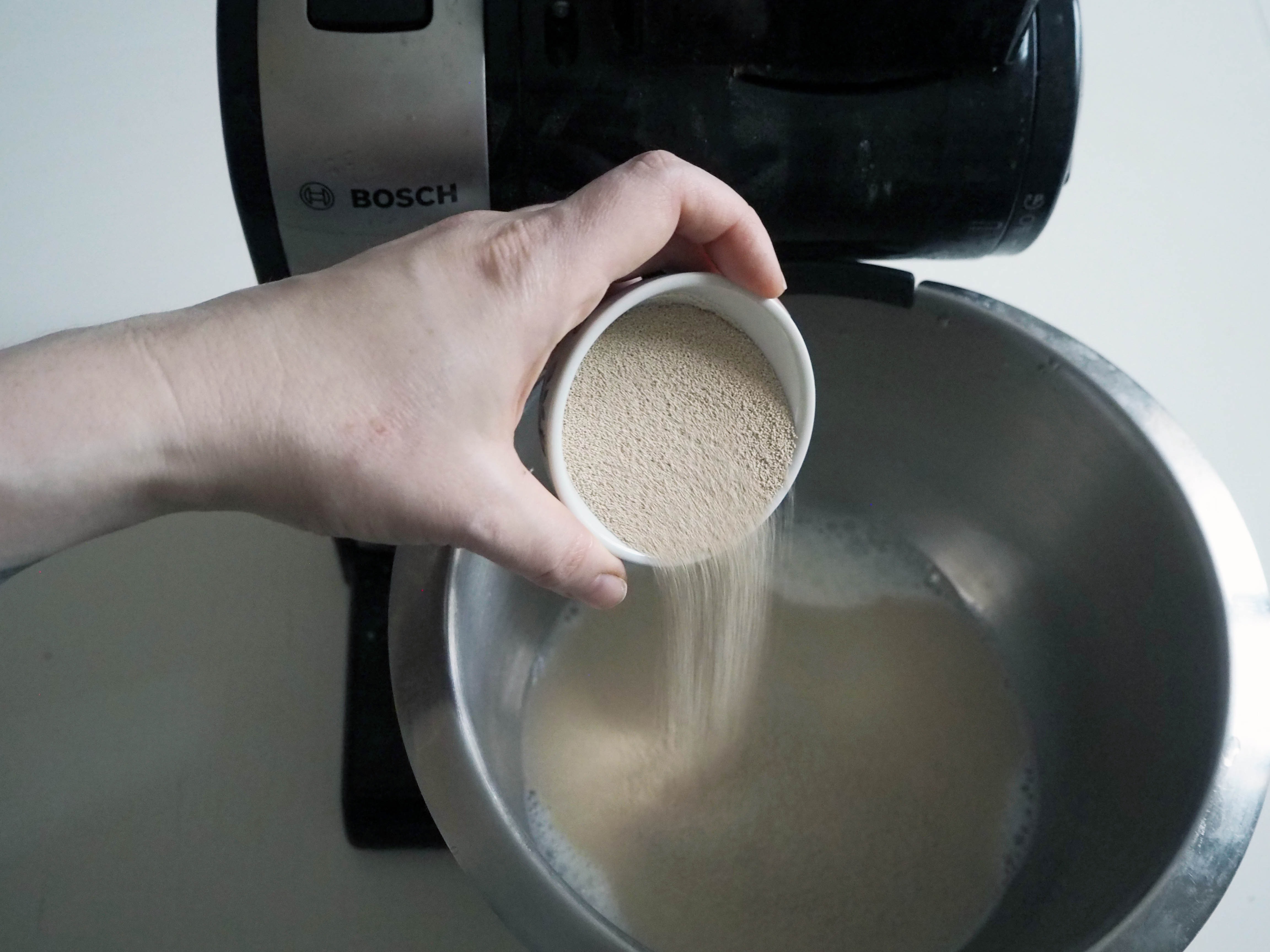2. Transfer warm milk to a mixing bowl (I used electric mixer but you can also perfectly do everything by hand). Add yeast, mix a little with a spoon. Let the yeast activate for about 10 minutes. It will get foamy at the end of 10 minutes.