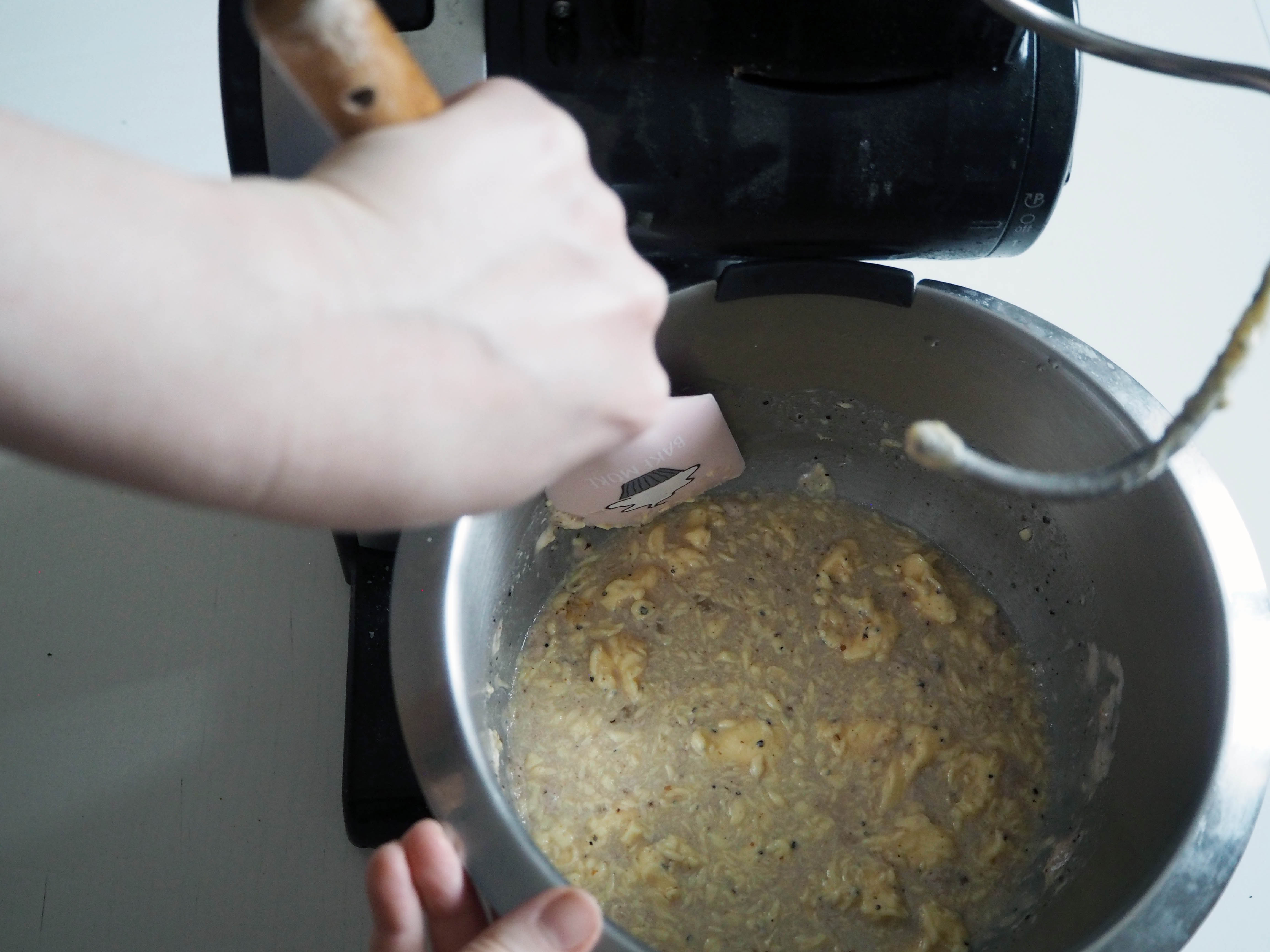 4. Add egg and continue mixing. Scrape sides of the bowl using a spatula if needed.