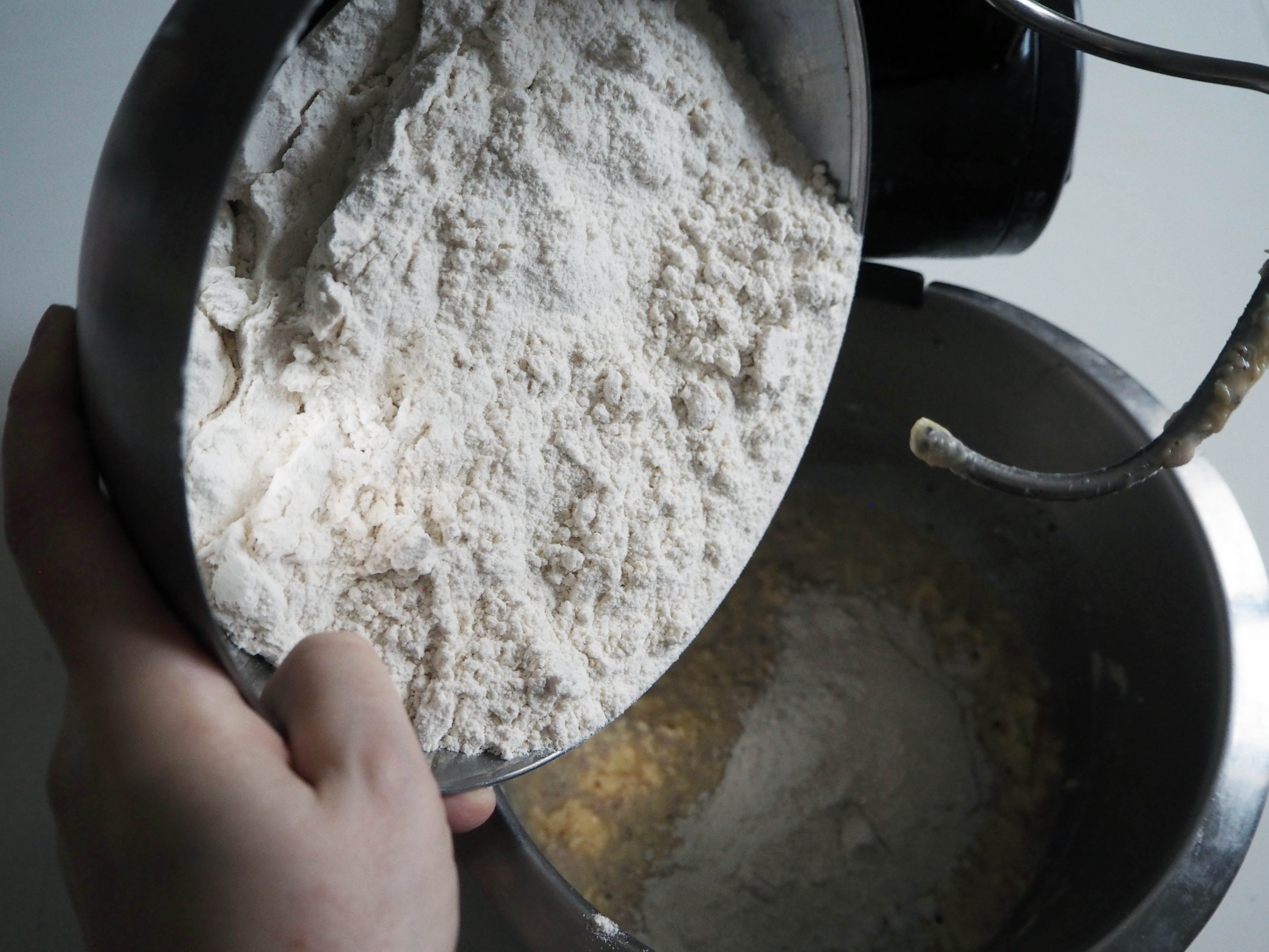 5. Add flour and continue mixing / kneading. When the dough starts to get clean from the sides of the bowl, it is ready.