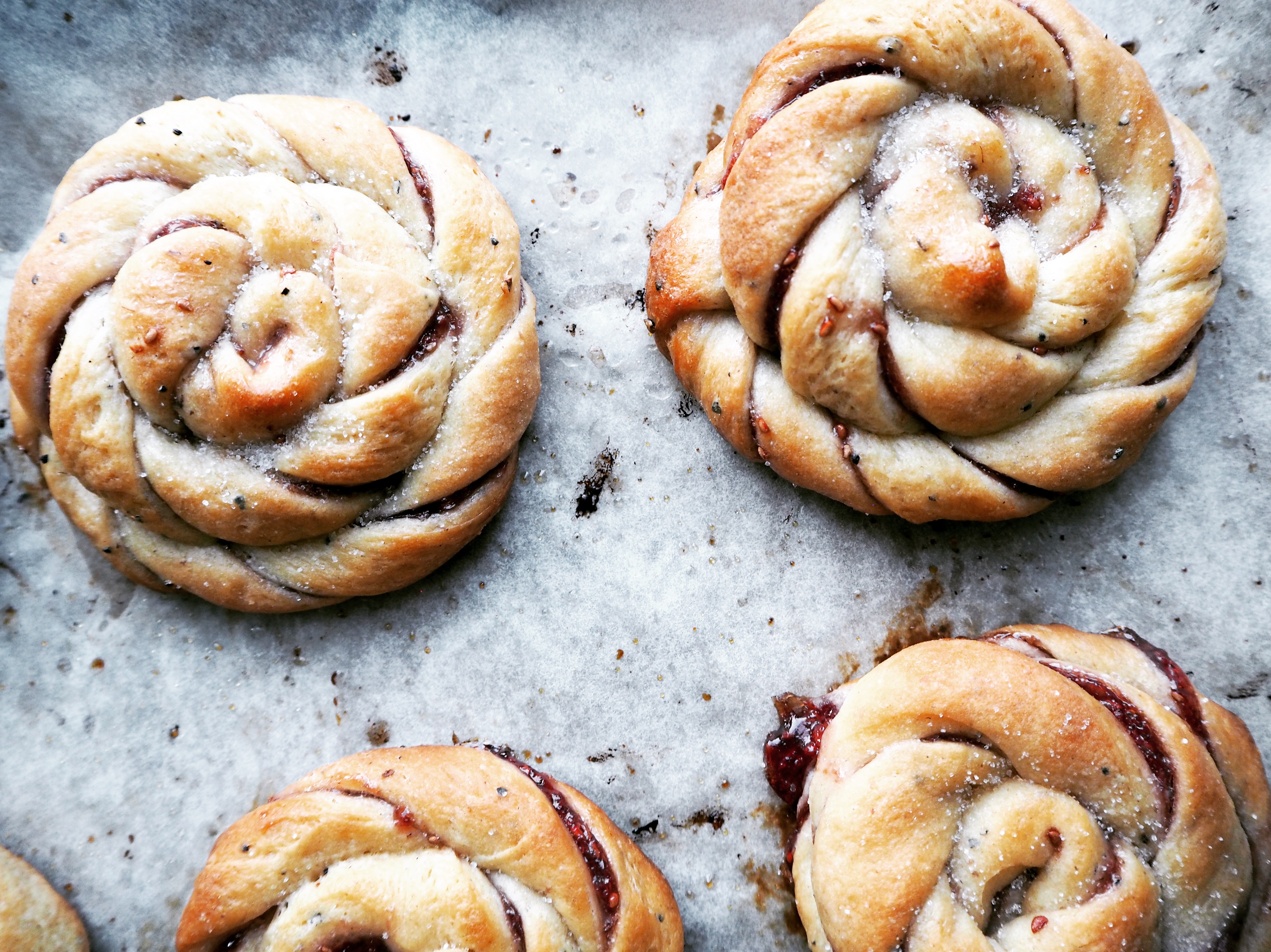 I thought of many different fillings for this next bun. The poppy paste bun was delicious but it was fully sweet. This time I wanted to have both sweet and a bit of sour. Because this is the country of berries, I wanted to go that way. For a while I thought of using fresh of frozen berries, like blueberries or raspberries, but then I decided to use something that was smoother than pieces of berries. And this is how I ended up with raspberry marmalade.