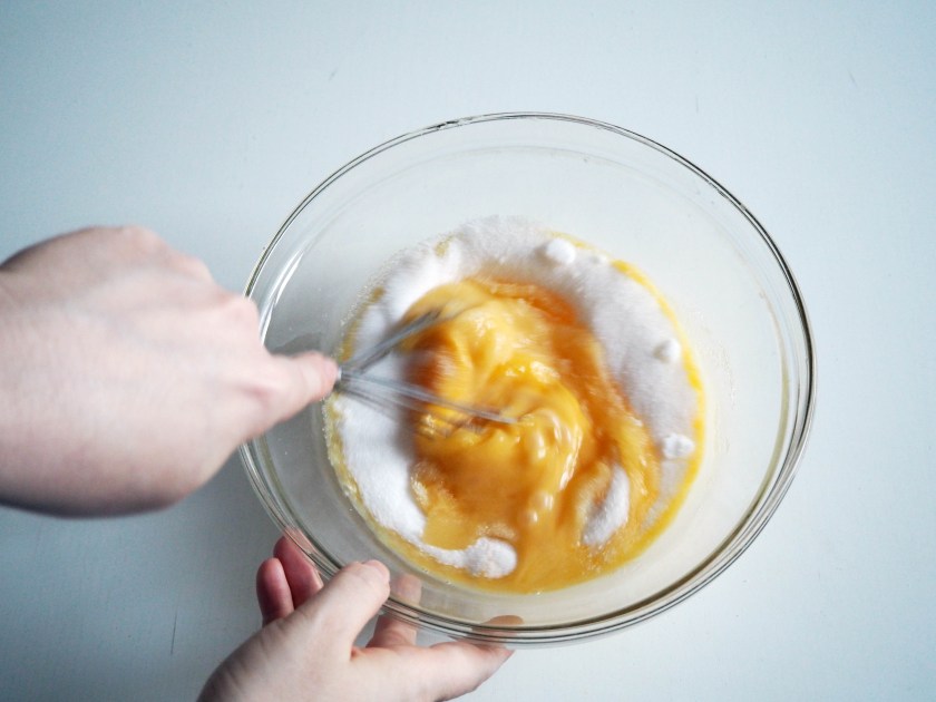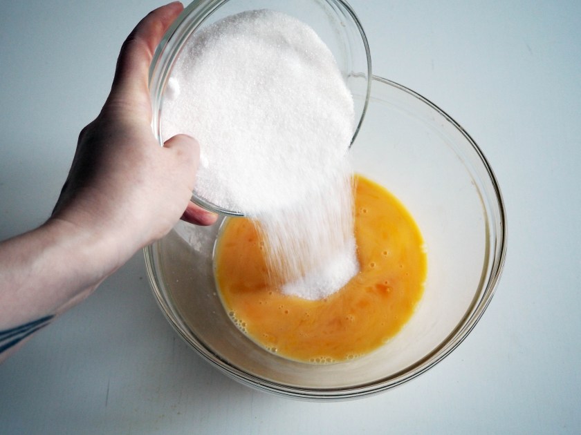 3. Put 6 eggs in a mixing bowl and whisk a little. Add sugar and whisk more until they are incorporated.