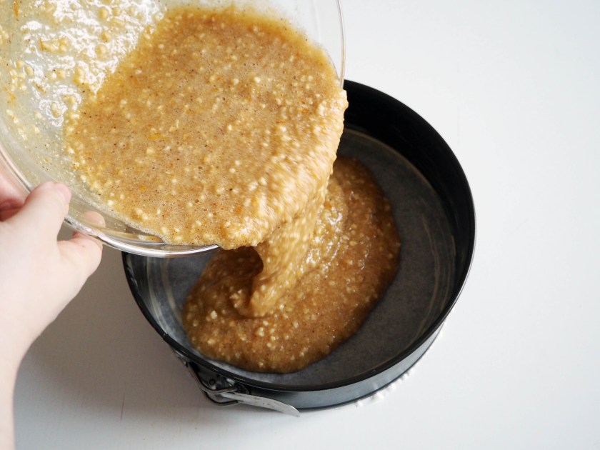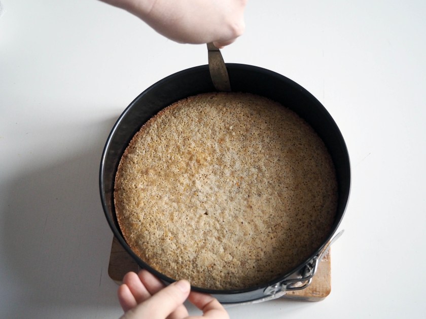 1. Preheat the oven to 180C. Grease a 24cm cake pan and put a baking paper on the bottom.