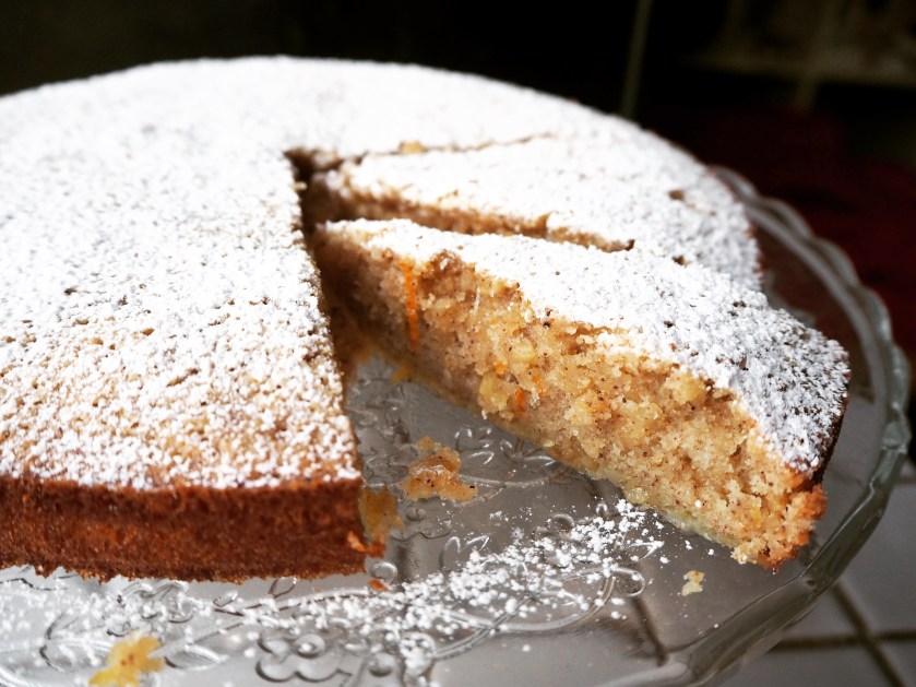 The flour part of this cake is, as the name tells, made of almonds. I decided not to use all as finely ground almonds. Instead, I used about 1/3 of the flour as coarsely ground almonds. Also, I used both orange and lemon zests, instead of just one of those as suggested in most of the recipes. This added a very rich flavour.