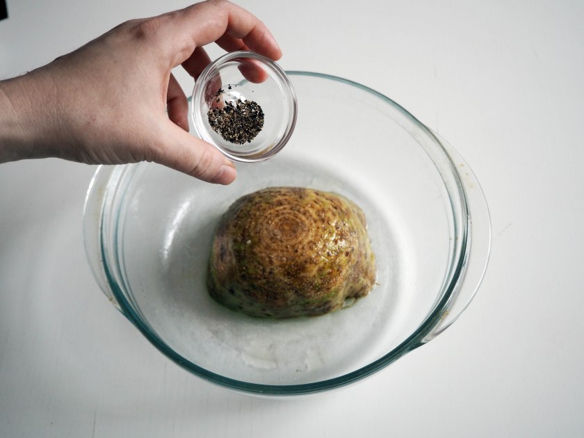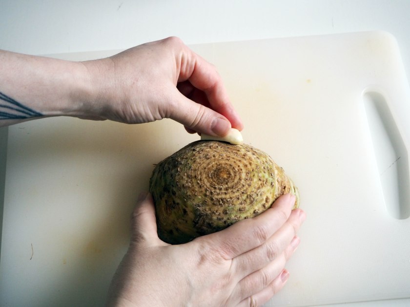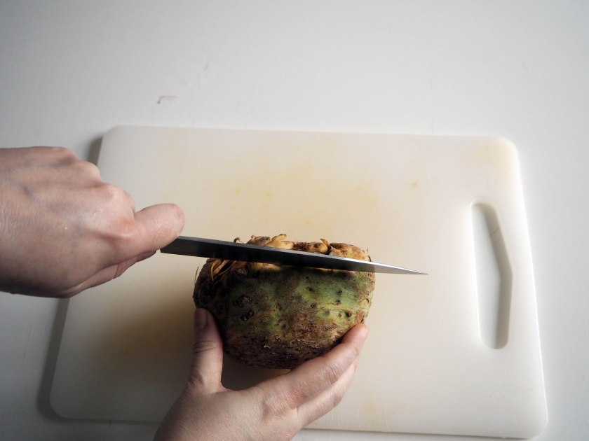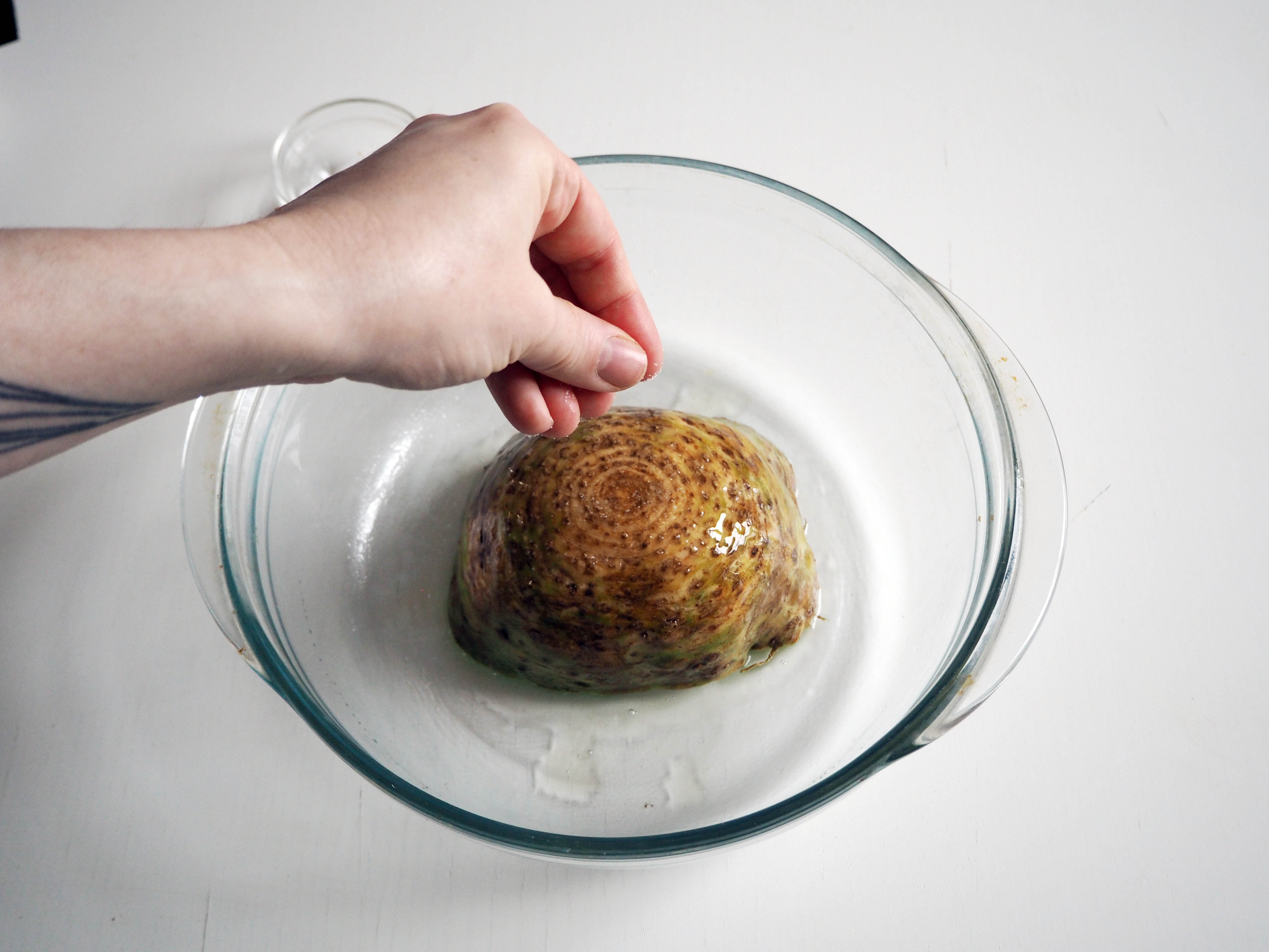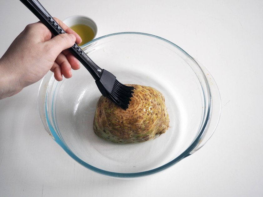 1. Preheat the oven to 180C. Wash your celeriac as I wrote above if you haven’t already, and pat it dry.