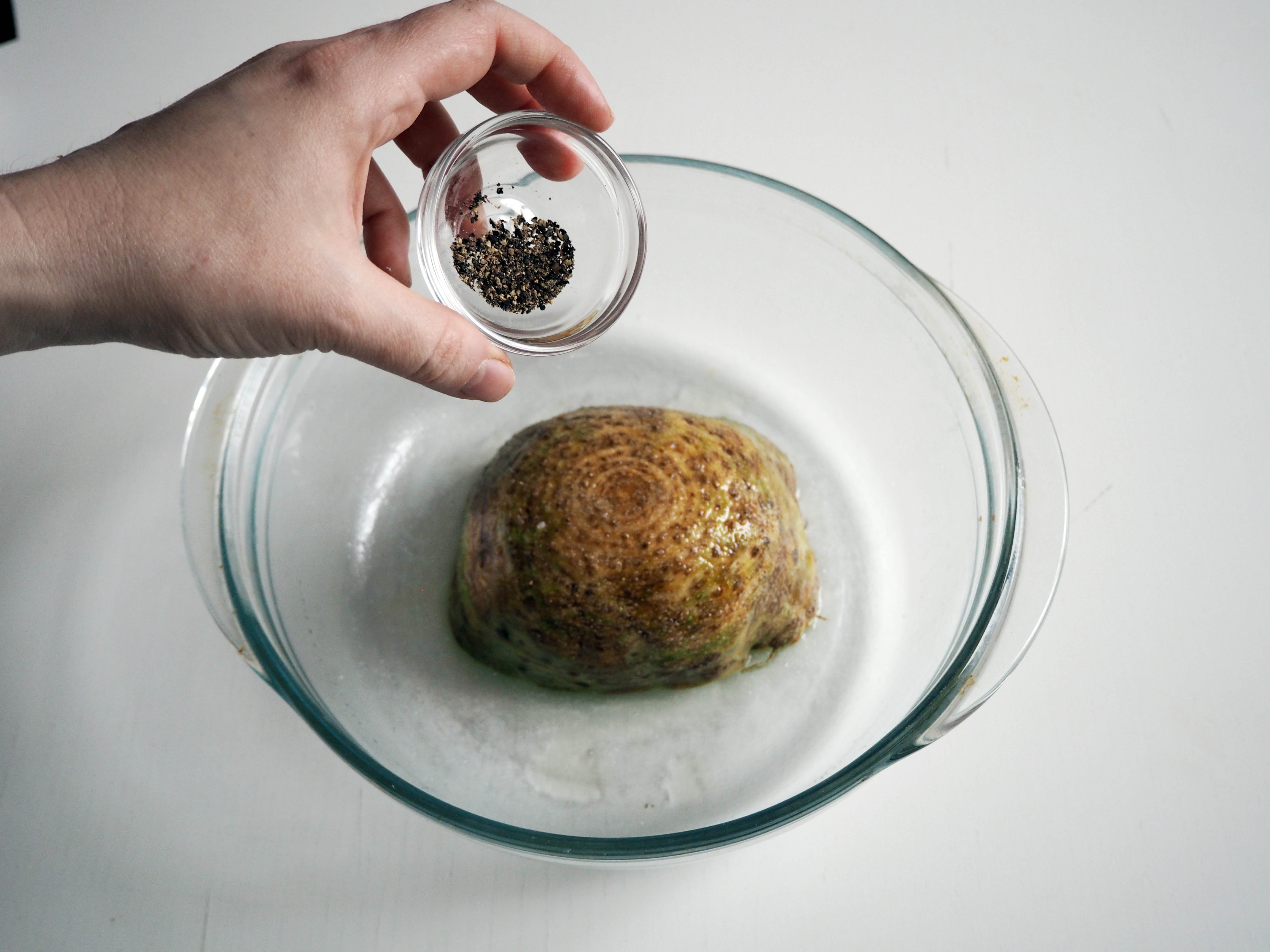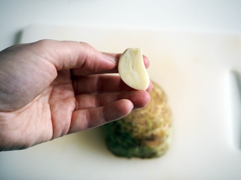 3. Cut garlic clove in 2 and rub the cut surface generously on celeriac’s surface.
