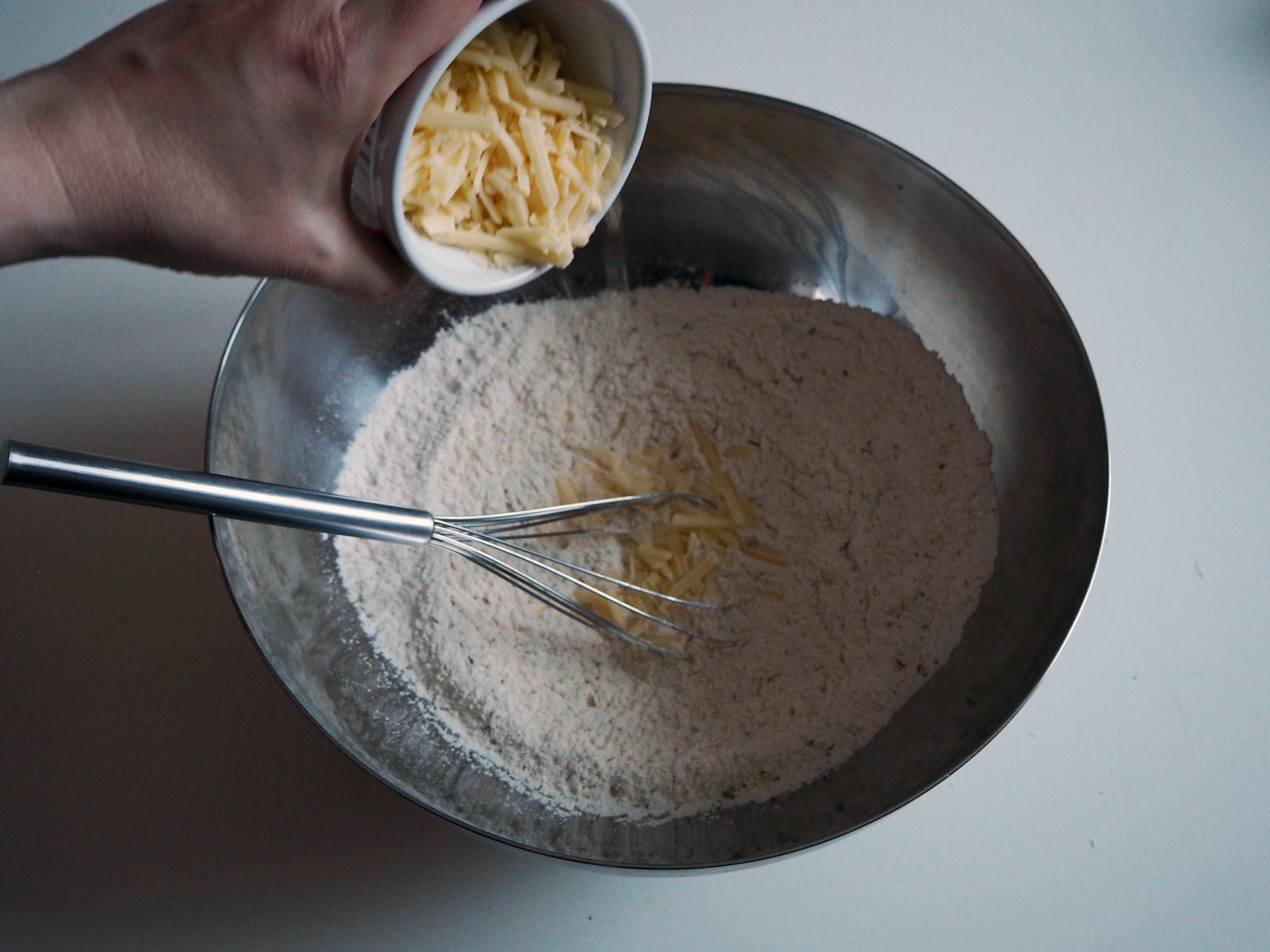3. Add cheddar cheese and whisk. Add sun-dried tomatoes and whisk. (If you are using olives, add them at this stage too.) Put aside.