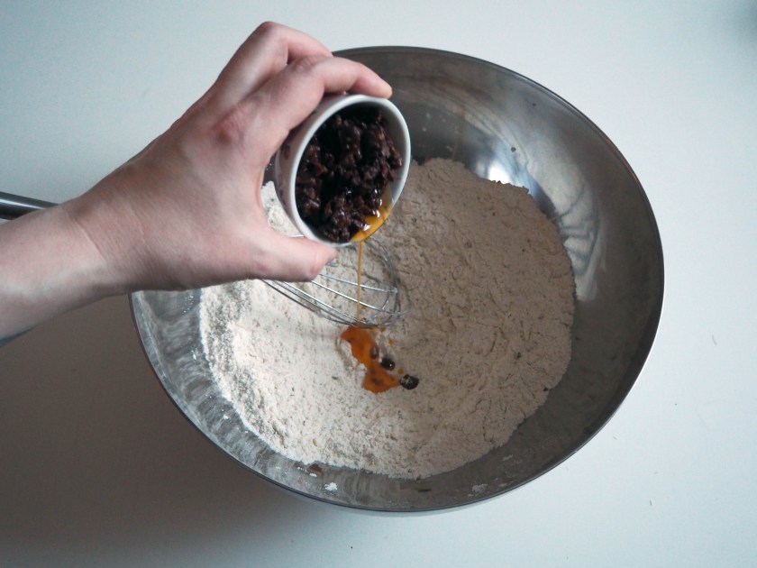 2. In a big mixing bowl, put the dry ingredients (in the ingredients list, starting with flour and ending with basil). Whisk a little.