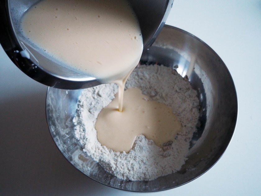 6. Pour the mixture on to the other ingredients and fold just until all the dry ingredients are mixed with wet ingredients.