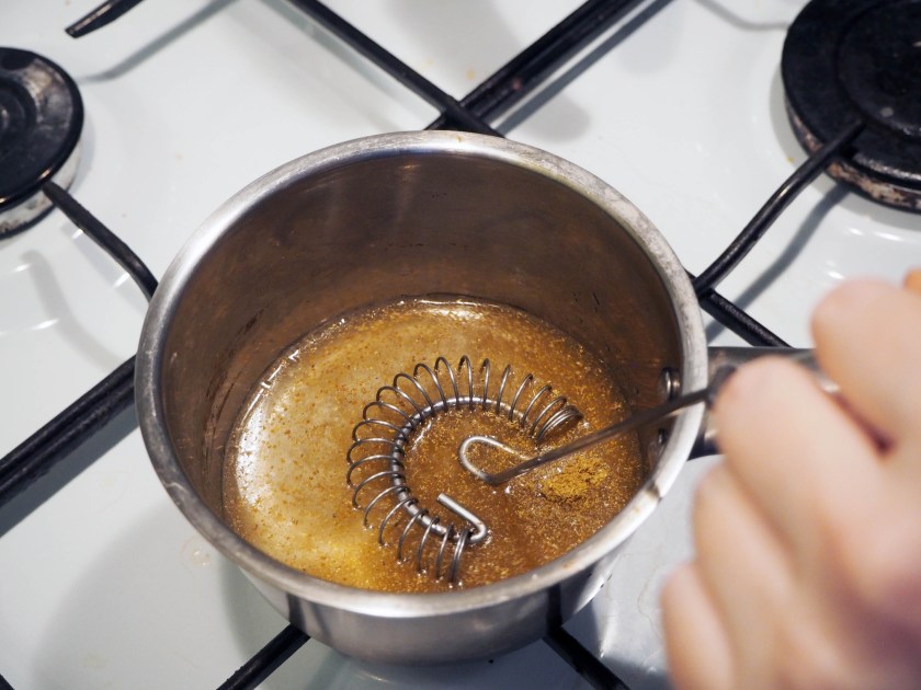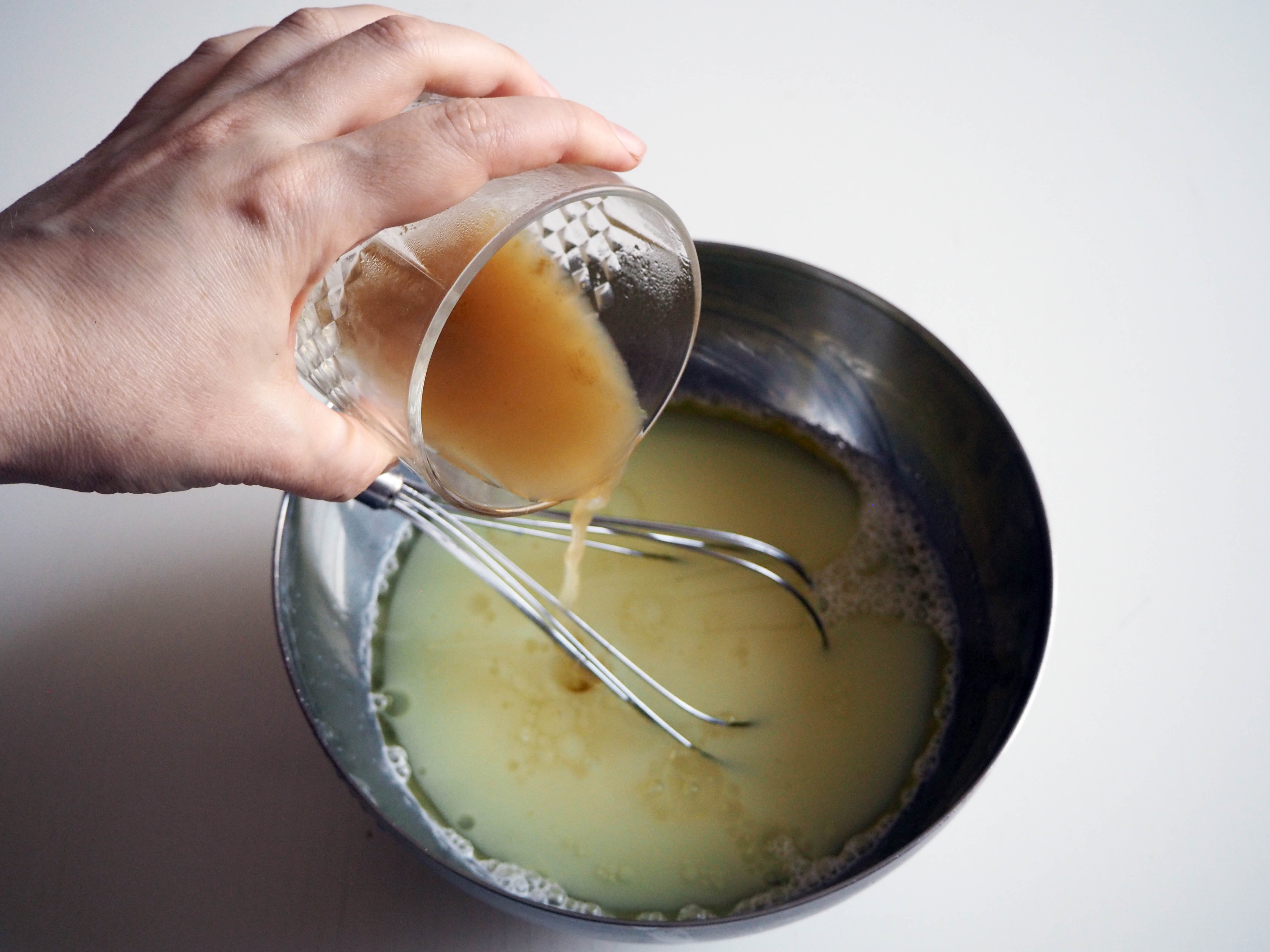 5. Add canola oil, orange blossom water and aniseed water and continue whisking until you get a smooth mixture.