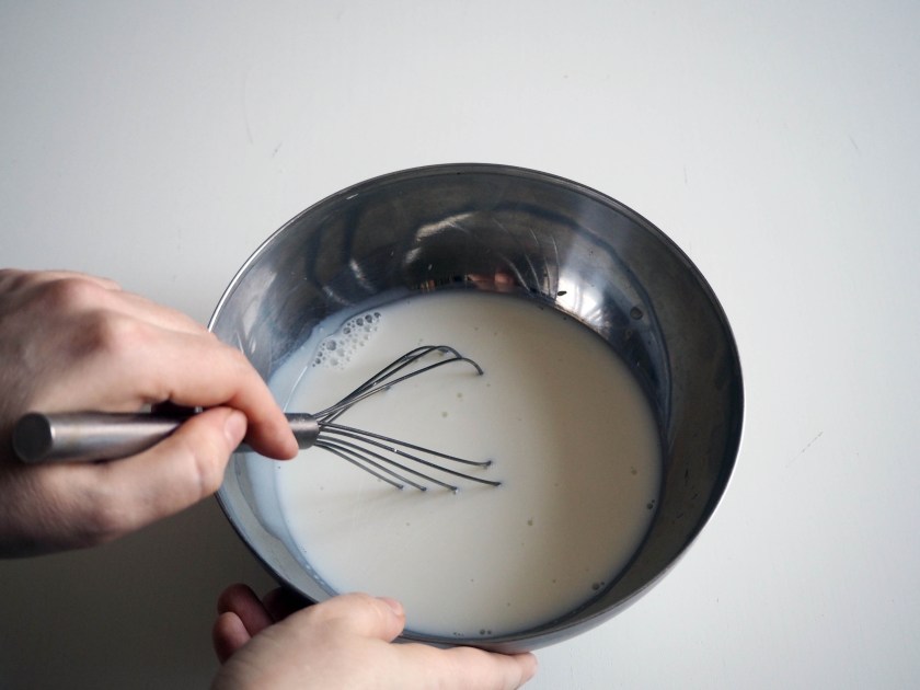 4. In a mixing bowl, put non-dairy milk and sugar and whisk well until sugar dissolves. You can use electric mixer but I just did it by hand.