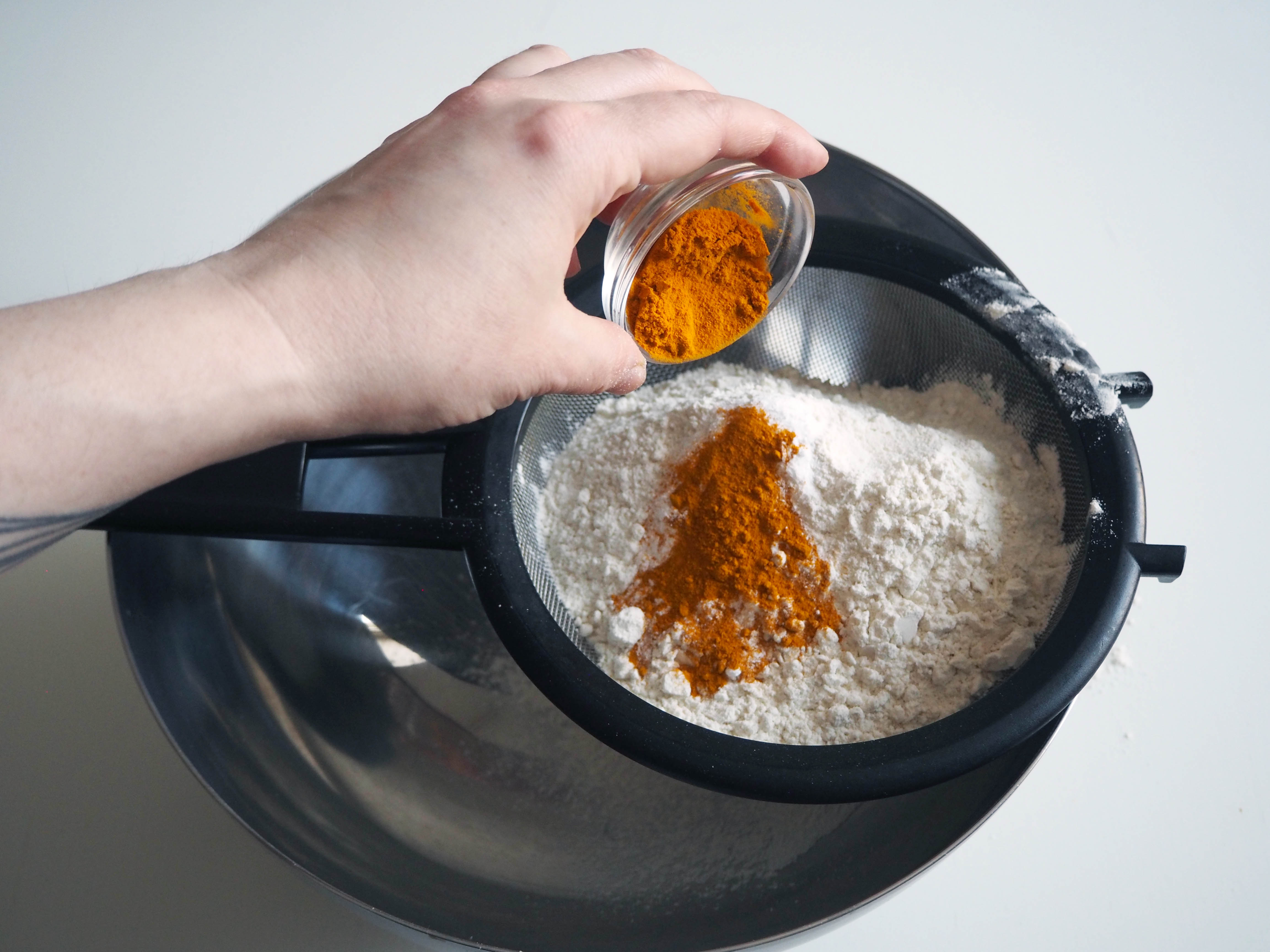 6. In another big mixing bowl, sift flour, baking powder and turmeric.