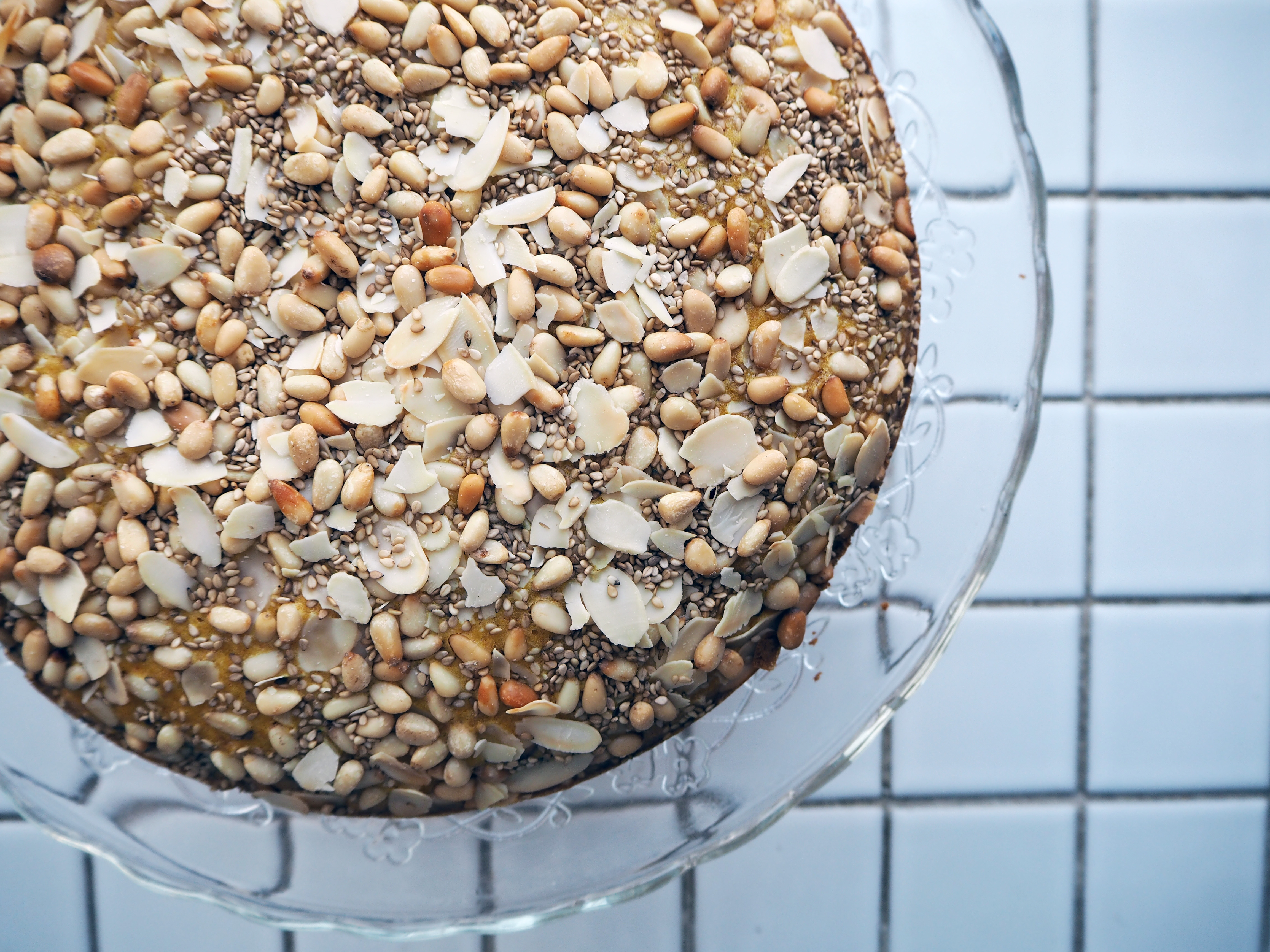9. Spread the nut/seed mixture on top of the cake, cover the whole surface. Put the cake in the oven, in medium rack and bake for 45 to 50 minutes, until a toothpick inserted in the middle comes out clean. Once baked and out of the oven, let it cool for 10 to 15 minutes before taking out of the cake pan and about 30 minutes more after that, before serving. Enjoy with fresh tea or coffee!