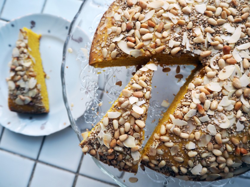 The Lebanese cake sfouf, and the original version of this cake, only uses pine nuts for decoration on top. However, I wanted to make it really rich and festive on top, therefore I also added some sliced almonds and sesame seeds. I think this mixture added lot more richness to the overall taste, and yet you can still get the distinct taste of the cake’s main ingredients.