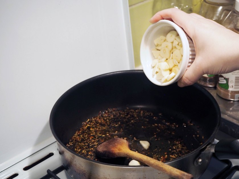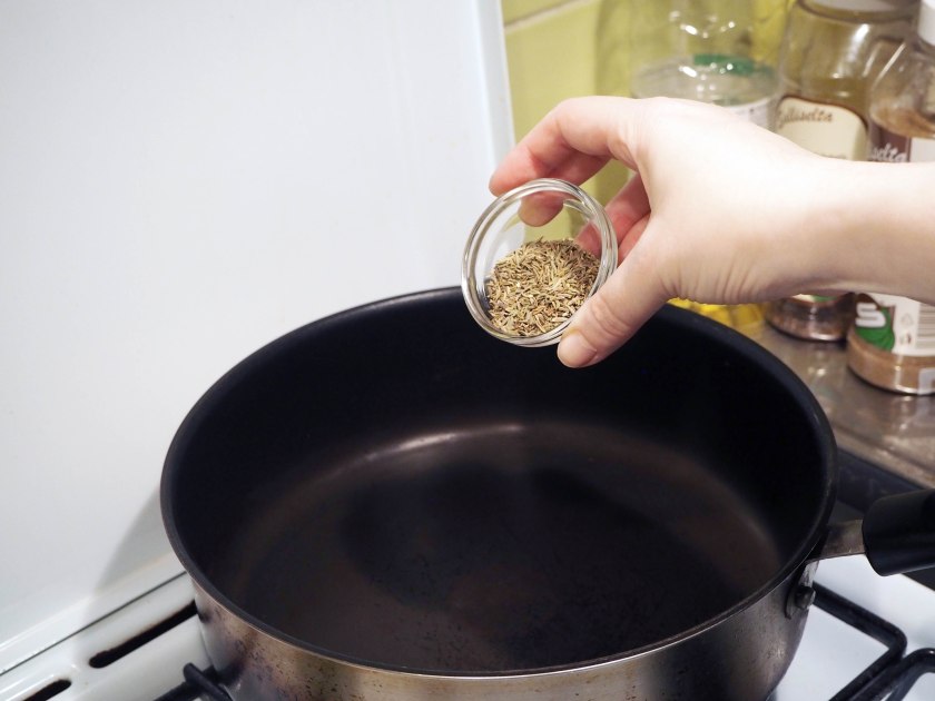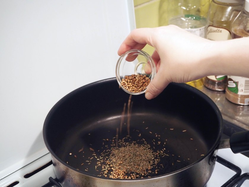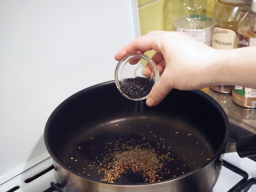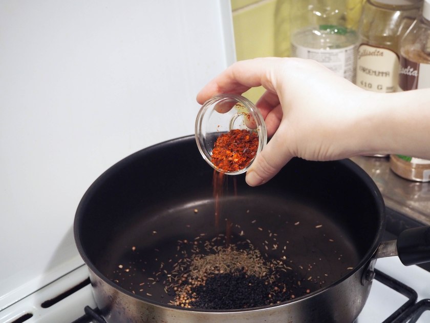 1. Heat a large and deep pot / pan on medium high heat, put cumin, coriander, mustard and black sesame seeds together with red pepper flakes in heated pan. Dry roast the spices for about 2-3 minutes, stirring every once in a while, until they get fragrant. Be careful and do not burn them.