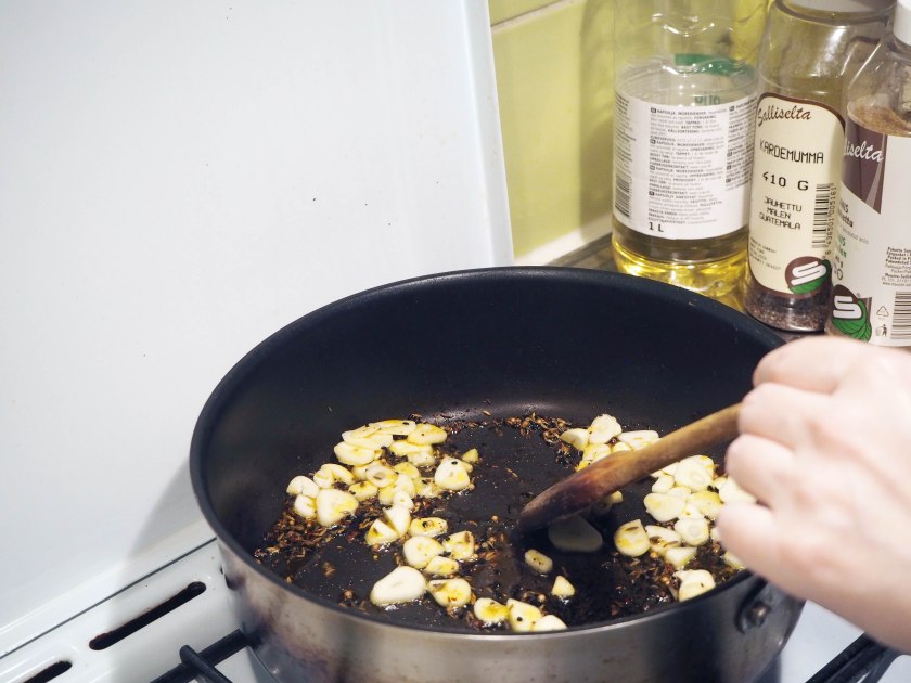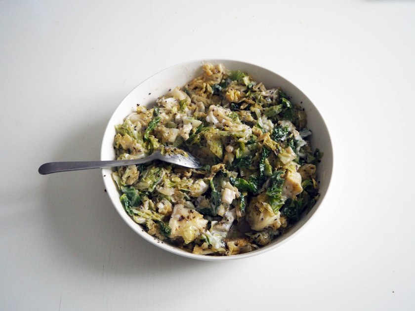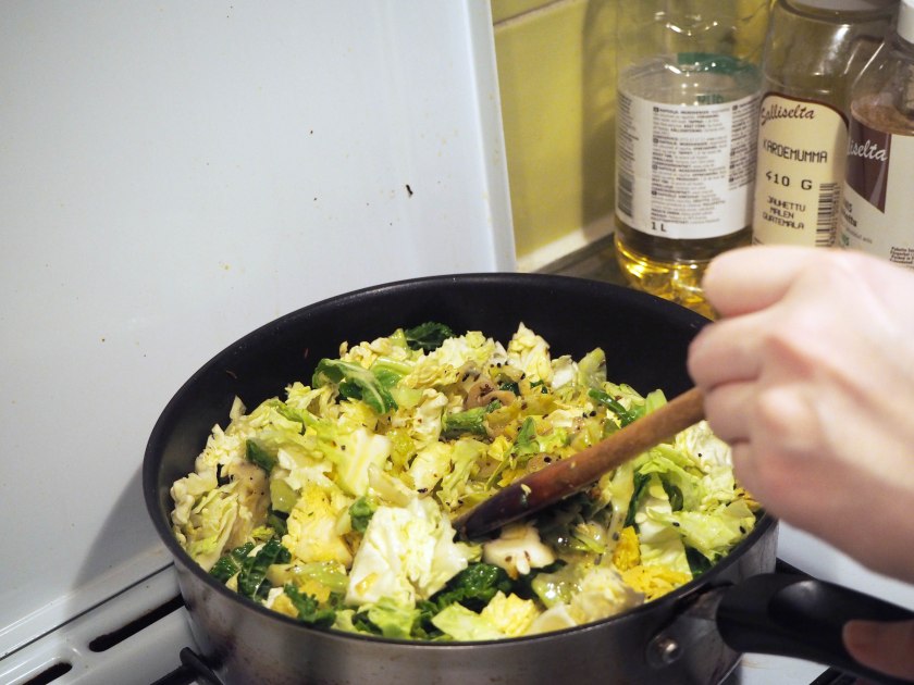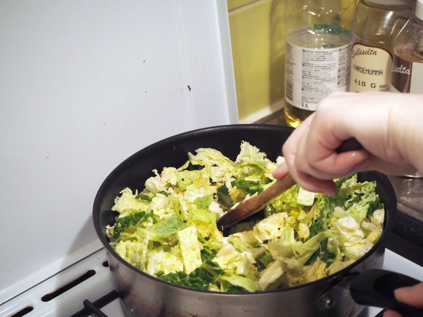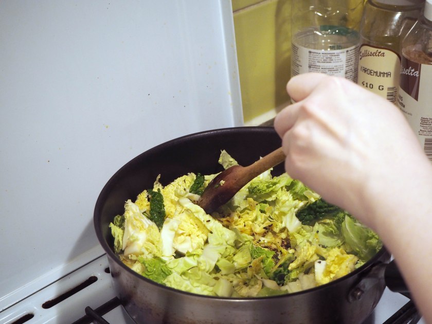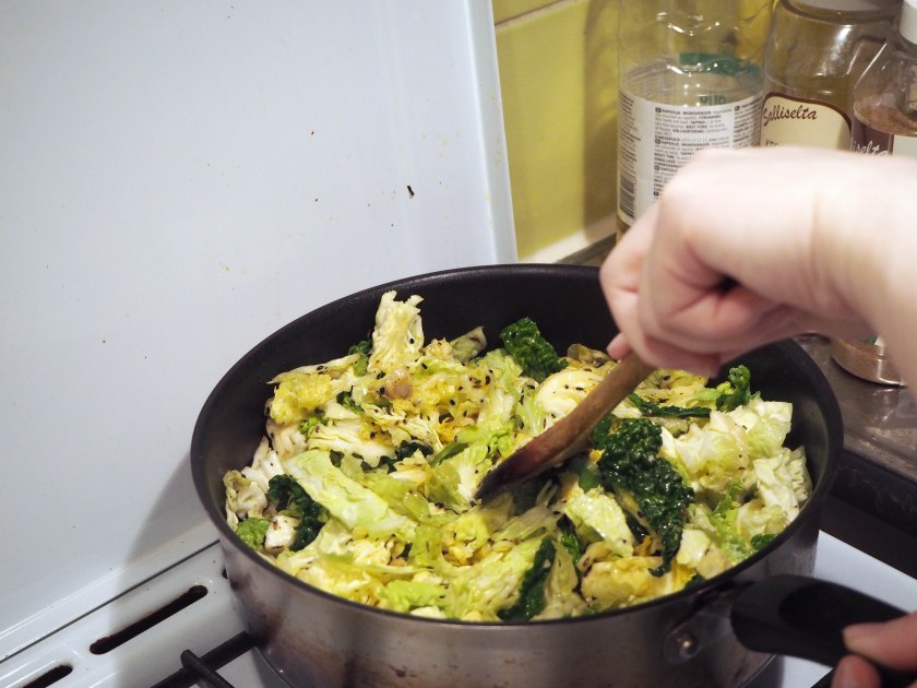 1 savoy cabbage (or another green cabbage you like), washed, halved, core removed and the rest cut in about 2cm strips (don’t try to drain the cabbage too much and use the dripping water while cooking)