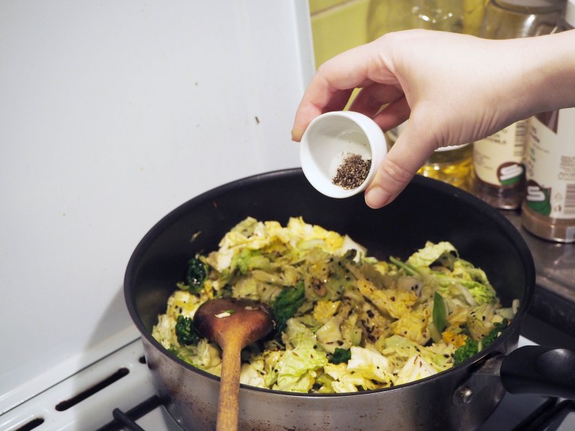 4. Add salt and pepper, another 1/3 of cabbage and again, continue cooking and stirring.