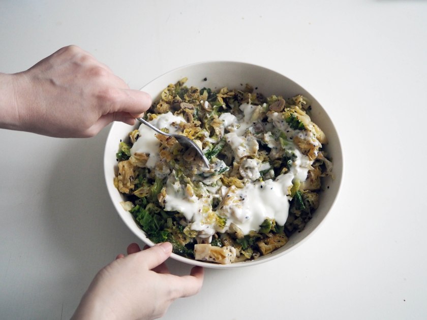 6. When the cabbage is cooked enough for your taste, transfer it to a serving dish and let it cool for about 5 minutes. After that, add yogurt and mix well. Serve warm (but it tastes great also later, when it’s much colder). Enjoy!