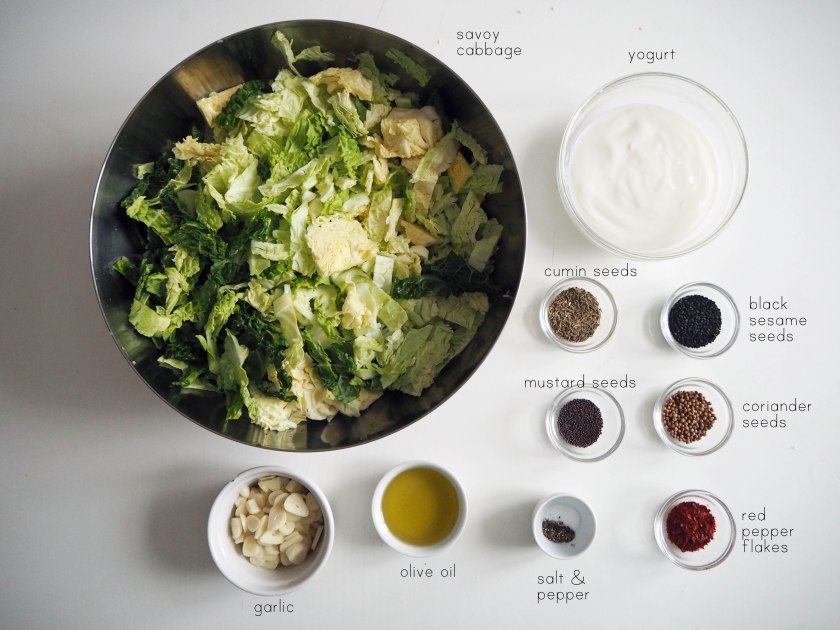 I saw this recipe in a beautiful cookbook by Sabrina Ghayour, but I adjusted a few things according to my taste. The one significant change I had was to increase the amount of yogurt, because I just love cabbage and yogurt combination so much (yogurt and any vegetable, to be honest). Besides that, I changed nigella seeds to black sesame seeds. I never liked nigella seeds (taste too bitter for me) and I instead absolutely love black sesame seeds,
