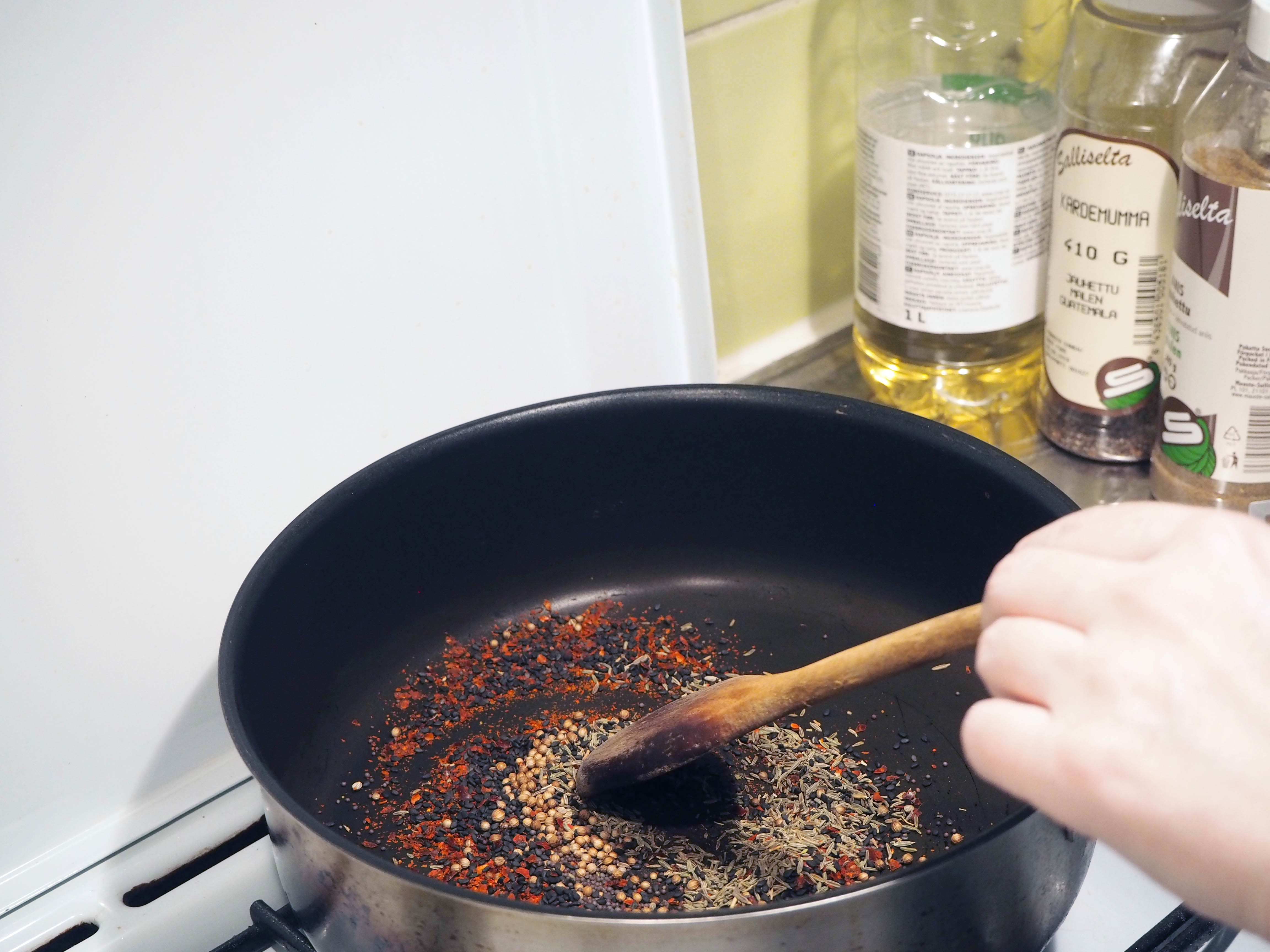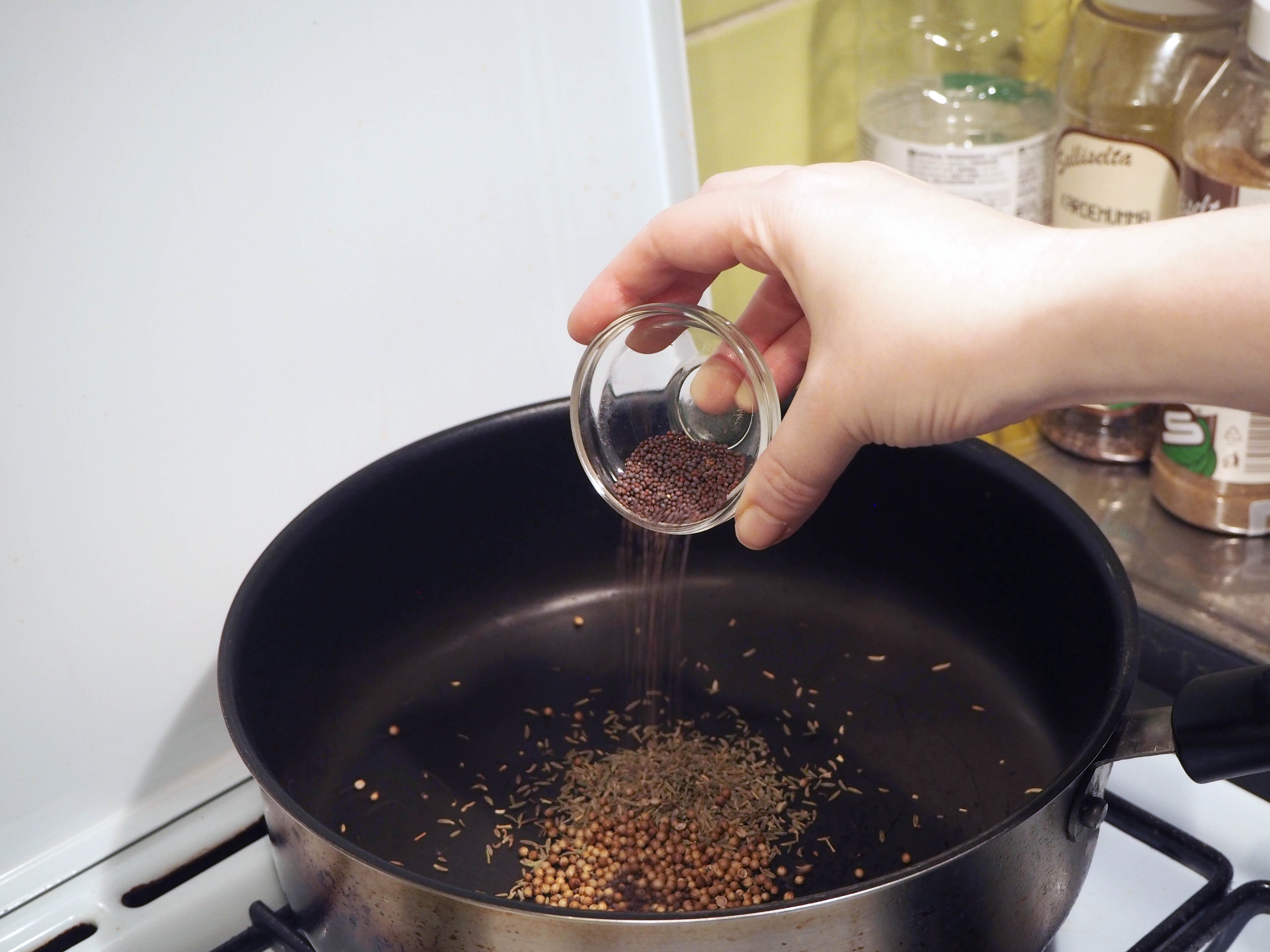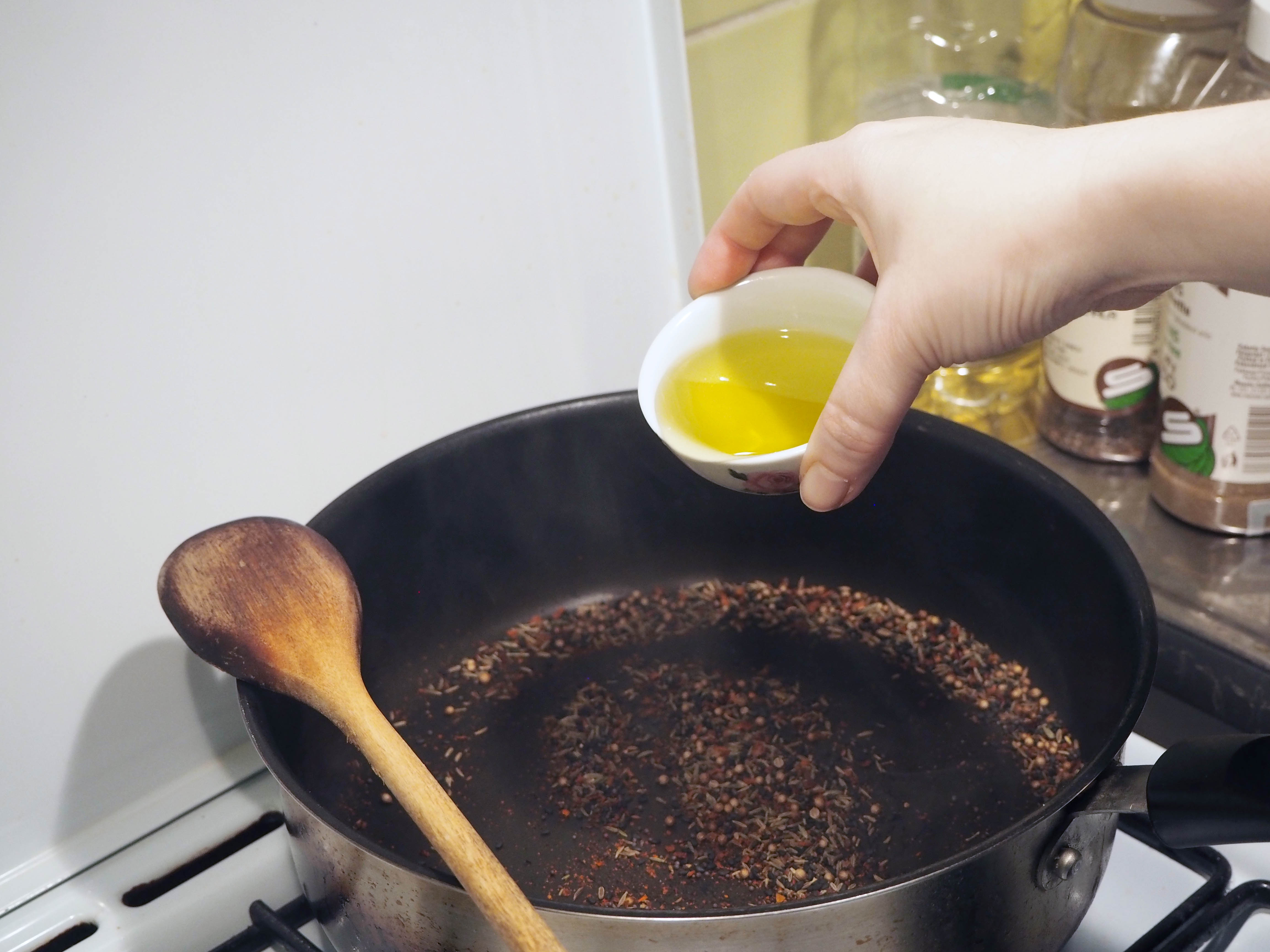 1. Heat a large and deep pot / pan on medium high heat, put cumin, coriander, mustard and black sesame seeds together with red pepper flakes in heated pan. Dry roast the spices for about 2-3 minutes, stirring every once in a while, until they get fragrant. Be careful and do not burn them.