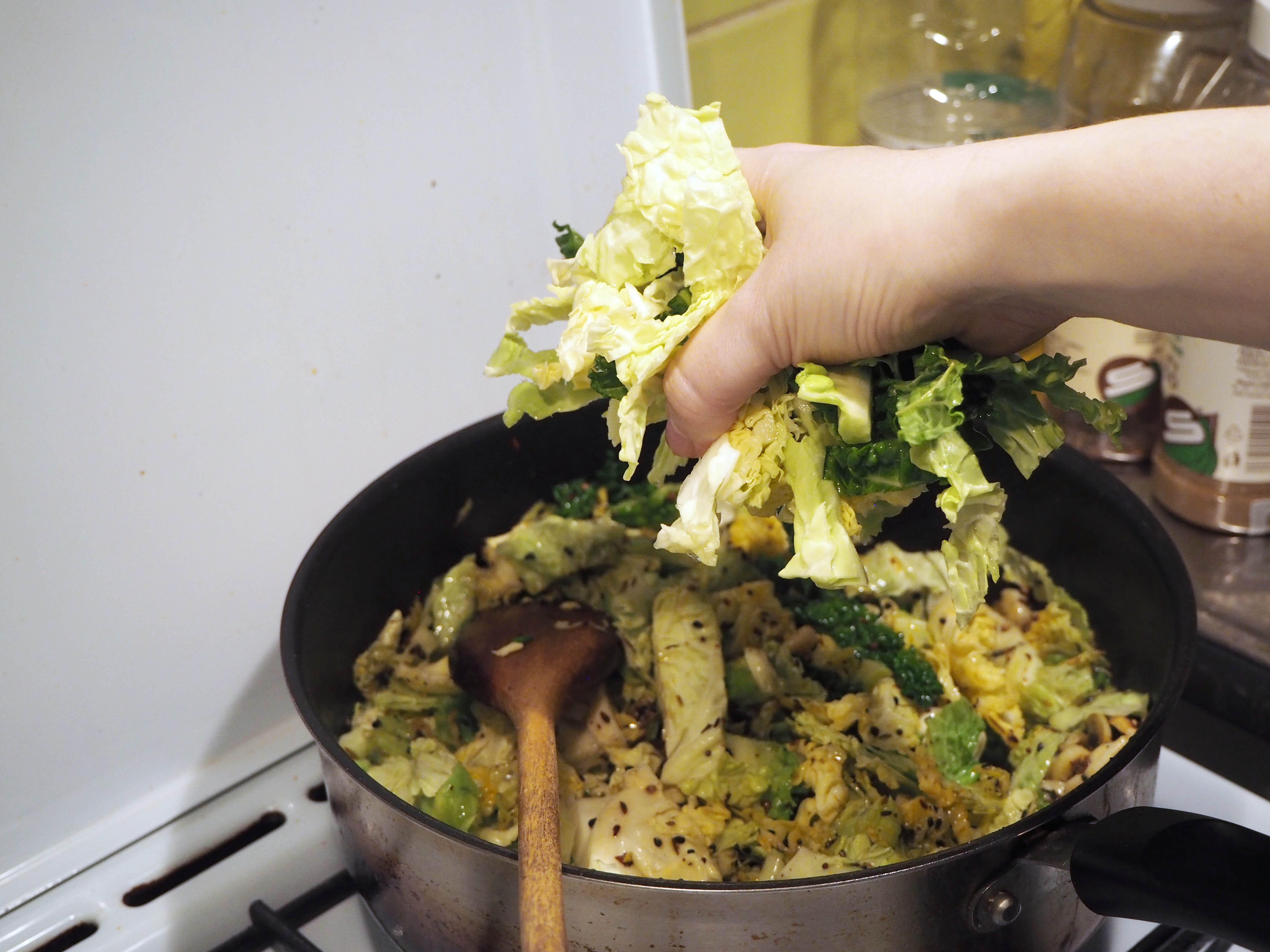 3. Add about 1/3 of cabbage and continue cooking while stirring and mixing the cabbage with spices, oil and garlic.