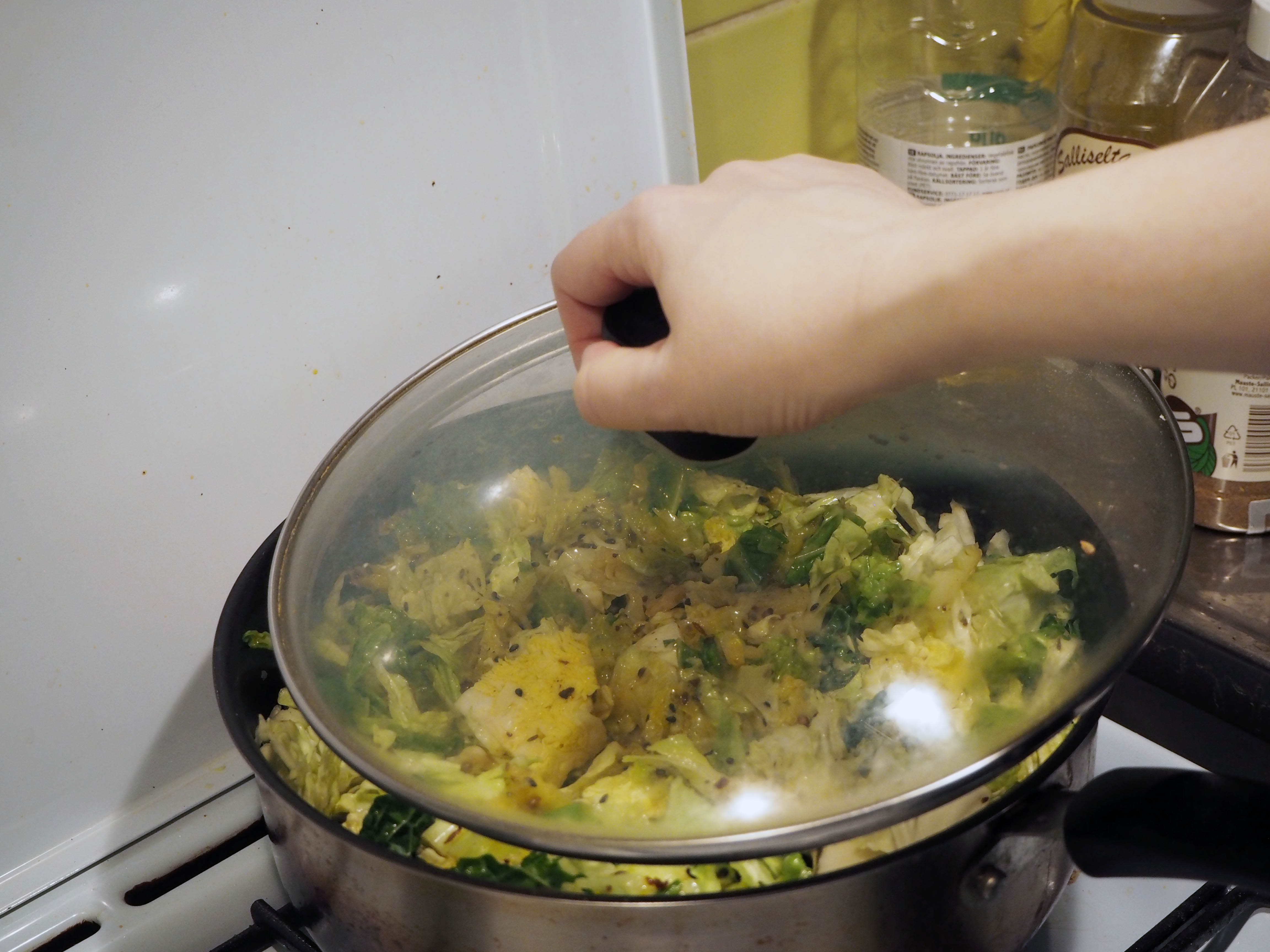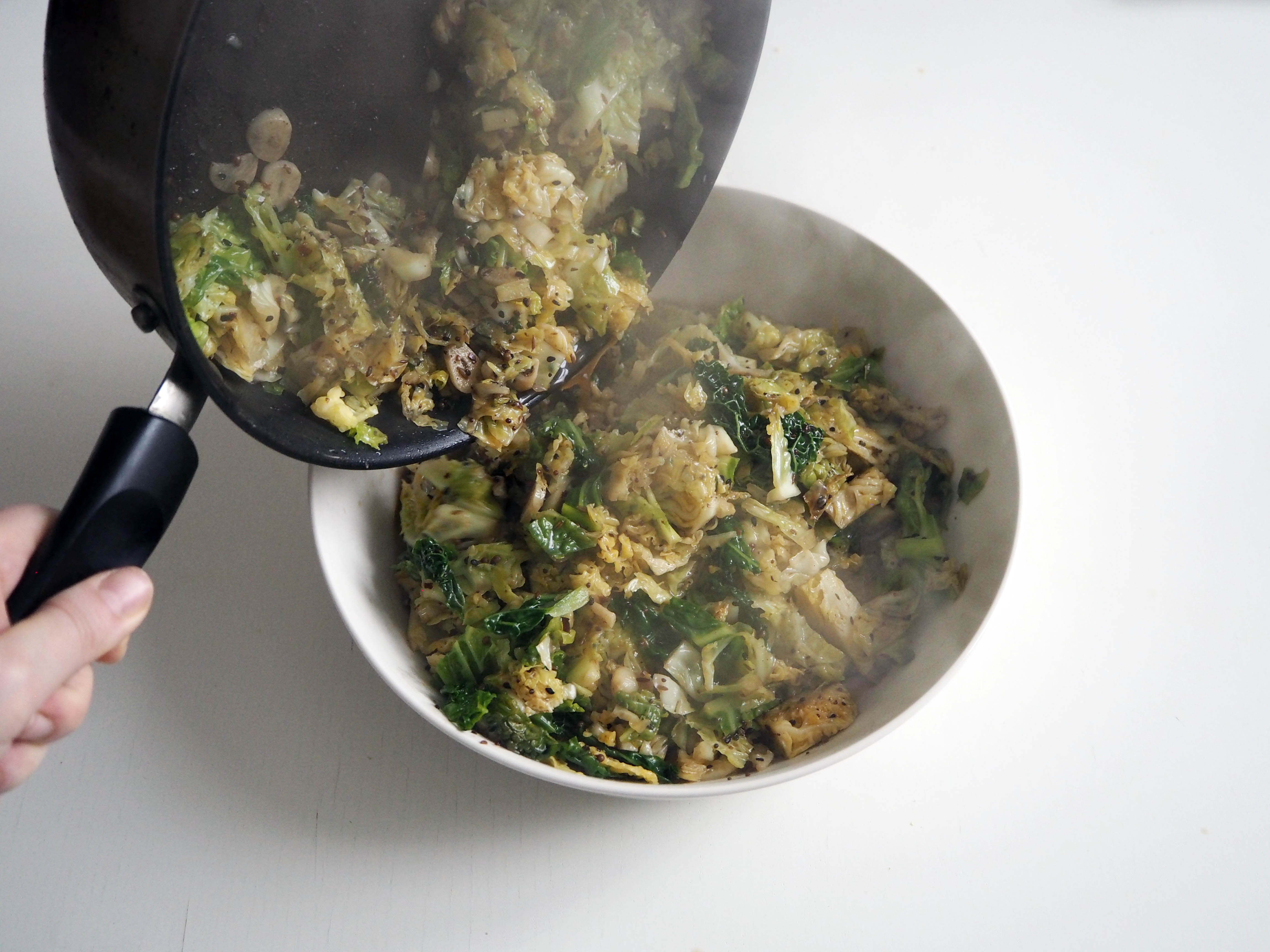 1 savoy cabbage (or another green cabbage you like), washed, halved, core removed and the rest cut in about 2cm strips (don’t try to drain the cabbage too much and use the dripping water while cooking)