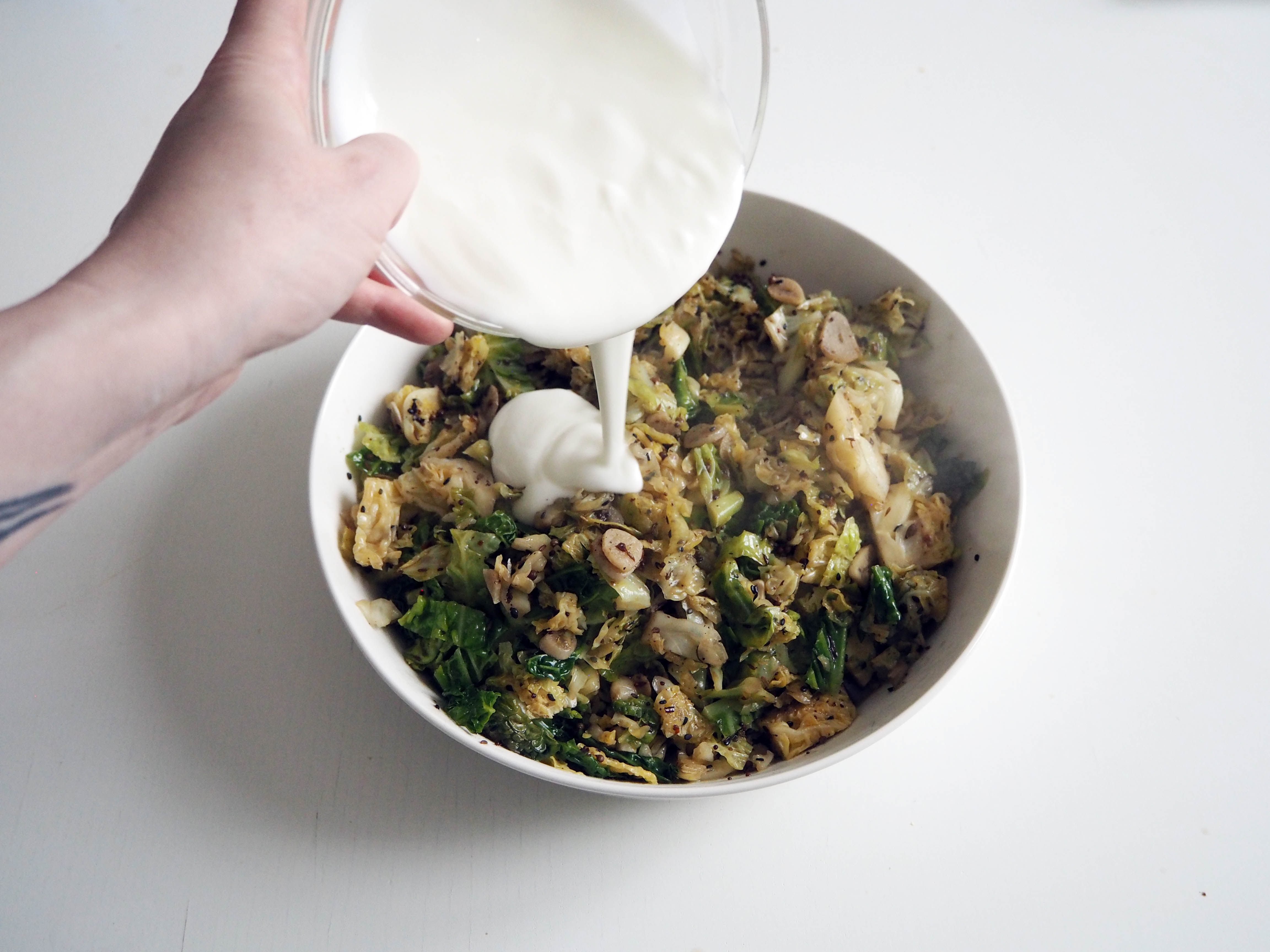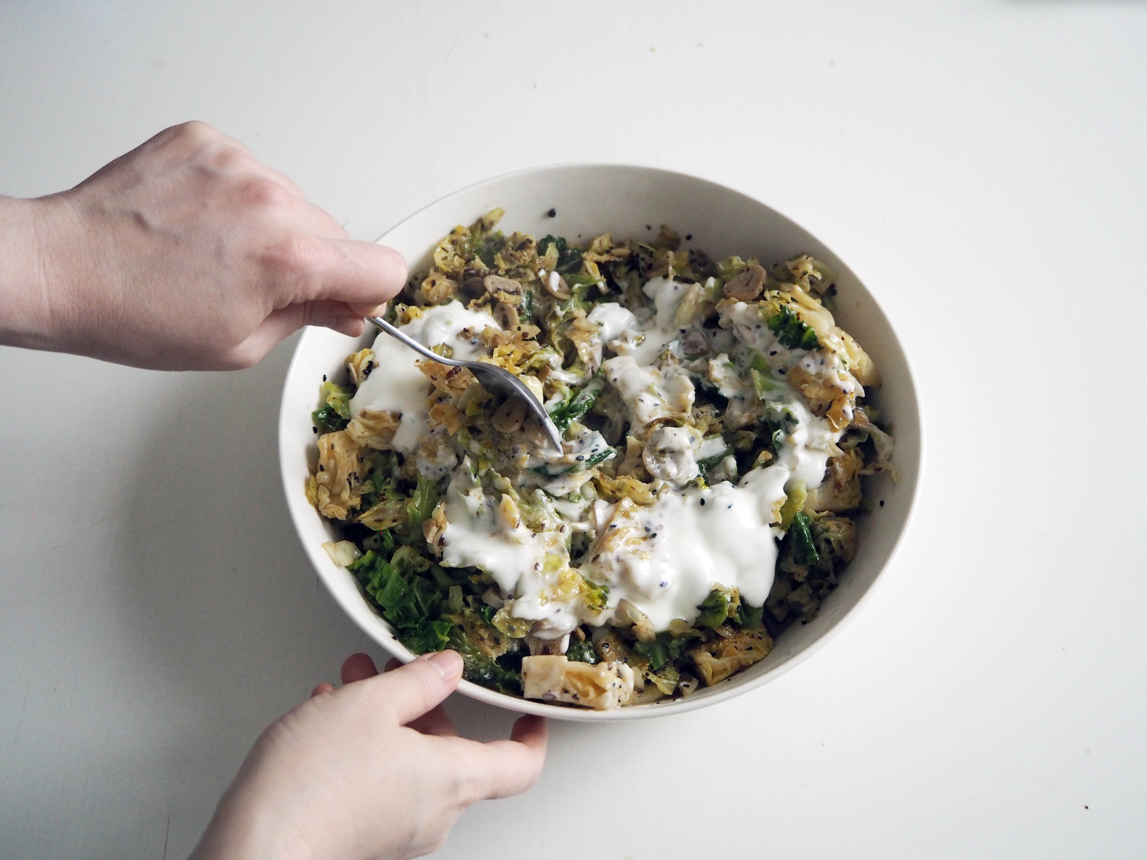 6. When the cabbage is cooked enough for your taste, transfer it to a serving dish and let it cool for about 5 minutes. After that, add yogurt and mix well. Serve warm (but it tastes great also later, when it’s much colder). Enjoy!