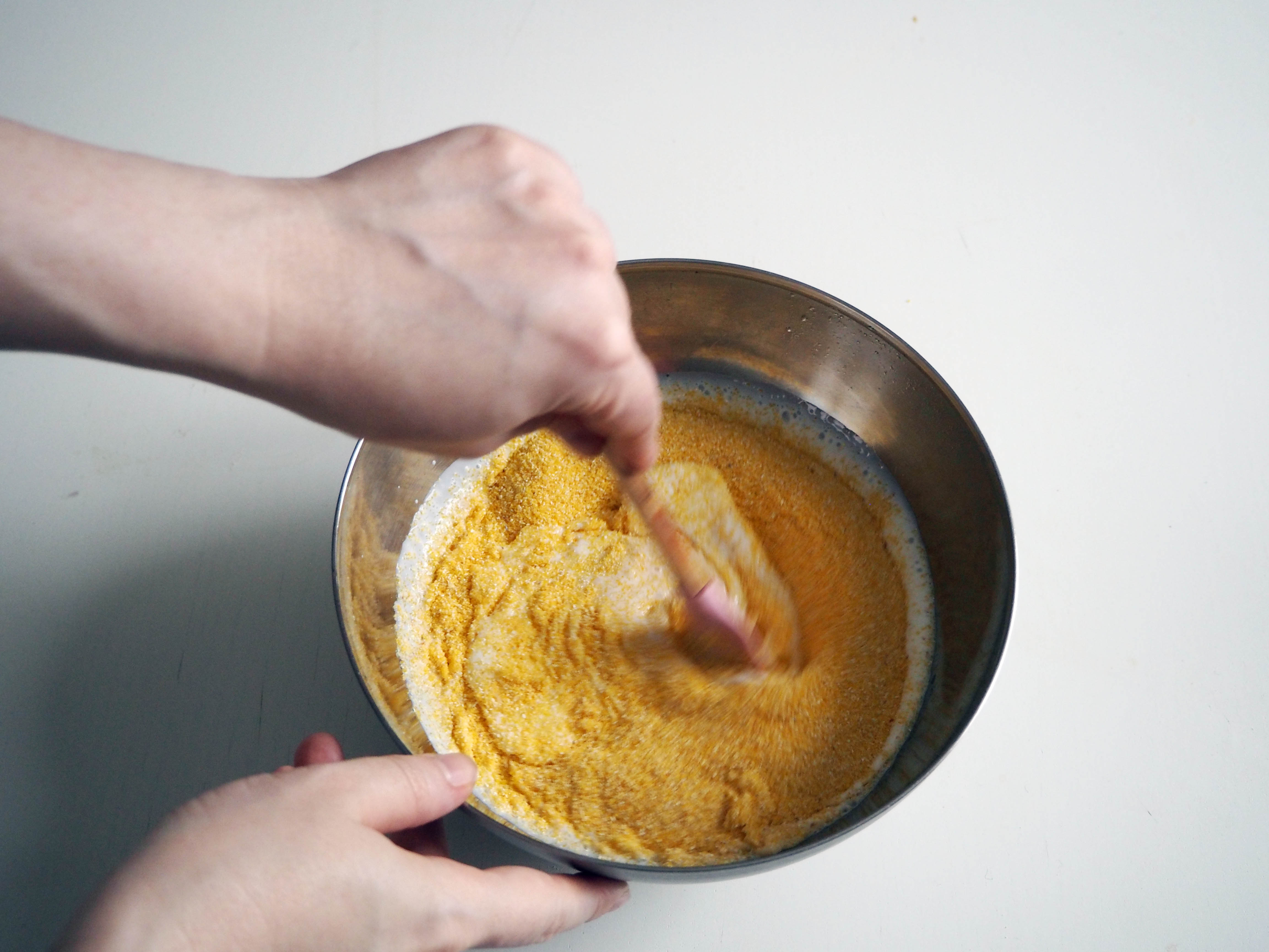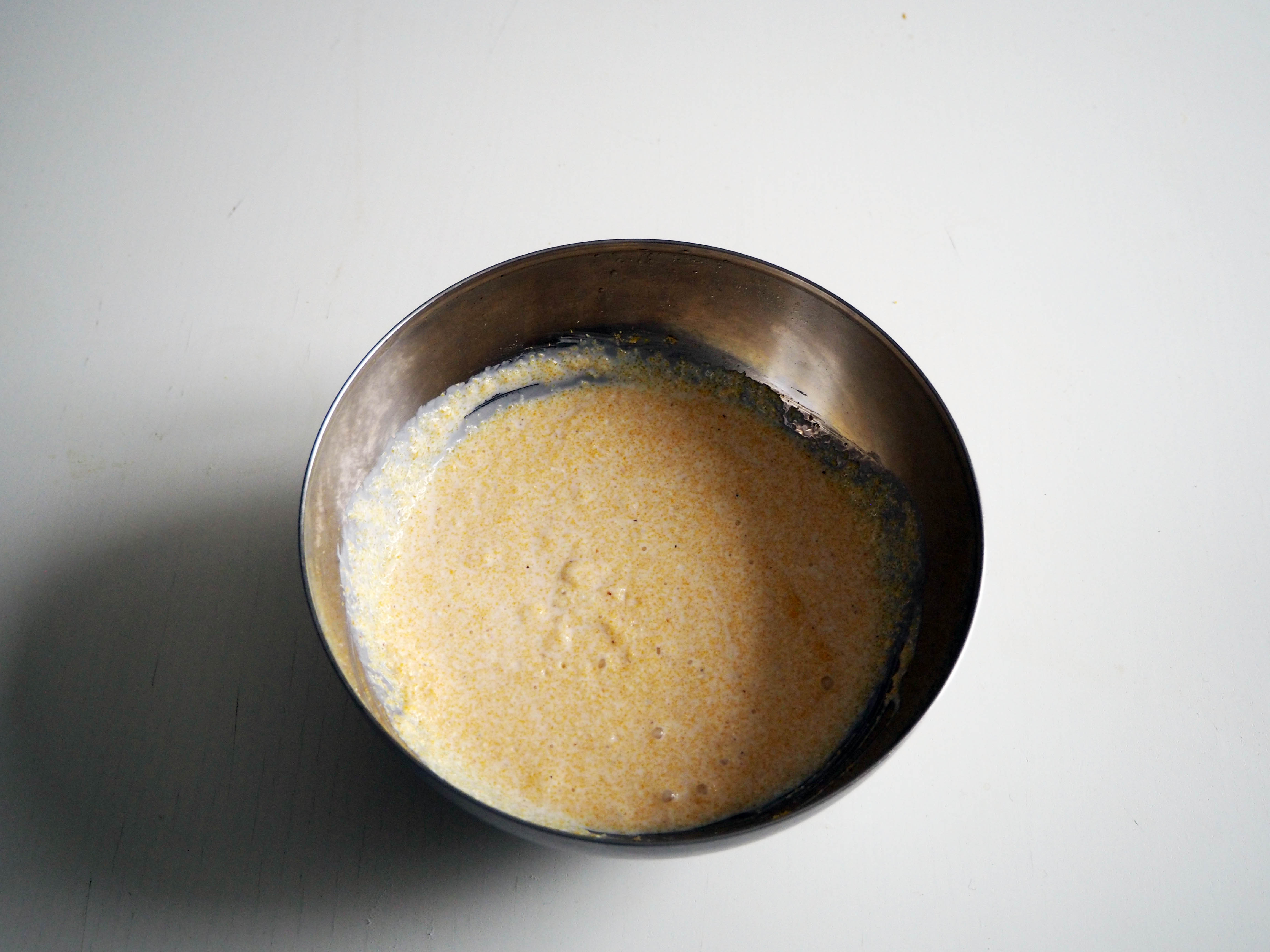 2. In a medium bowl, put buttermilk and polenta and mix. Put the mixture in a cool place for 30 minutes.