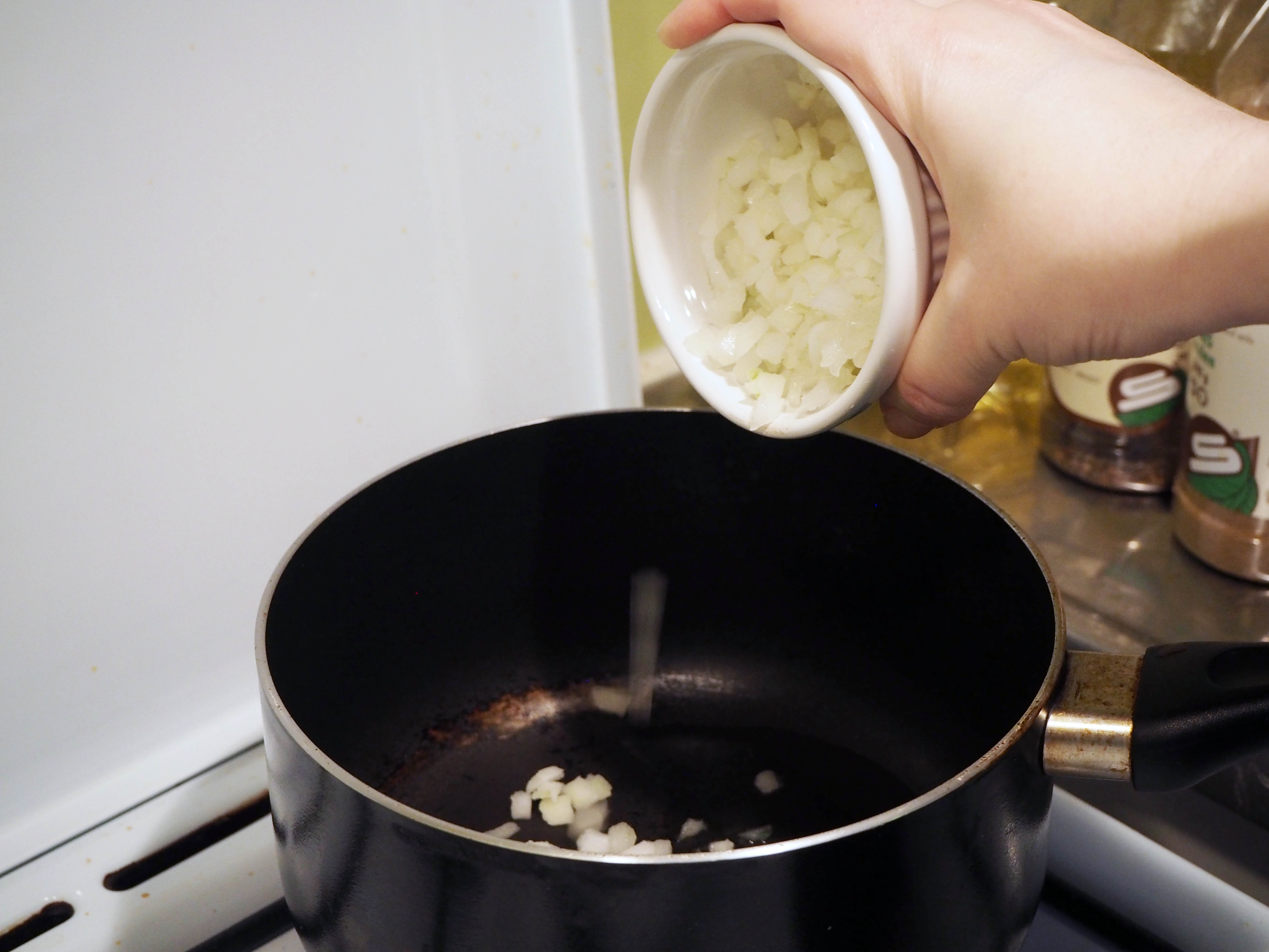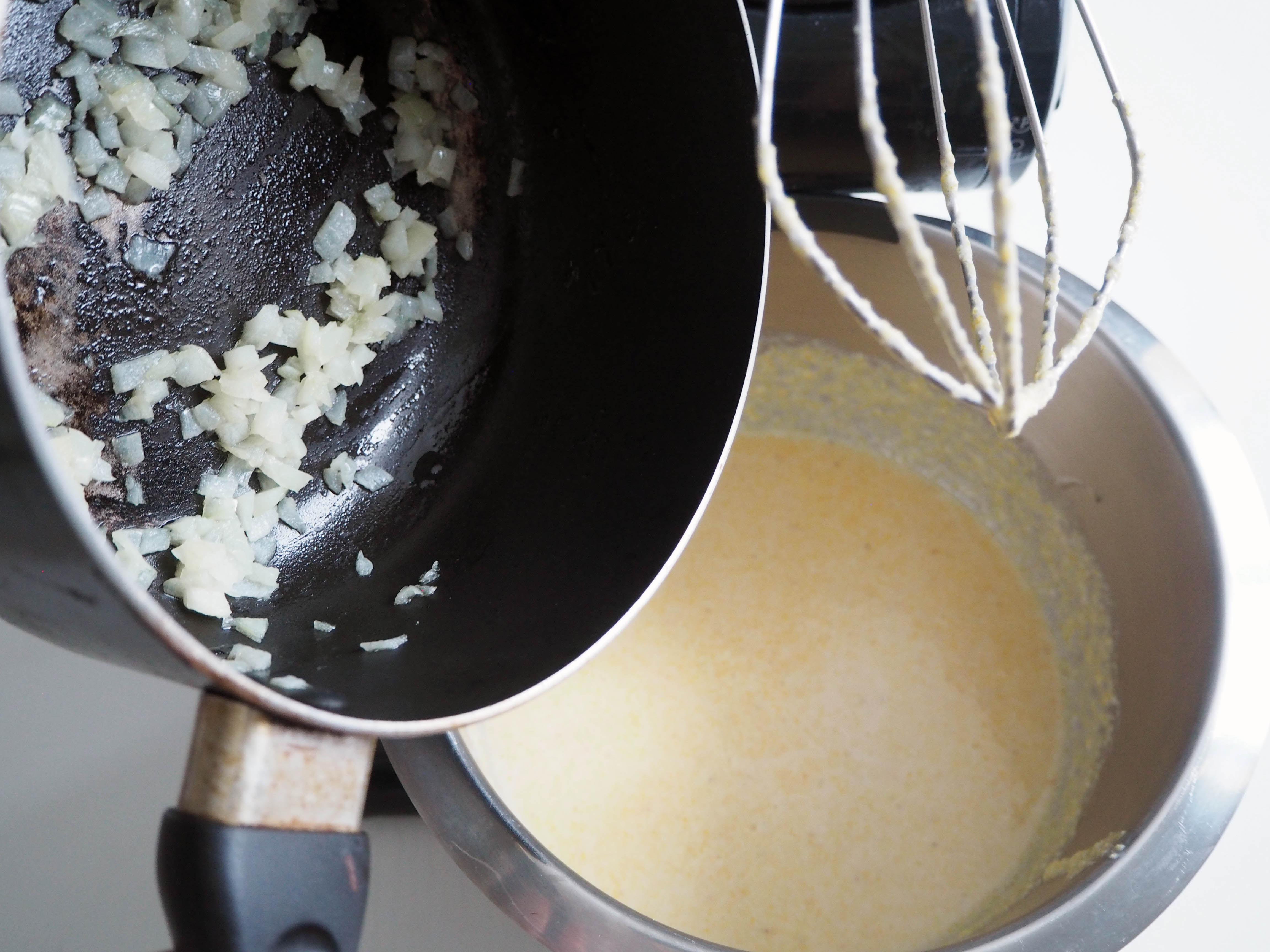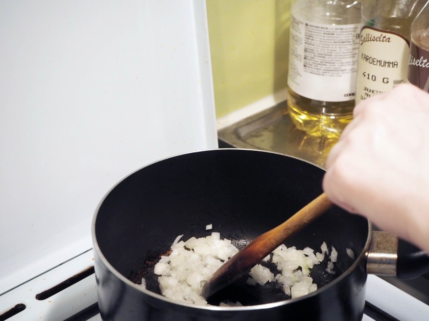 5. Put vegetable oil in a pan and warm in medium high heat. Add onions and saute the onions for about 5-6 minutes, until they are soft and translucent. Take away from the heat and let it cool a bit.