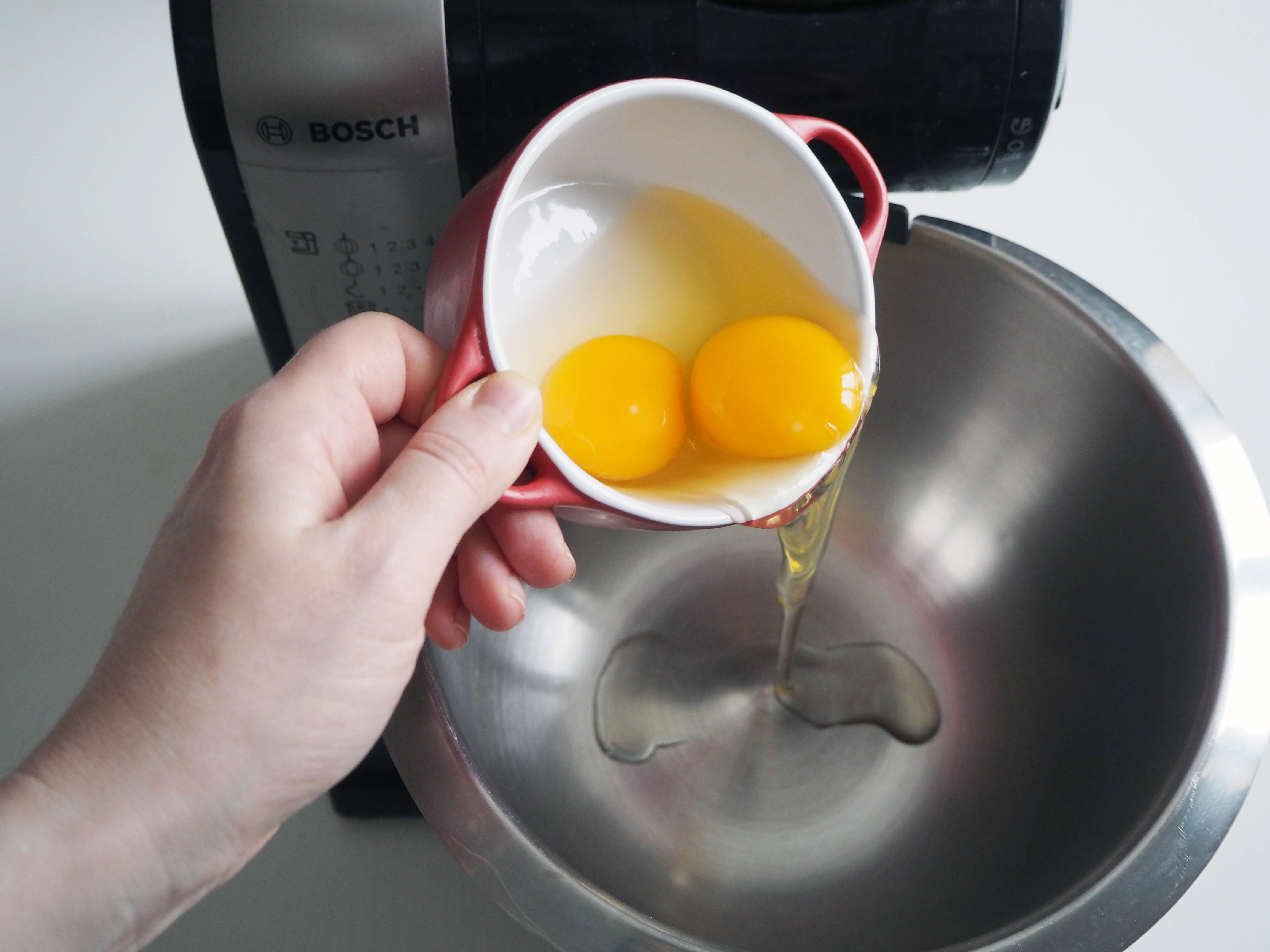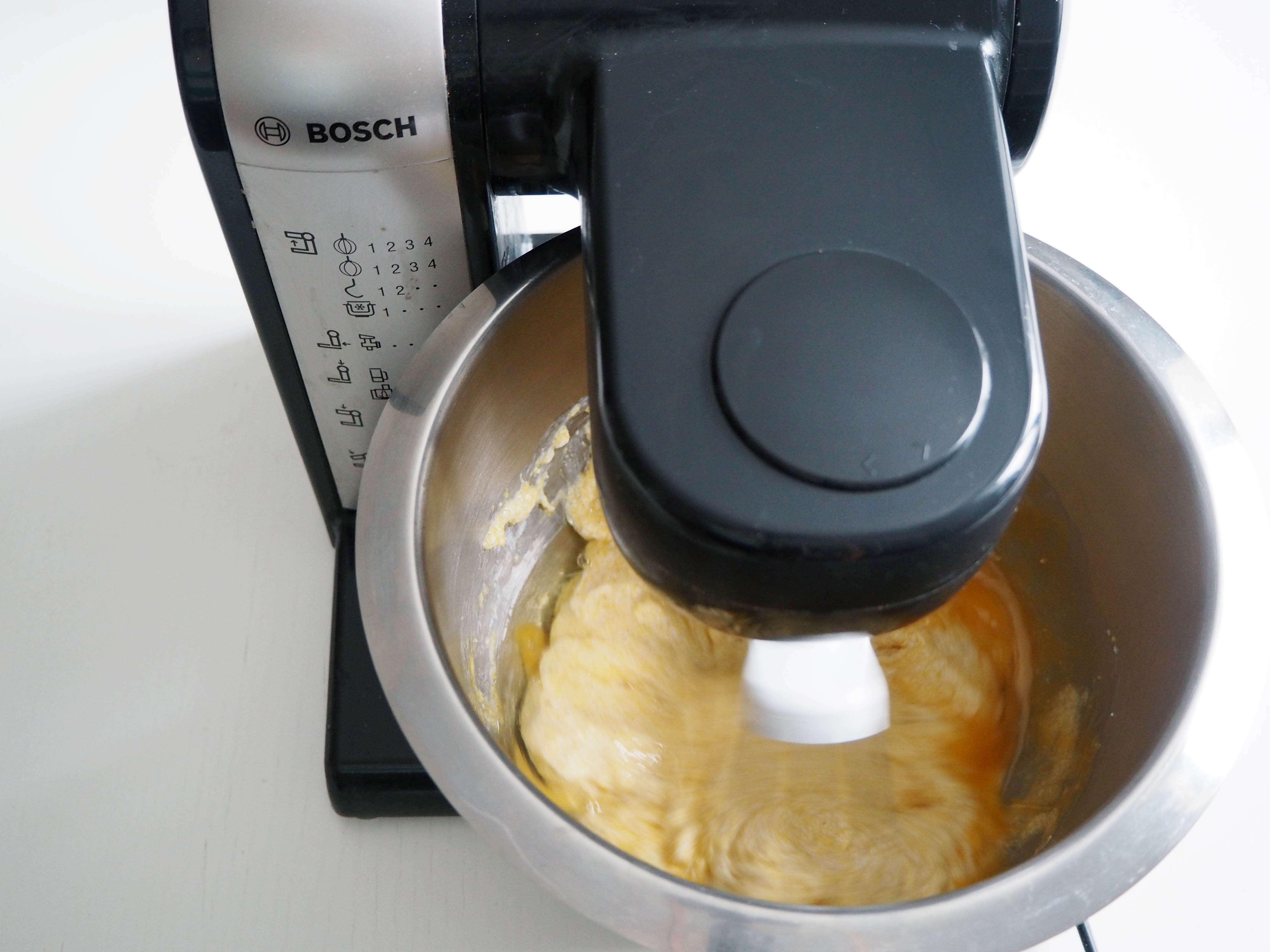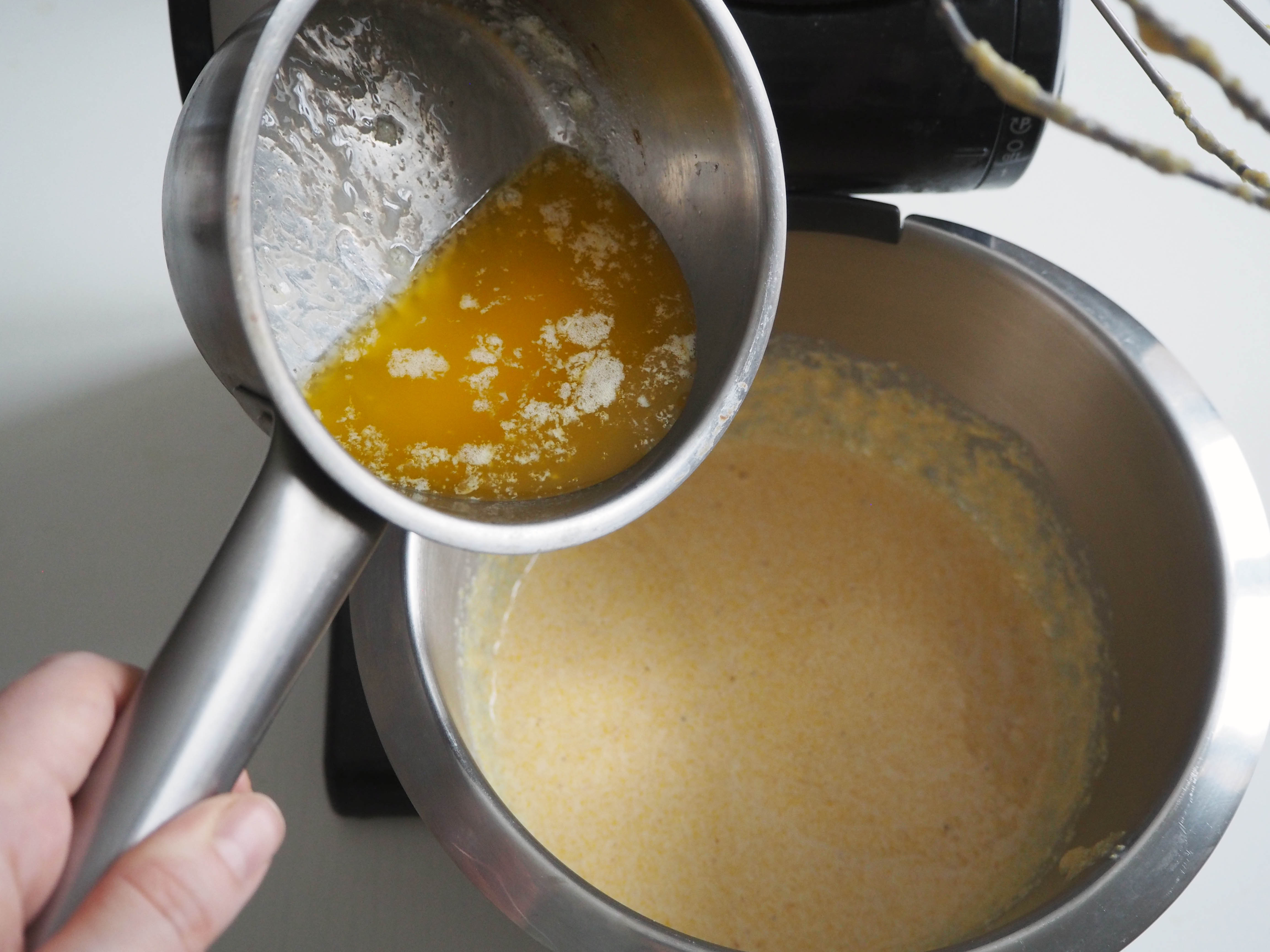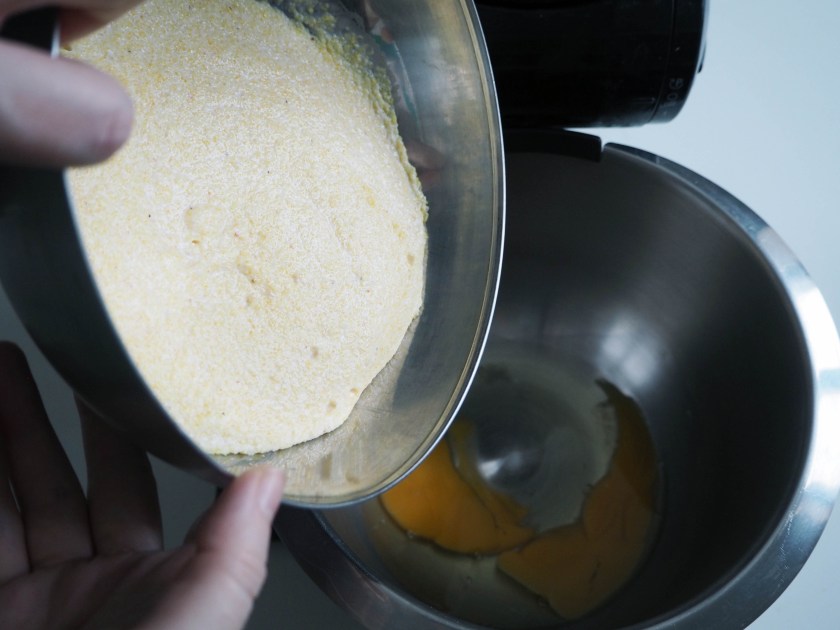 6. When 30 minutes pass after you make polenta mixture, in a mixing bowl, put eggs and the polenta mixture and beat until they are incorporated.