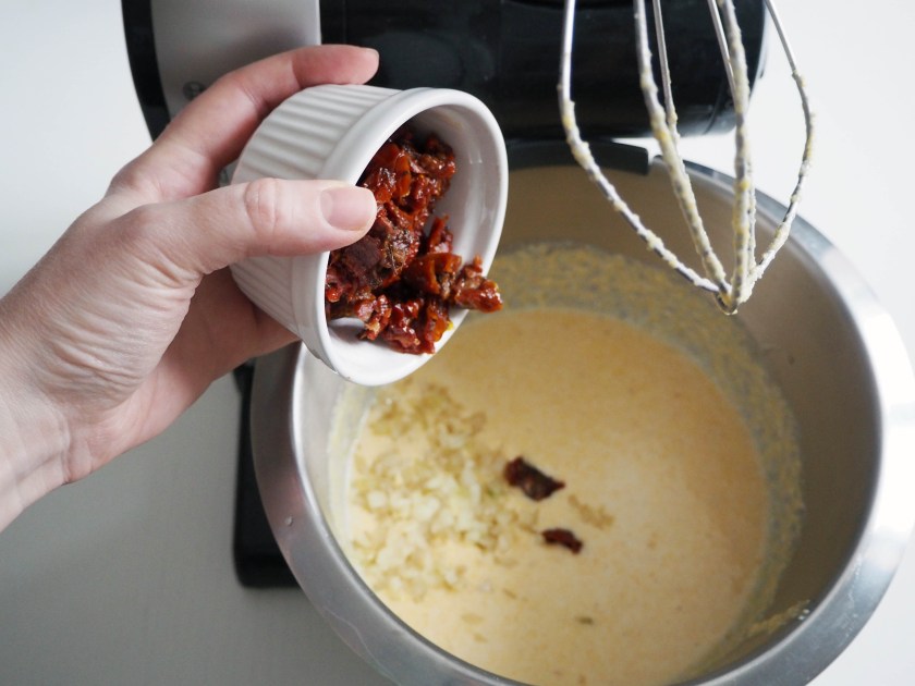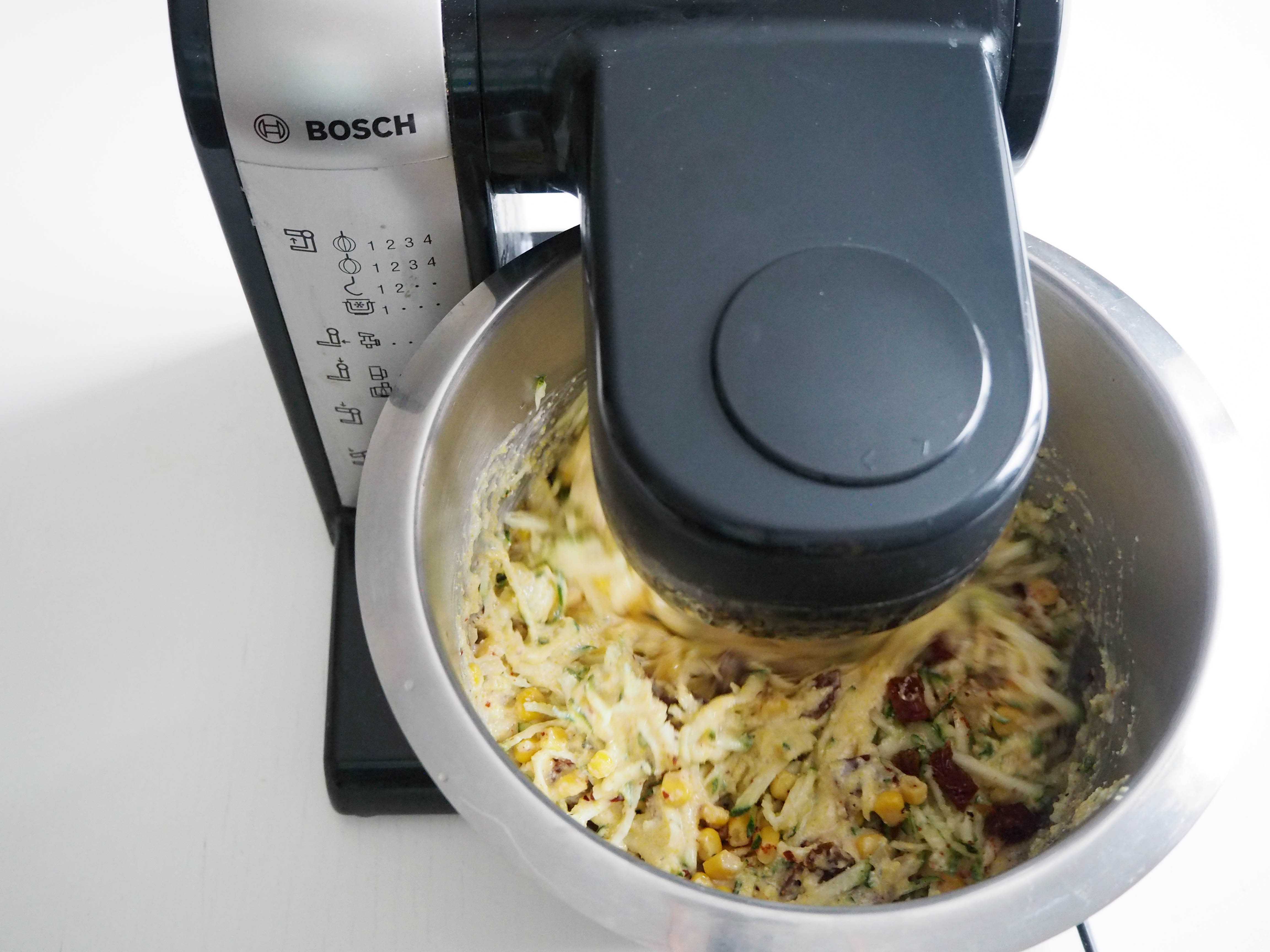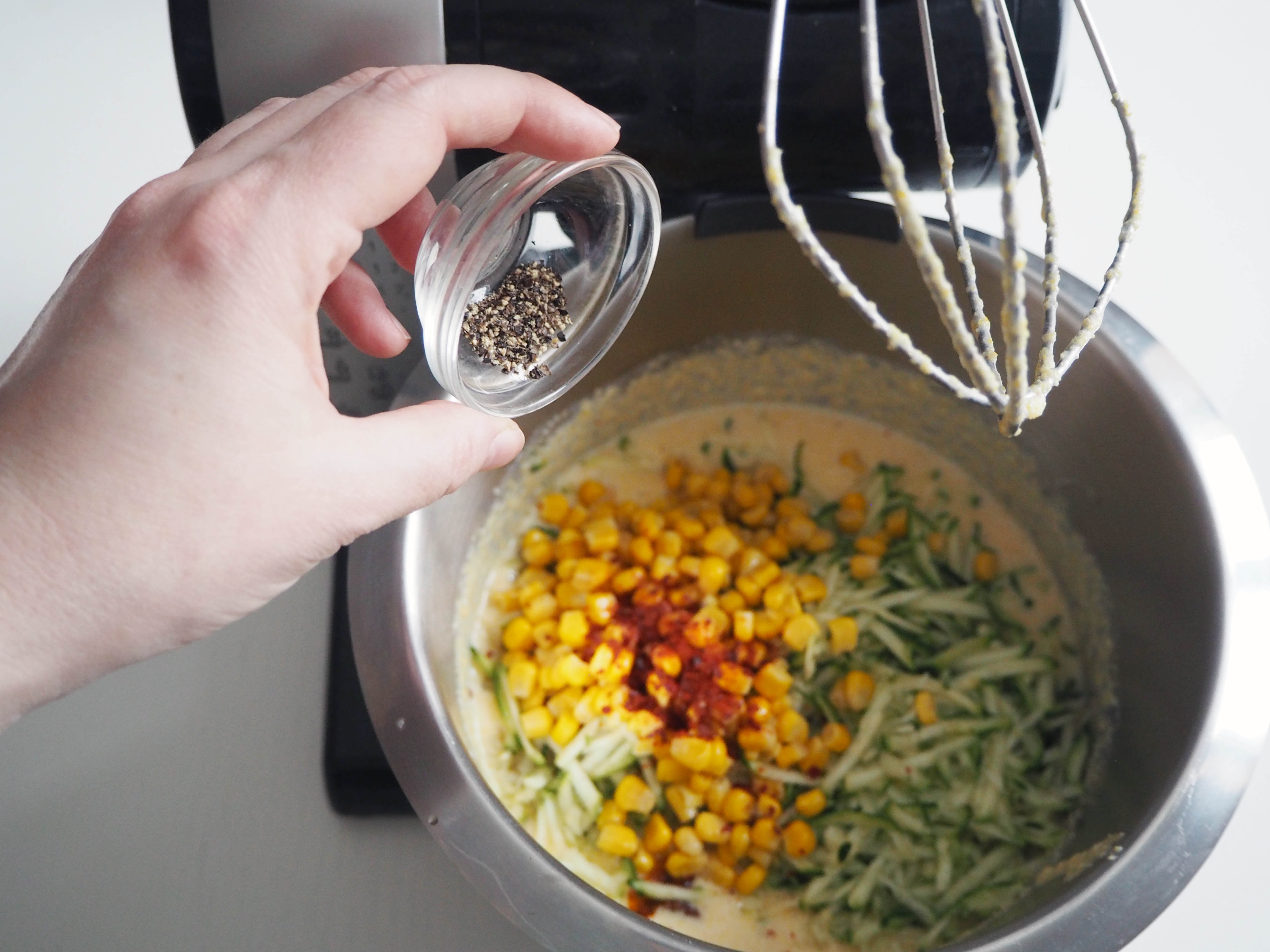 8. Add cooked and cooled onions, sun-dried tomatoes, zucchini, corn, red pepper flakes and black pepper and continue mixing until they are well mixed.