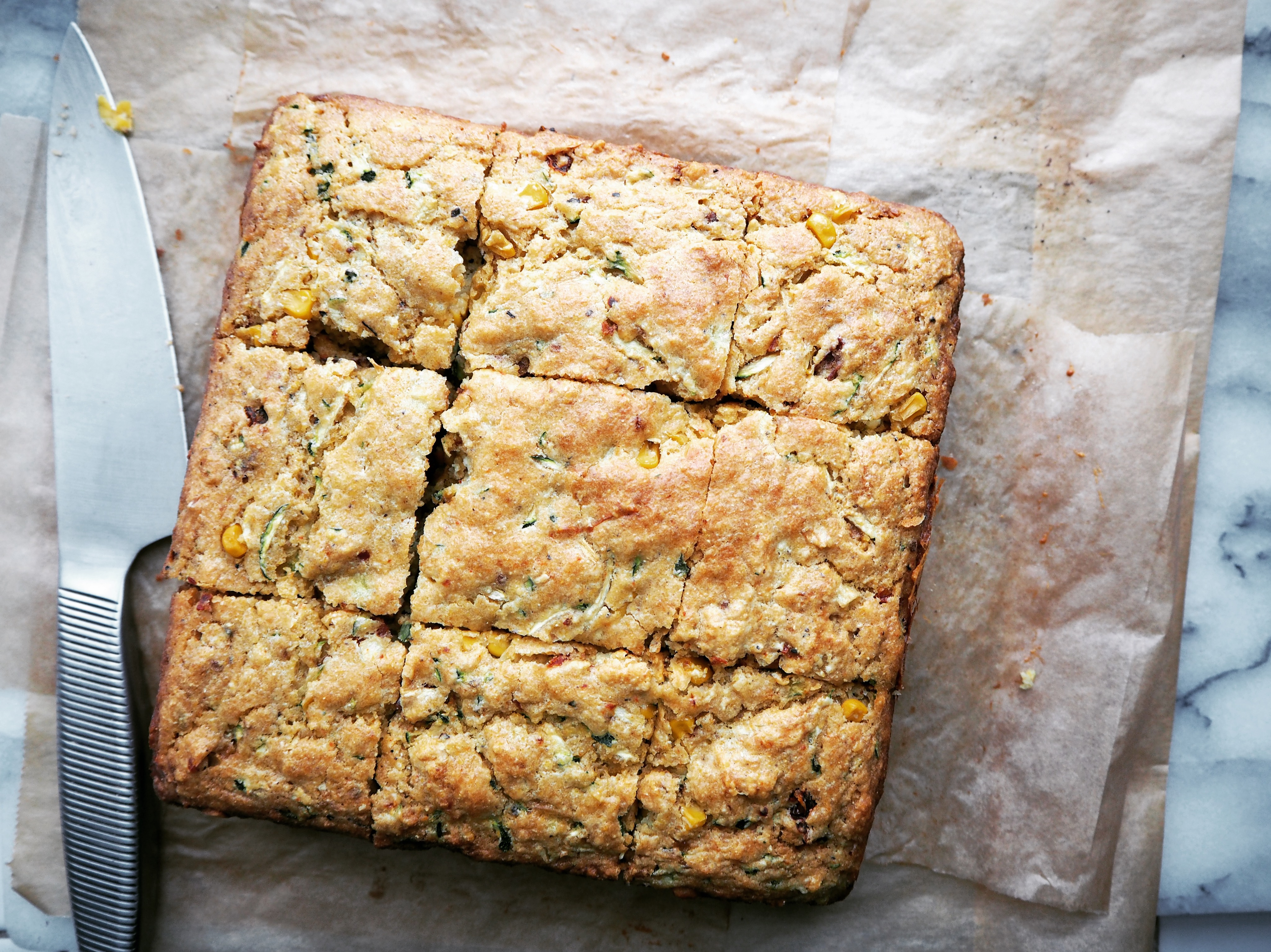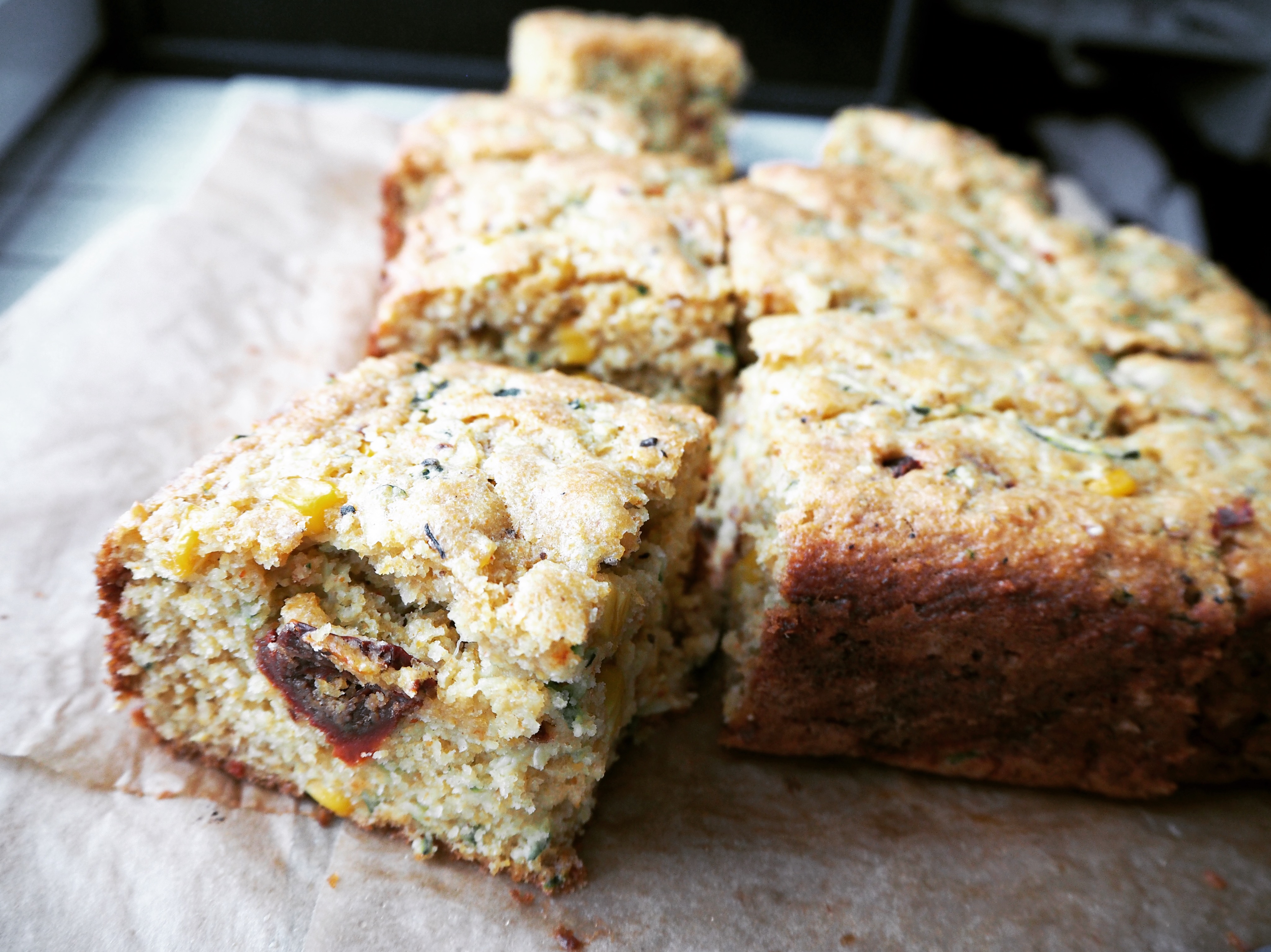 This is actually a mixture of bread and what I’d like to call a salty cake. It is fluffy and a bit crumbly. It has lots of ingredients from zucchini to sun-dried tomatoes. It uses a mixture of regular flour and polenta. These are a few parts of a typical salty cake recipe.
