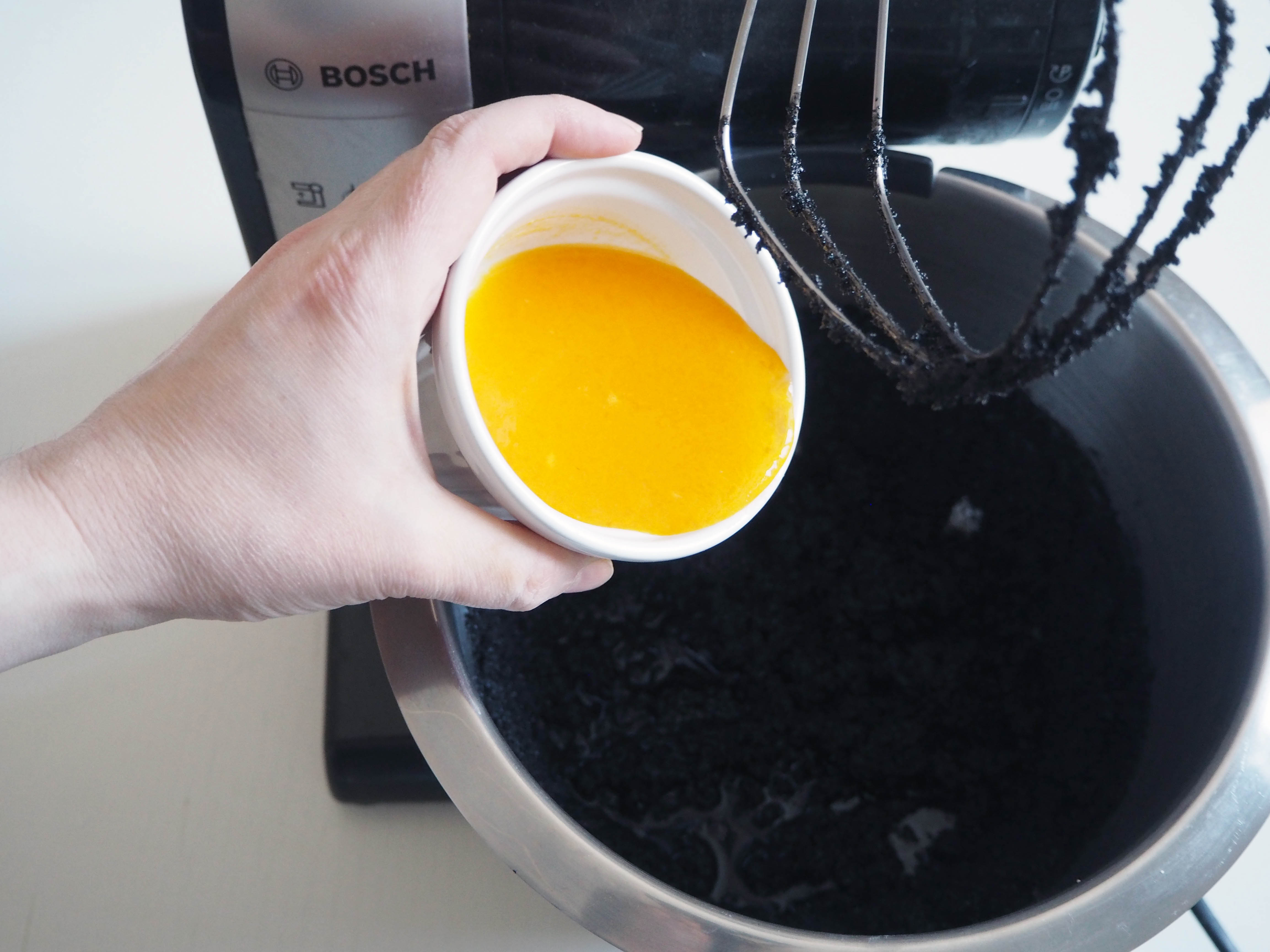 3. In the bowl of an electric mixer, put black tahini and sugar and beat until well combined.