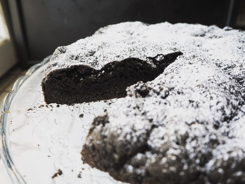 The cake gets harder and crustier the second day, while inside of it stays chewy. I liked eating my slice by dipping into fresh tea, like a biscuit! But you can just eat with some coffee and tea without dipping as well, of course! Enjoy your slightly weird coloured new cake!