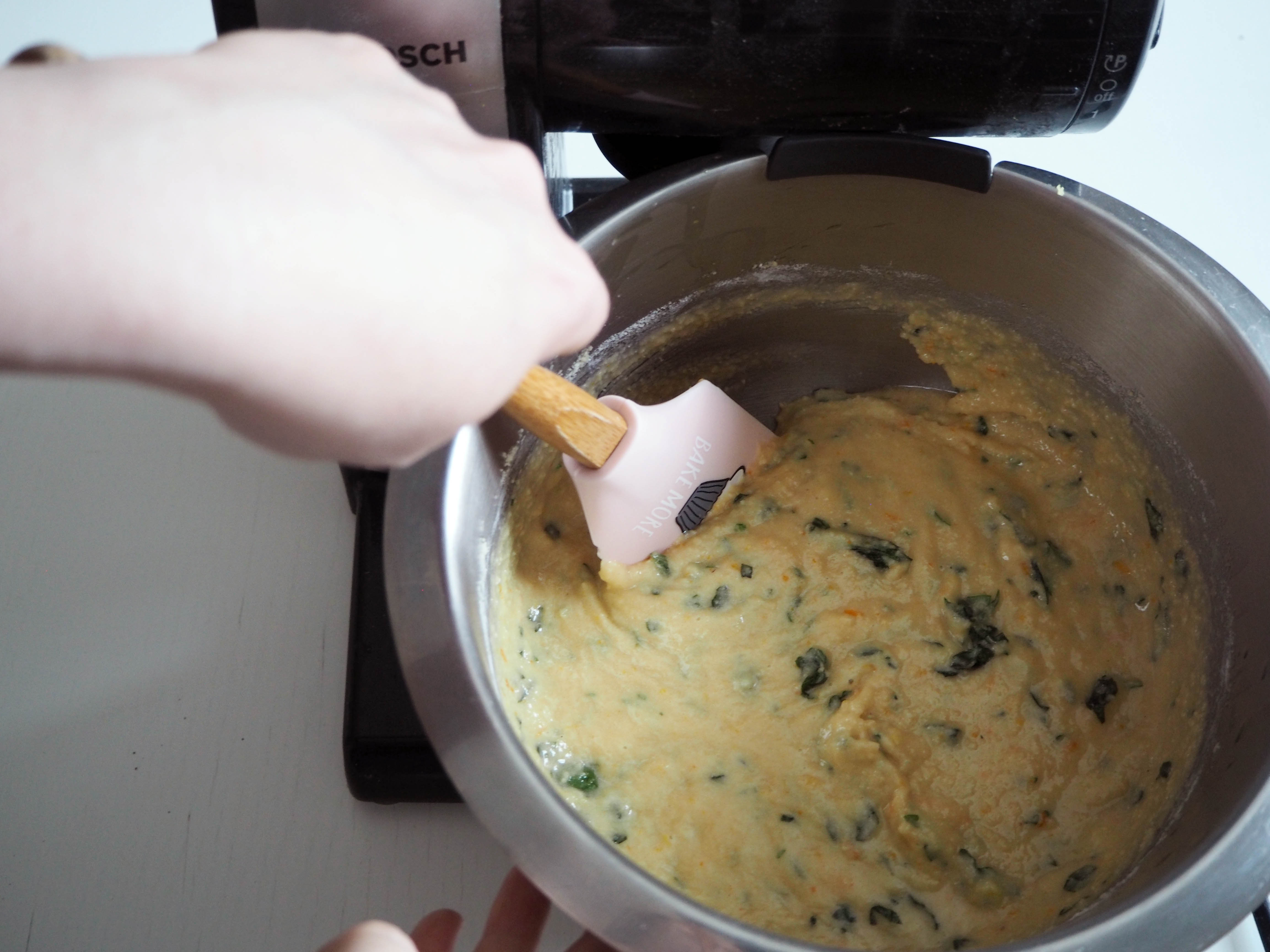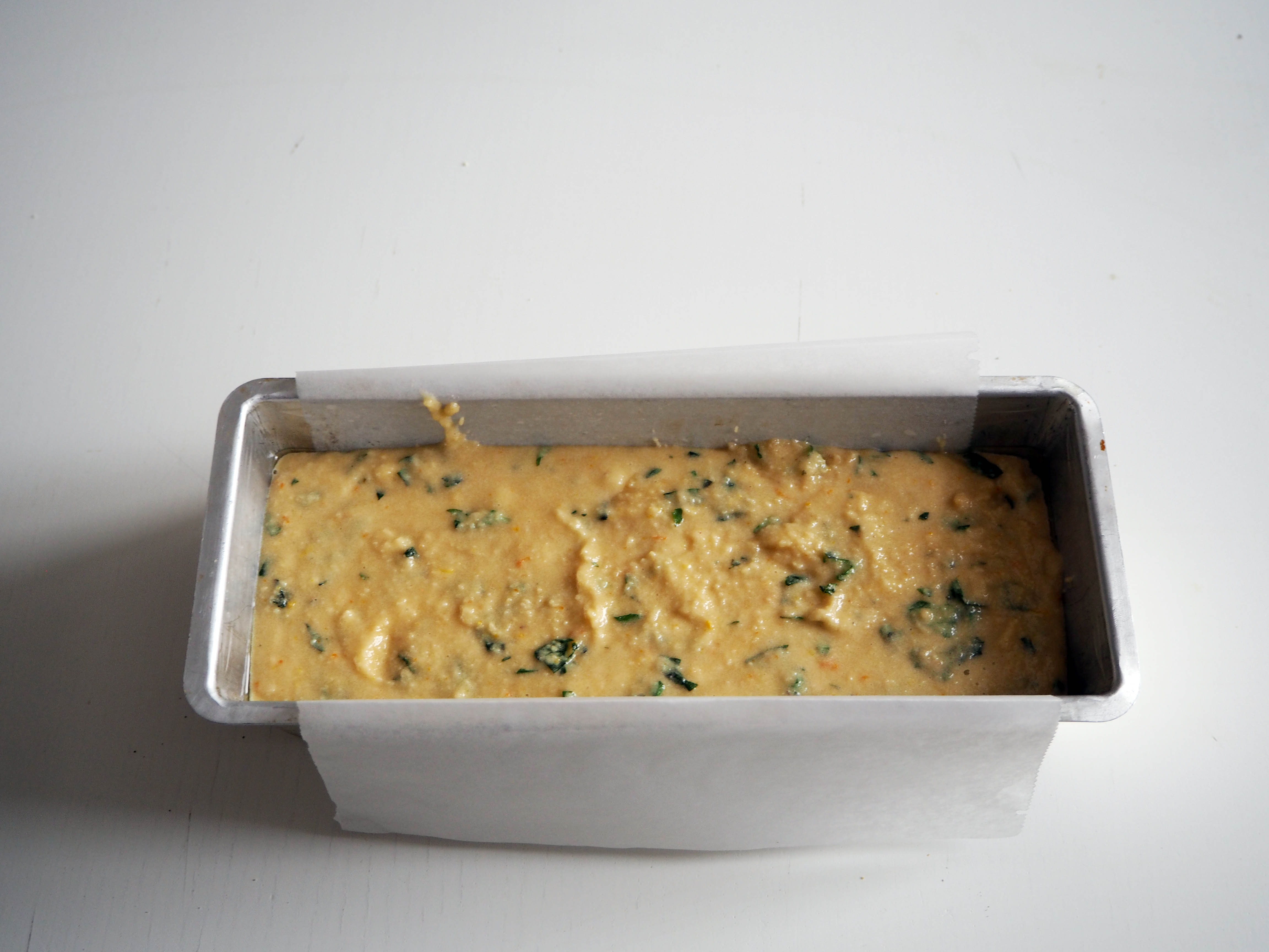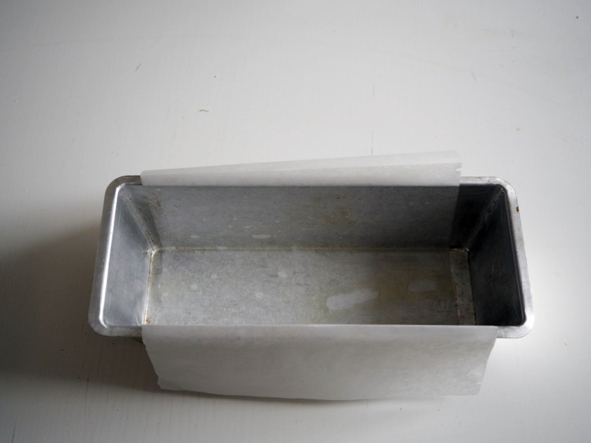 1. Preheat the oven to 180C. Grease a 22x9cm loaf pan and put a baking paper covering the bottom and sides (two large sides are enough).