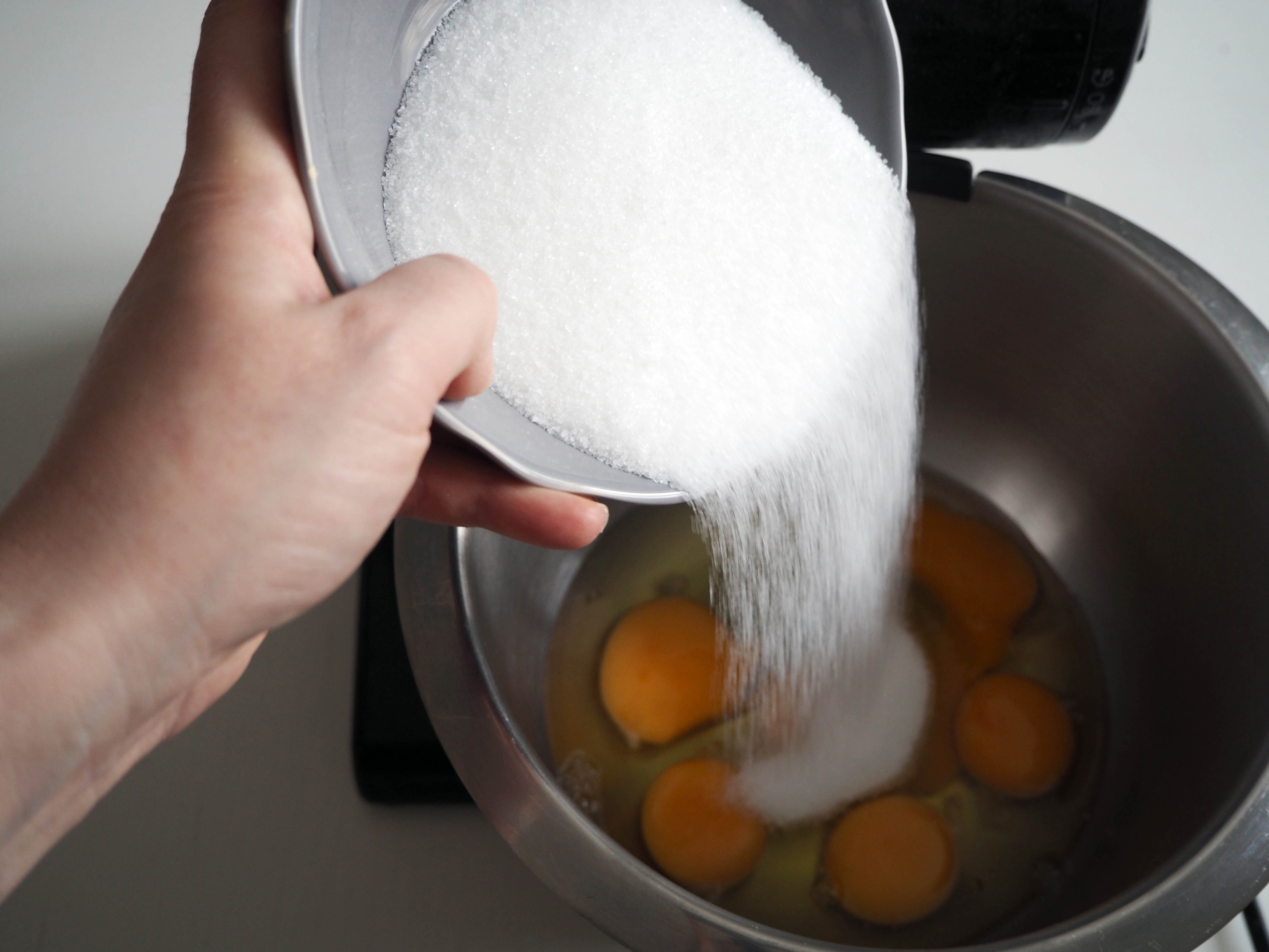 2. In the bowl of an electric mixer, put eggs and sugar and beat until light and fluffy in medium high speed, for about 5 minutes.