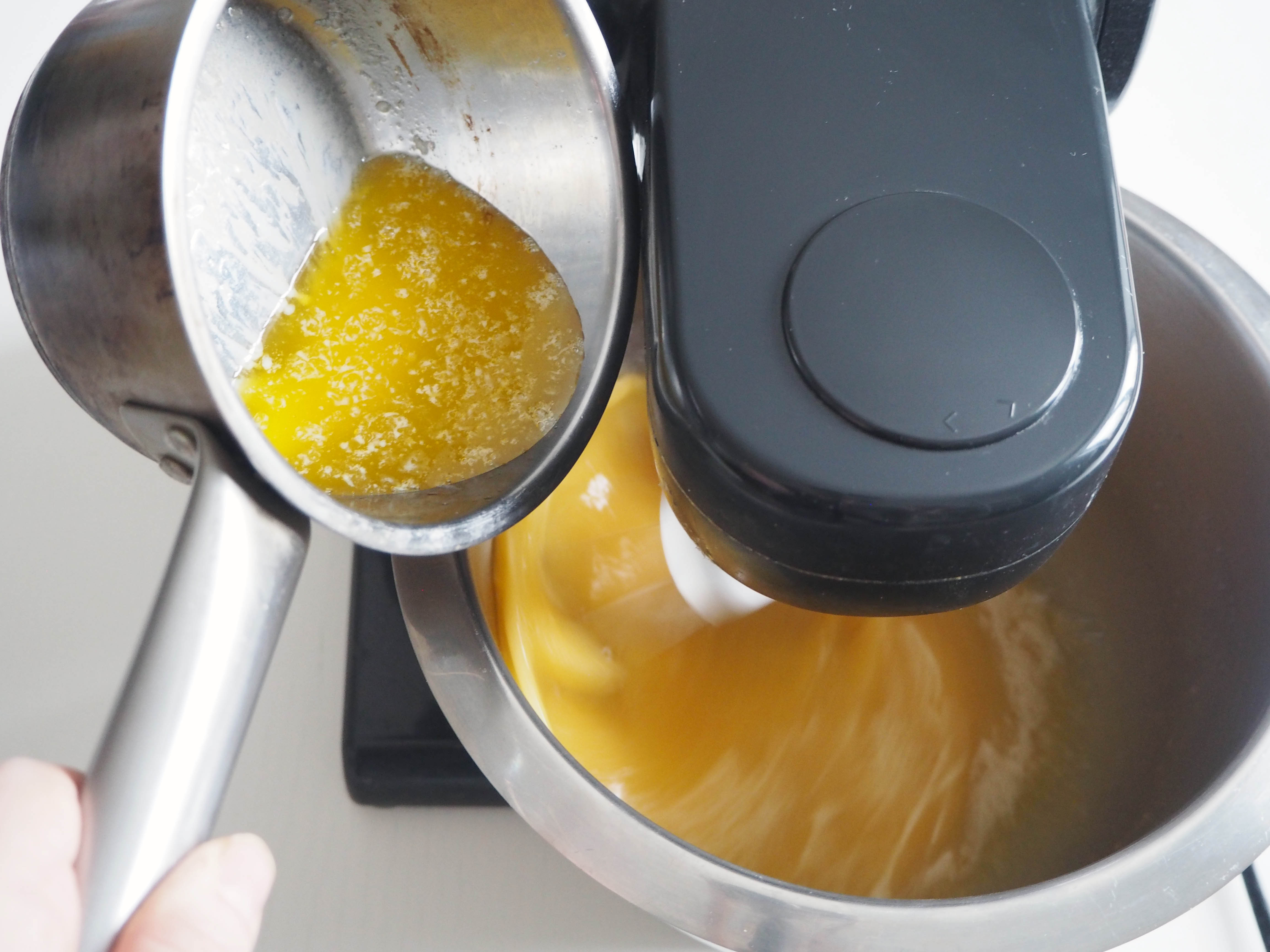 3. Add melted and cooled butter while the mixer is still on and beat until incorporated.