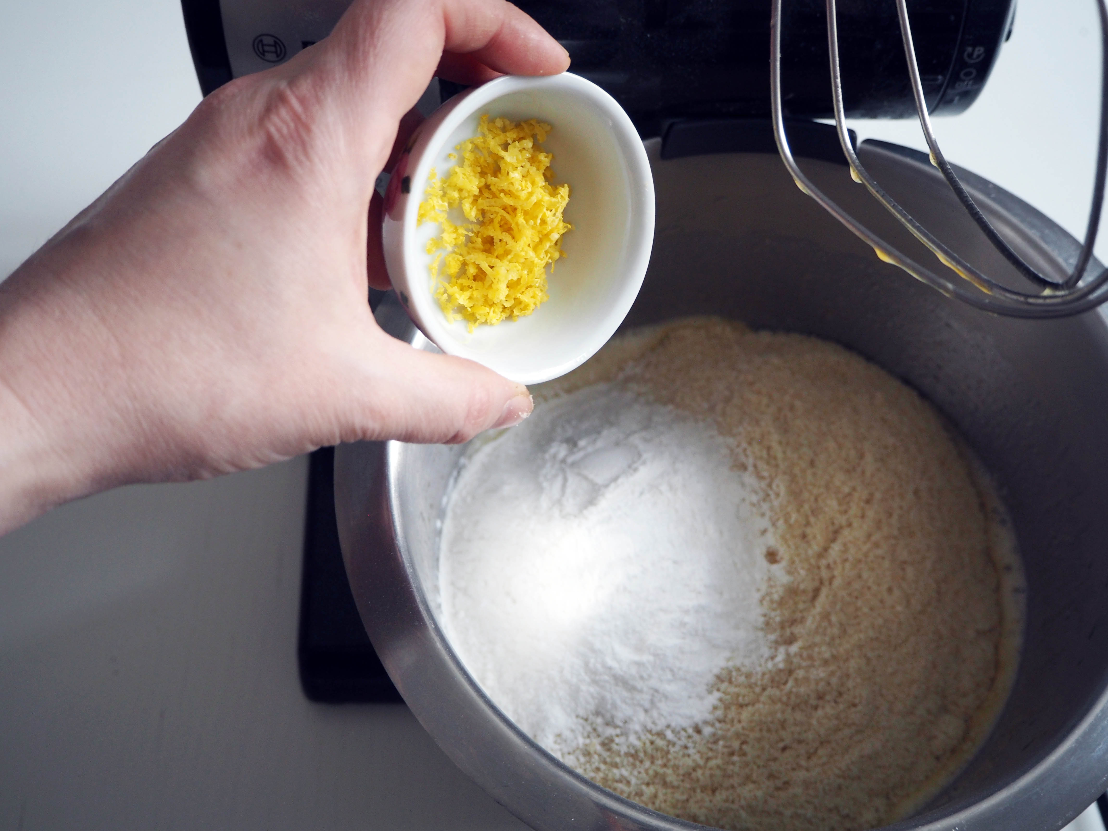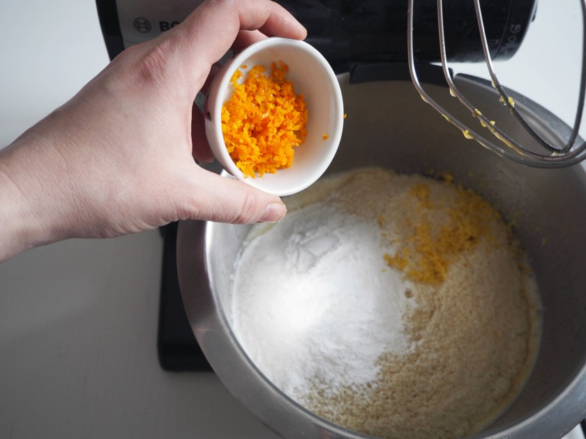 4. Add the rest of the ingredients (almond flour, rice flour, baking powder, lemon zest, orange zest and basil) and beat in medium speed until all dry ingredients are well mixed with wet ones.