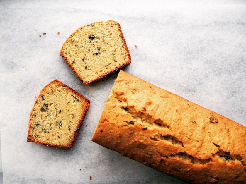I didn’t twist the original recipe much this time, just increased the amount of basil slightly. But I changed the way of preparing the cake batter significantly. In this way, I got a firmer cake with a better structure. I also skipped the icing on top entirely because I had some pretty beautiful cracks on top of the cake and I didn’t want to hide them. Besides, I found a cake full of lovely fresh ingredients even fresher when it’s left this way, without an icing that is.